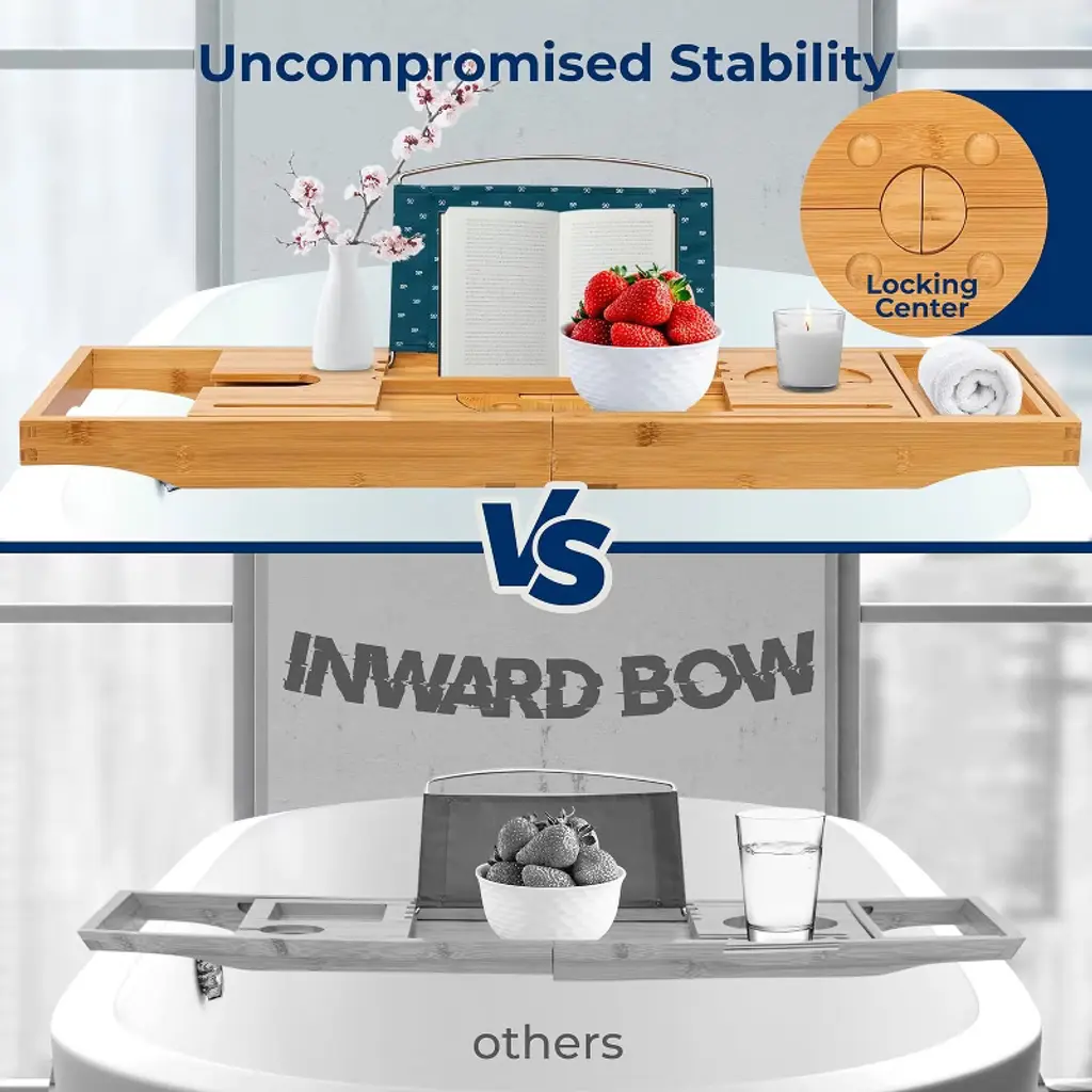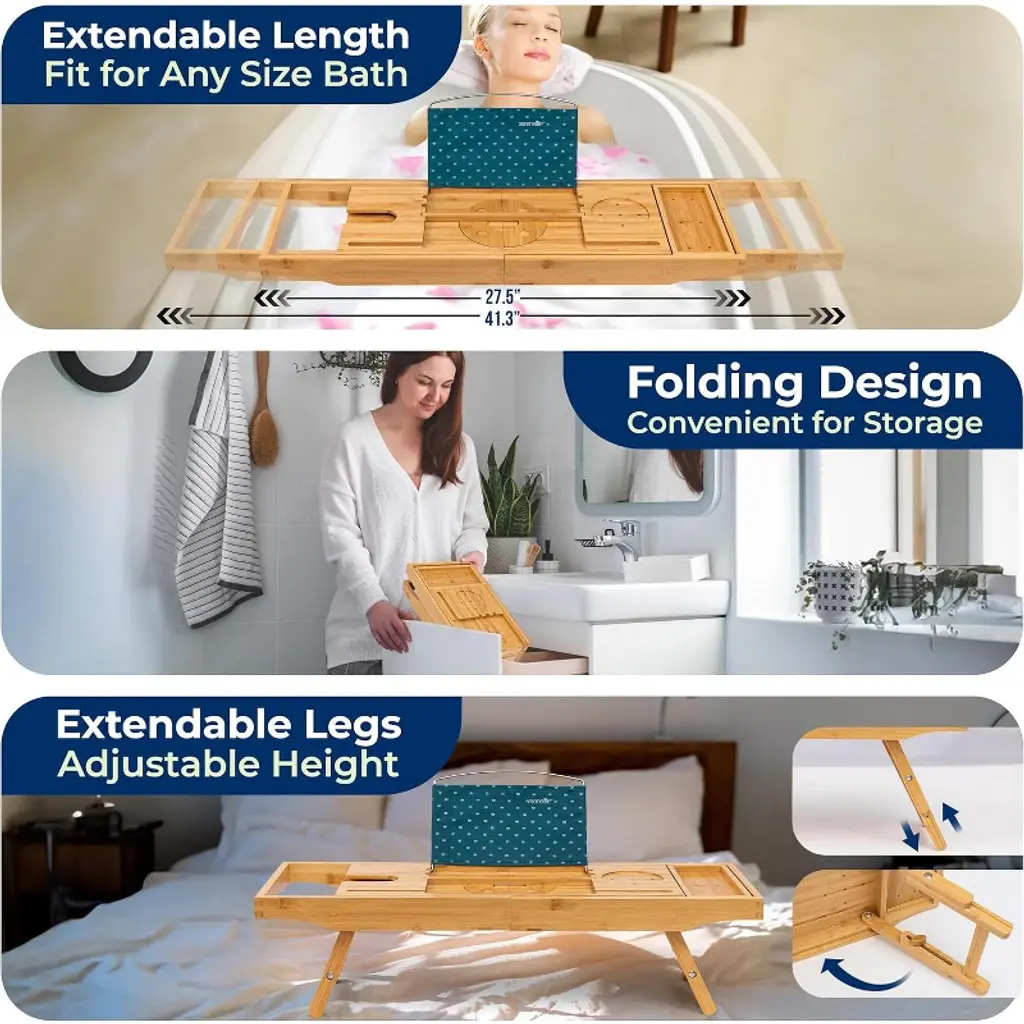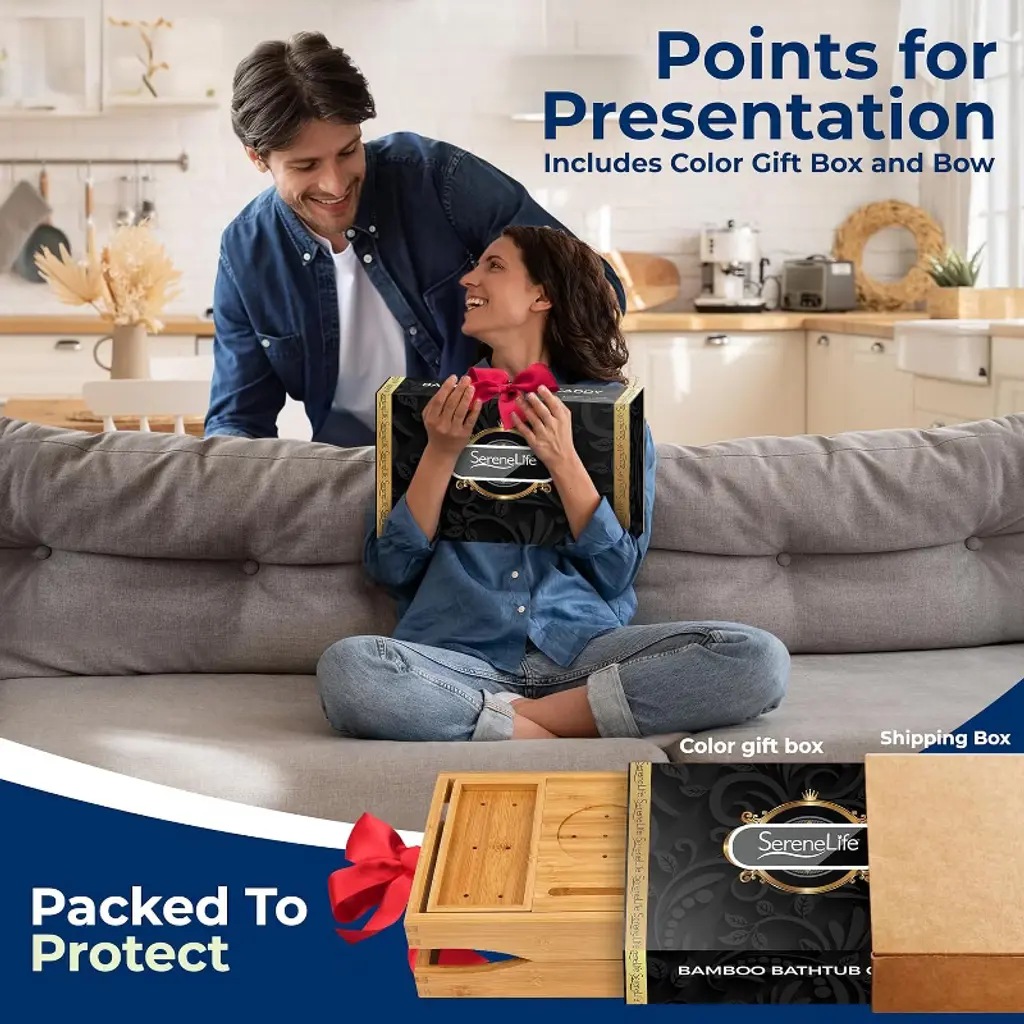 The SereneLife Bamboo Bathtub Caddy offers an elegant and practical solution for your bath time relaxation. Made from 100% natural bamboo, this caddy is designed to fit tubs up to 43 inches wide with adjustable slide-out arms. The lacquer-coated bamboo construction ensures long-lasting durability while being naturally waterproof and resistant to mold and mildew. The caddy features ergonomically designed grooves for holding wine glasses and candles, as well as an integrated holder for your smartphone, tablet, or book. It also includes removable trays for your bath essentials and a bamboo soap box. Whether you're enjoying a bath or using it as a laptop or bed tray, this versatile caddy is perfect for a relaxing experience.
