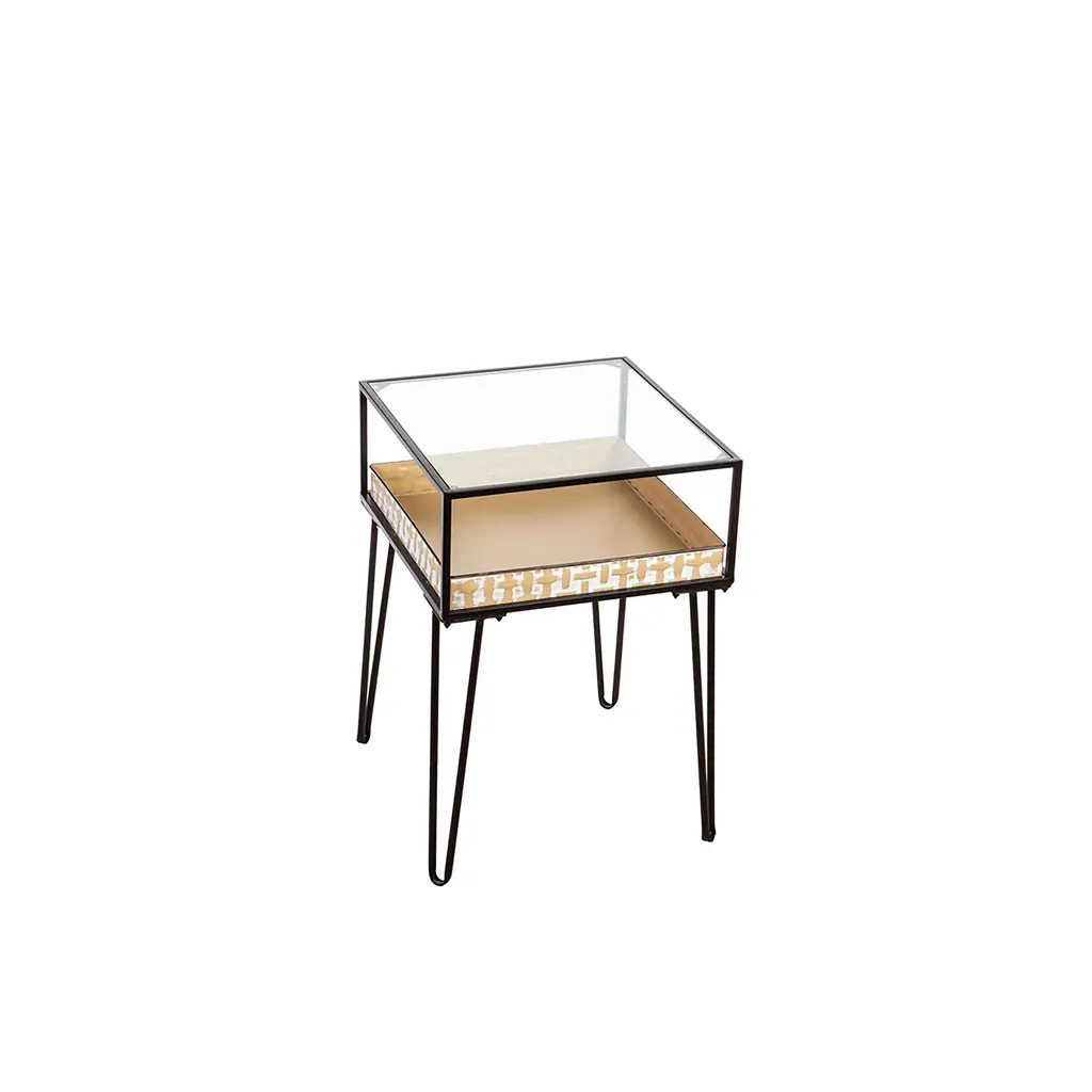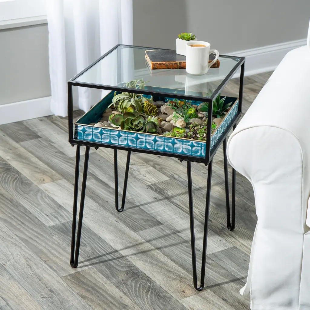 Create a unique, thriving display with this Side Table with Glass Top and Golden Planter Tray. With its distressed gold planter dish, this table is a stylish way to display plants and table décor. The glass top allows for easy visibility of plants while placing knickknacks, pictures, and other items on top. Simply set your greenery inside the dish and embellish with rocks or leave it unadorned. Set the beveled tempered glass top back into place and you’re done! The sides remain open for easy watering and airflow. Made from metal and glass, this table will last season after season. This decorative table works well as an end table but can also go on a covered porch or patio. Planter tray features a sealed bottom; plants not included.