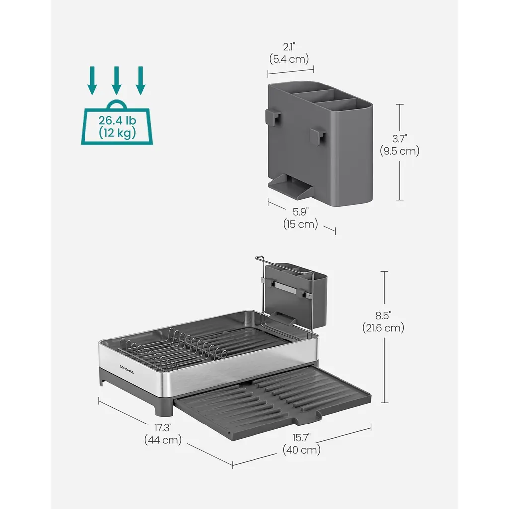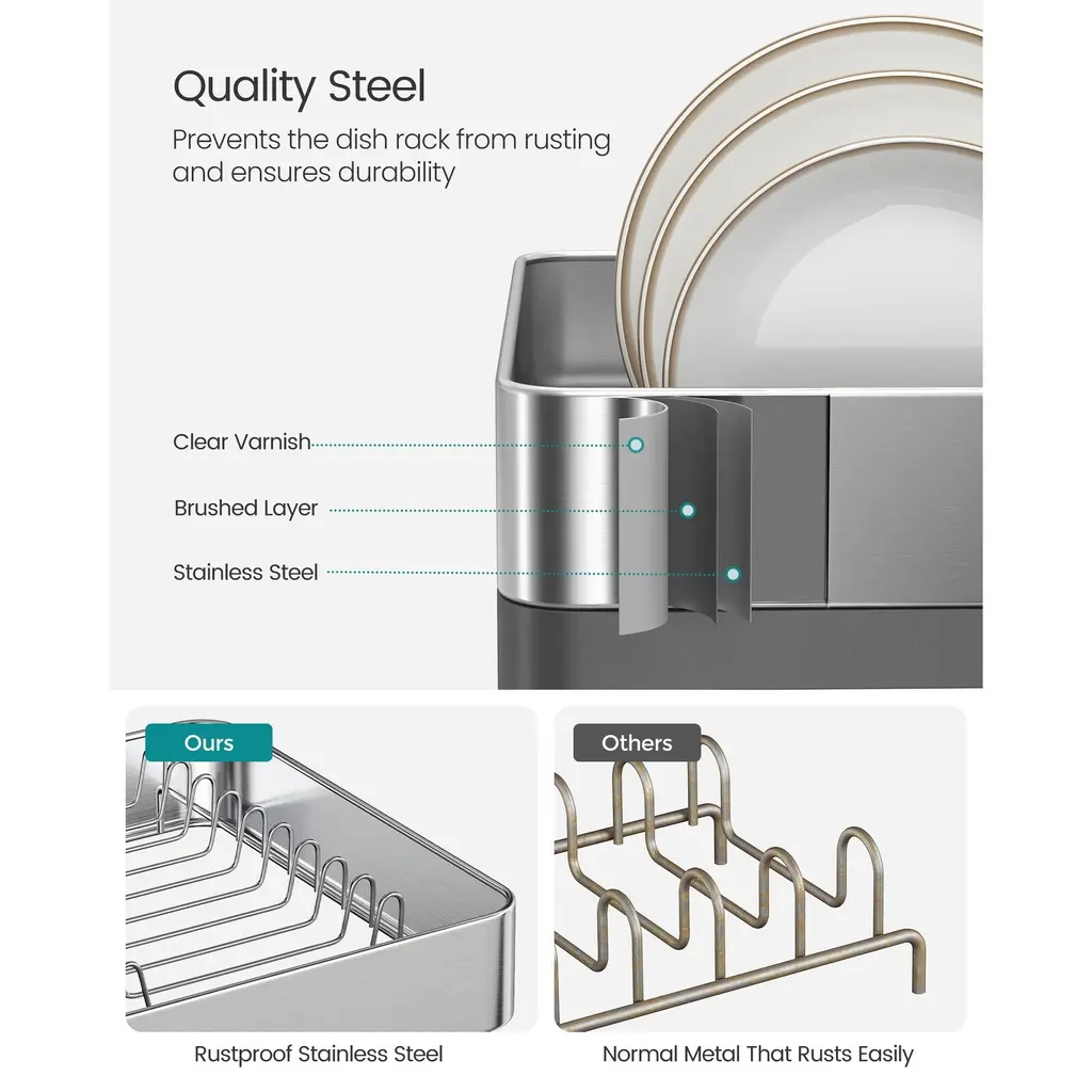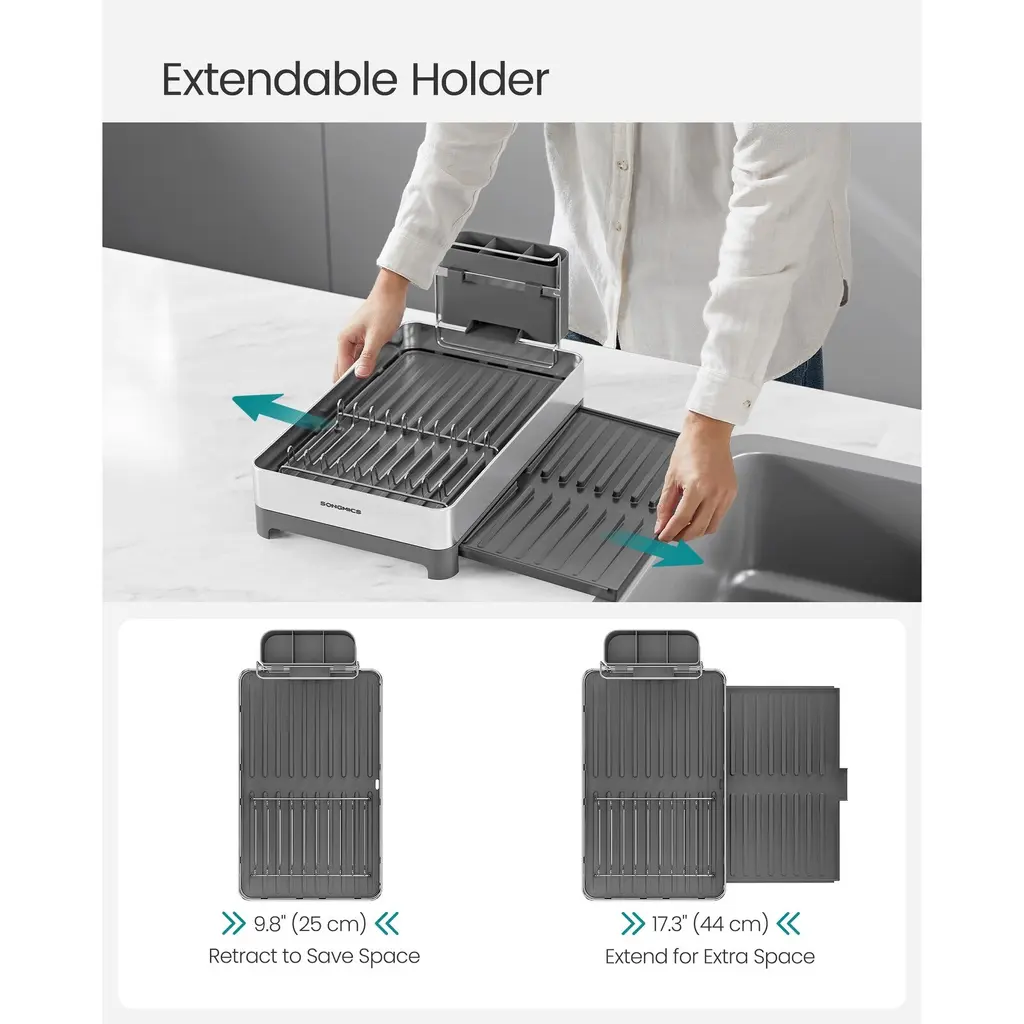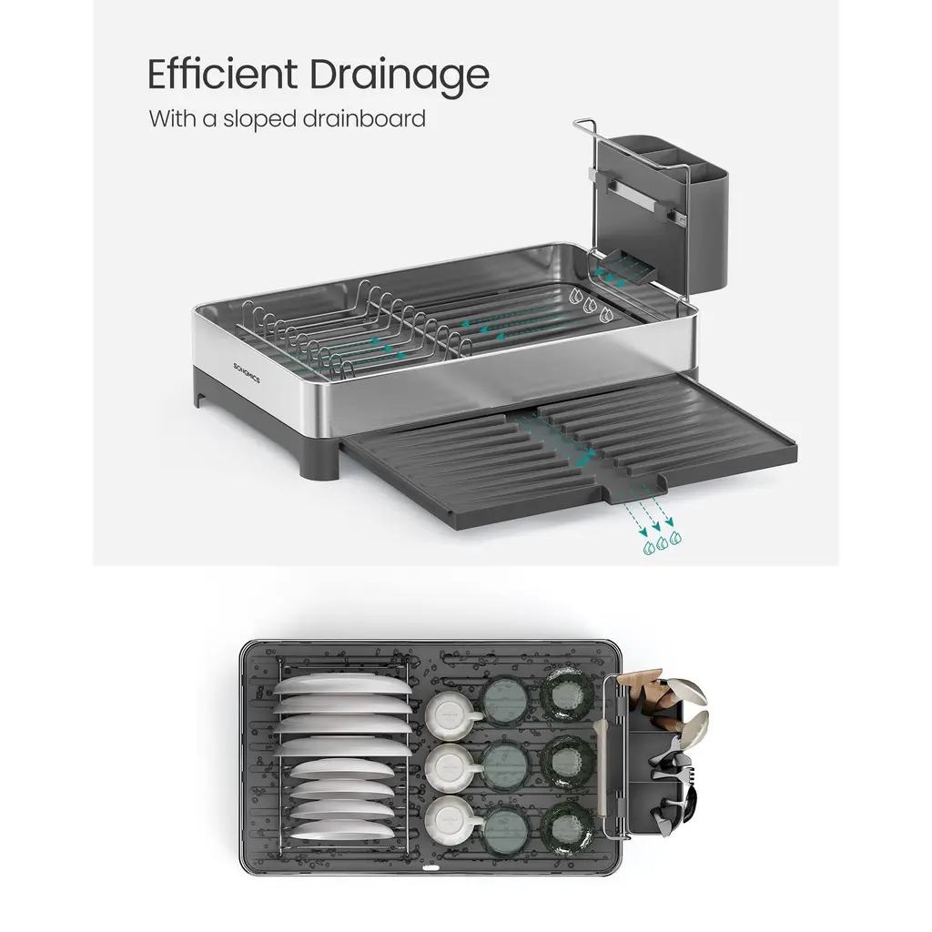 Specifications:Description:This sturdy dish drying rack is made from durable stainless steel that resists corrosion and rust, ensuring long-lasting use while supporting up to 48.5 pounds for your plates, bowls, and cups. Featuring a spacious two-tier design, it can accommodate multiple bowls, cups, plates, and a dishcloth simultaneously, along with a three-slot utensil holder that holds over 25 utensils to keep your kitchen countertop clutter-free. Its intelligently designed sloped drainboard with grooves directs water efficiently into the sink through a convenient drain spout, maintaining a dry and clean surface. Additionally, the rack includes a pull-out tray that expands when extra space is needed and retracts to save room when not in use, offering versatile storage options. Quick and simple assembly in just a few steps makes this dish rack a practical and efficient addition to any kitchen setup.Key Features: