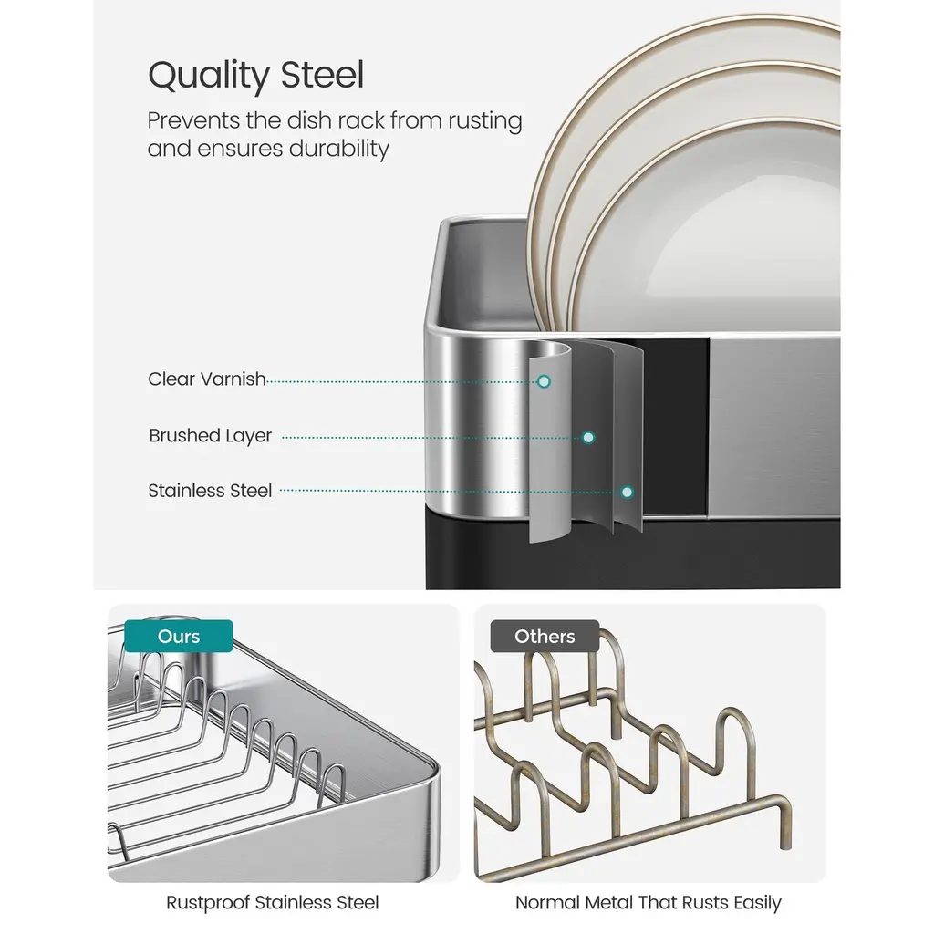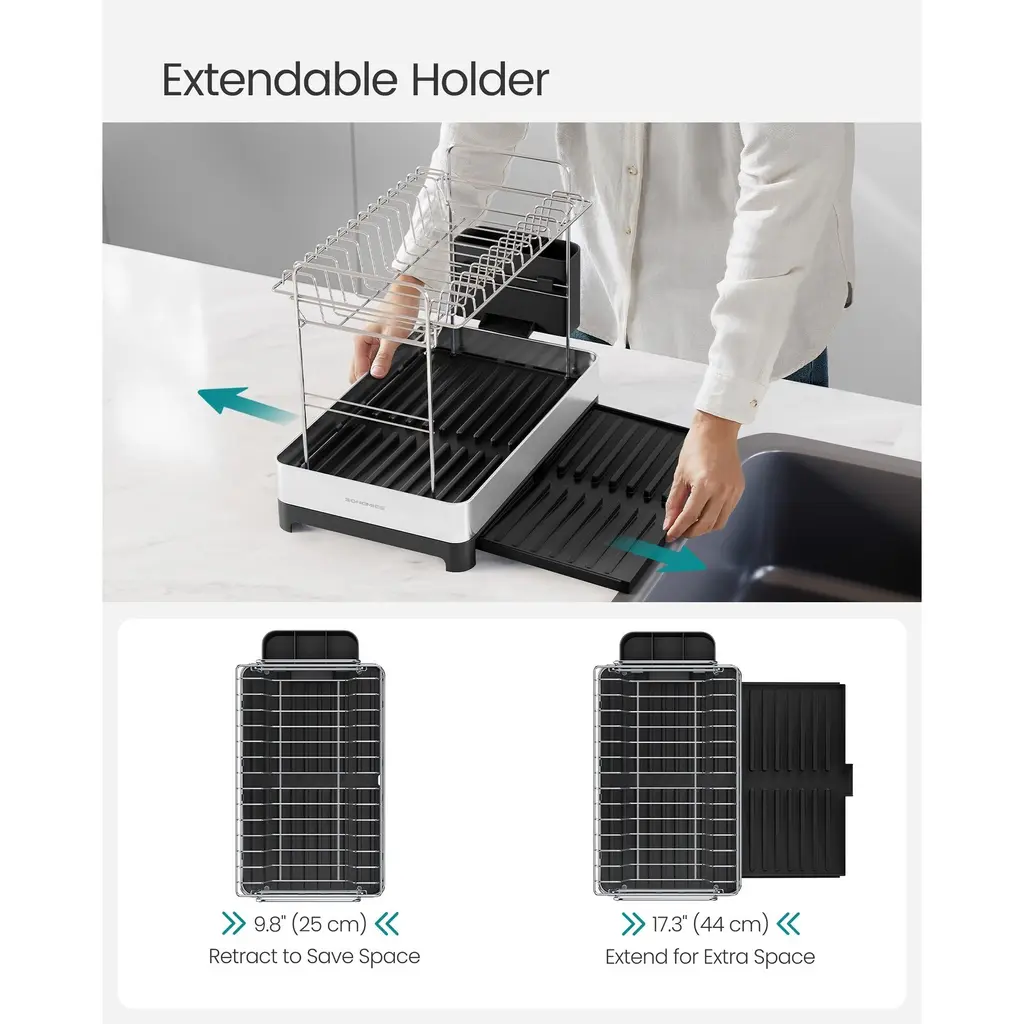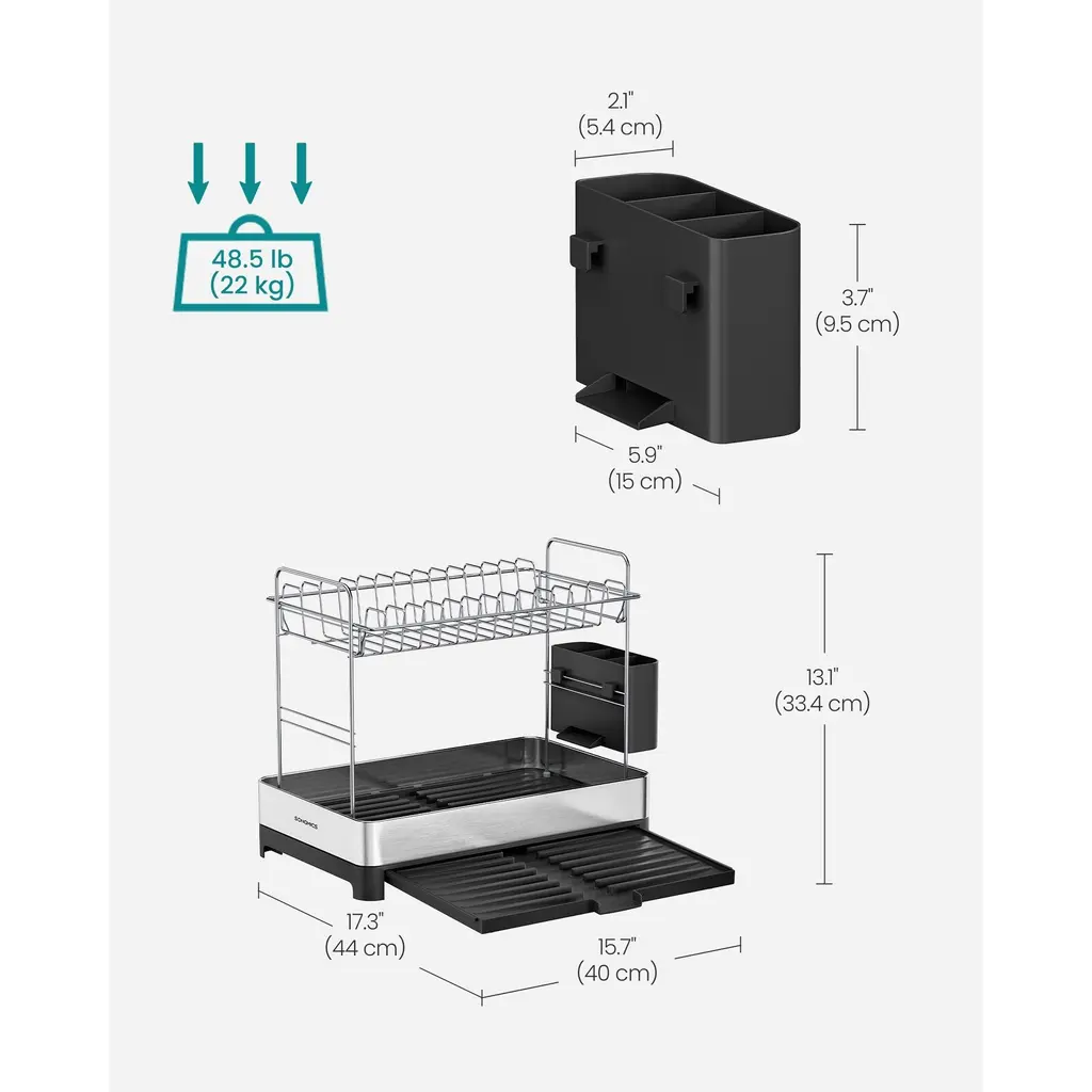 Specifications:Description:This sturdy dish drying rack is made from durable stainless steel that resists corrosion and rust, ensuring long-lasting use while supporting up to 48.5 pounds for your plates, bowls, and cups. Featuring a spacious two-tier design, it can accommodate multiple bowls, cups, plates, and a dishcloth simultaneously, along with a three-slot utensil holder that holds over 25 utensils to keep your kitchen countertop clutter-free. Its intelligently designed sloped drainboard with grooves directs water efficiently into the sink through a convenient drain spout, maintaining a dry and clean surface. Additionally, the rack includes a pull-out tray that expands when extra space is needed and retracts to save room when not in use, offering versatile storage options. Quick and simple assembly in just a few steps makes this dish rack a practical and efficient addition to any kitchen setup.Key Features: