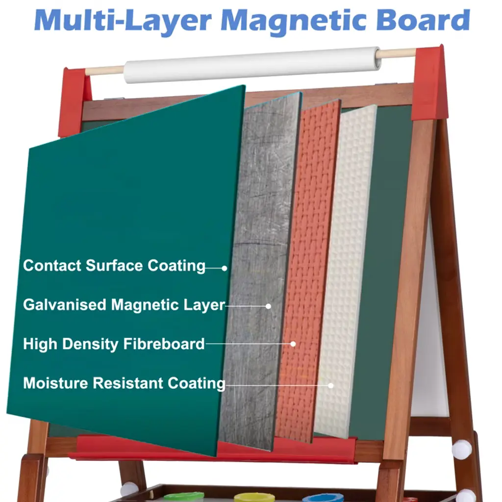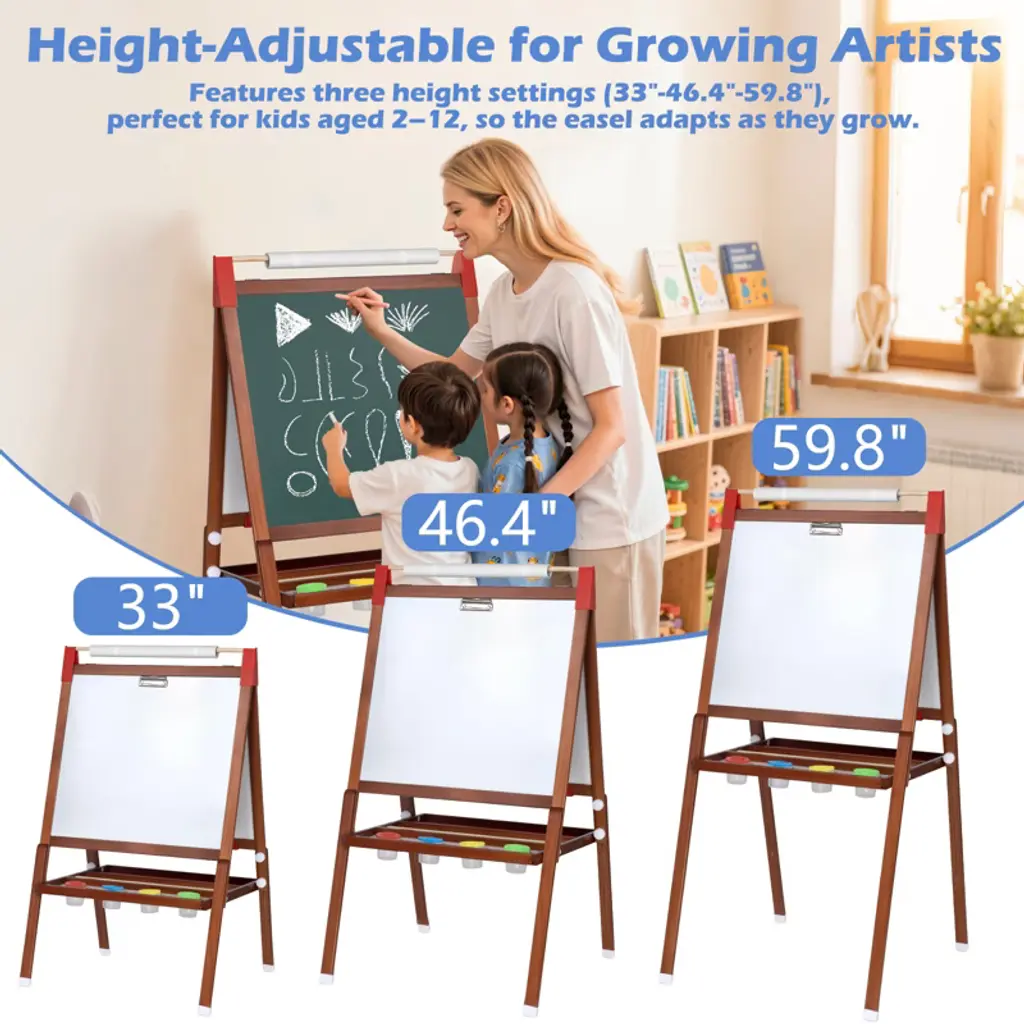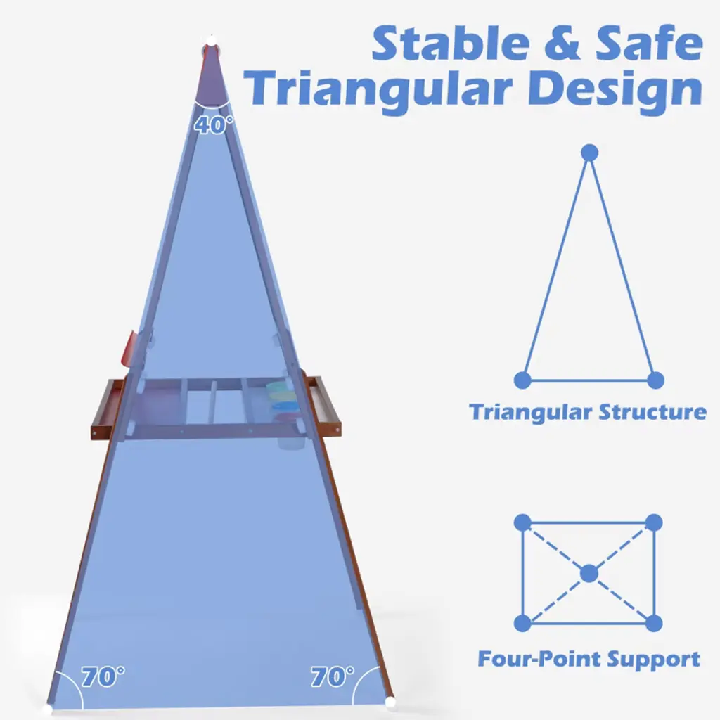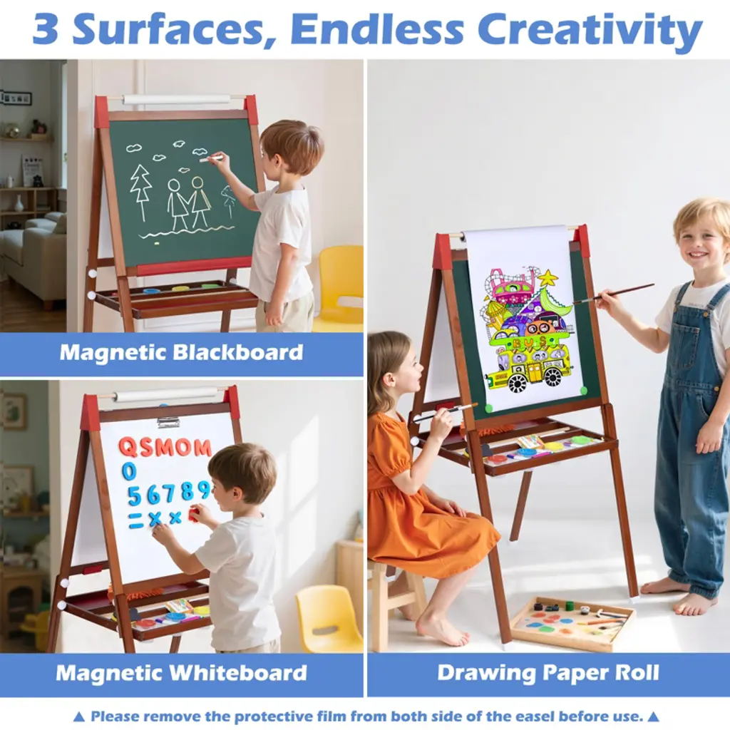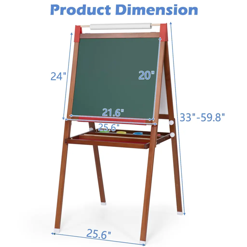 Unleash your child’s creativity with this versatile kids' art easel, featuring a 3-in-1 design: magnetic blackboard, whiteboard, and a paper roll holder. Designed with a sturdy triangular wooden frame and height-adjustable legs, it grows with your child from toddler to tween. Whether drawing, painting, or learning, this easel provides endless hours of educational fun while saving space with its foldable design. Features 3-in-1 drawing surfaces Height adjustable: 33"–59.8" Natural wood frame Foldable for compact storage Storage tray with paint pots included Specifications Product Dimensions: 25.6" L x 25.6" W x 33"–59.8" H Drawing Board Size: 21.6" W x 20" H Material: Solid wood + magnetic board + paper roll holder Paper Roll Included: Yes Recommended Age: 2–12 years Weight: Lightweight for easy movement Assembly Required: Yes (tools included)