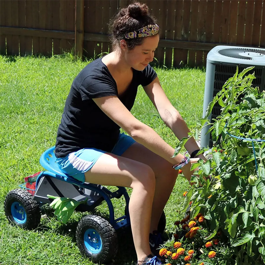 This garden stool for seniors is great for planting and gardening. Use this rolling garden seat while working in the yard to alleviate back strain or to take a well-deserved seat whenever needed. With a seat height range of 16.5 inches to 22 inches, a steel wire basket on the side for tools, and a black plastic tray underneath the seat, roll through any gardening or landscaping job with ease, comfort, and purpose! Use this gardening seat for work in the yard, lawn, farm, garage, shed, warehouse, or any other workspace where this garden scooter can thrive. Finish the landscaping jobs in half the time: this cart is made to last, boasting a heavy-duty, powder-coated steel frame and steering handle, as well as pneumatic tires. This rolling garden stool will resist the elements outdoors.• COMFORTABLE SIZE: This garden cart on wheels with seat measures 33.5" W x 17.75" D x 18.25" H and weighs 29 lbs. It has a 300 lb weight capacity and the adjustable height seat ranges from 16.5" H to 22" H to easily find a comfortable height for working in the garden.• VERSATILE FUNCTIONS: Use this garden seat with wheels in the yard, lawn, farm, garage, shed, warehouse, or any other work space. It features a plastic tray beneath the seat and a steel wire basket on the side for extra storage space for tools and accessories.• DURABLE DESIGN: Made from heavy-duty powder-coated steel, this rolling gardening stool features solid metal axles and pneumatic wheels to ensure this scooter chair will last through many years of work. The following tools are required for assembly (not included): 1/2" wrench, 3/4" wrench, pliers, and a Phillips head screwdriver.• WORK SMARTER, NOT HARDER: The seat of the garden chair for gardening features a 360-degree swivel motion so it can be completely rotated in any direction while working, making outdoor projects easier on the waist and back and taking less time.• WORRY-FREE PURCHASING: Sunnydaze Decor backs its products with a 1-year manufacturer's warranty.