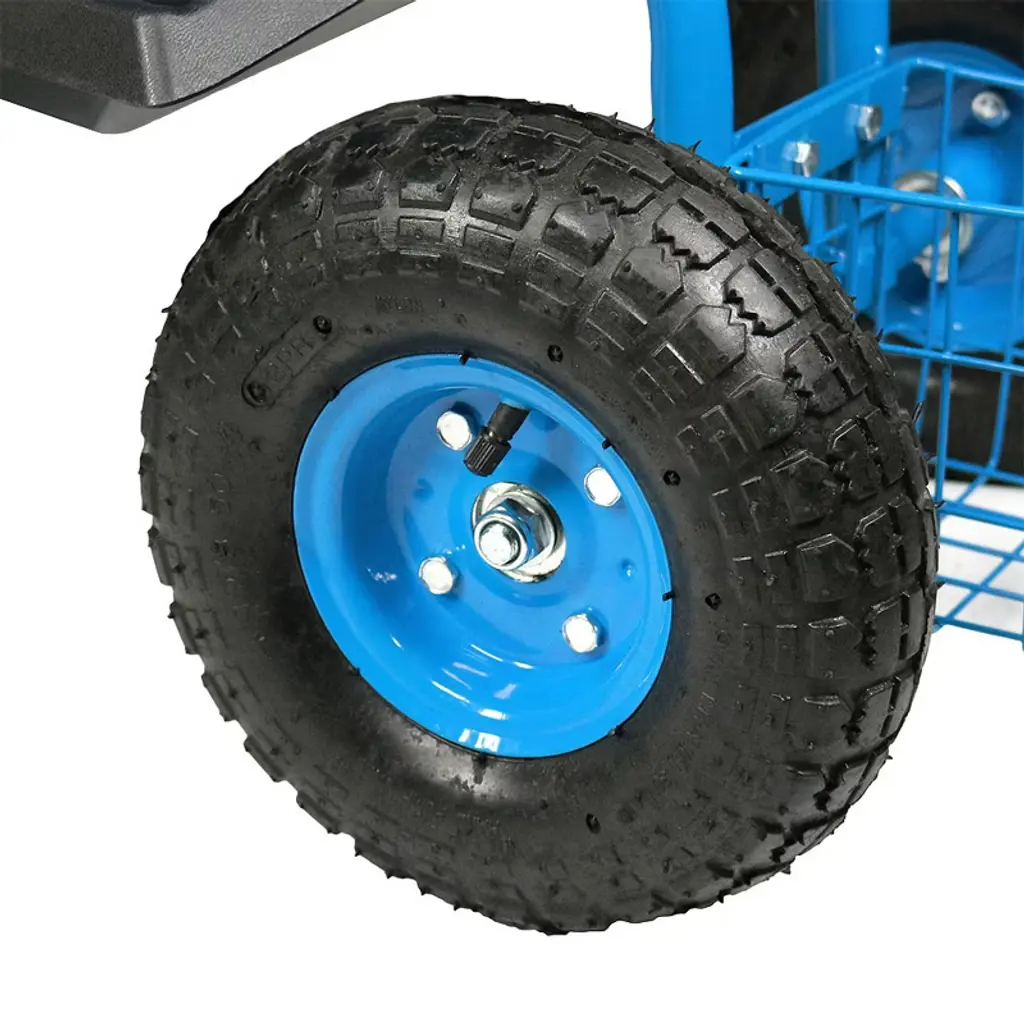 Sunnydaze Outdoor Lawn And Garden Heavy-duty Steel Rolling Gardening Cart With Adjustable Height Swivel Chair, Tool Tray, And Basket - Blue