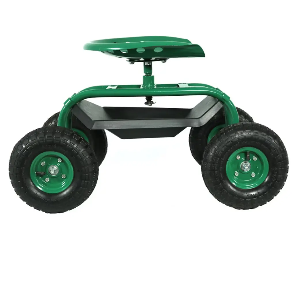 This rolling garden cart features a large, steel seat and an extendable handle that make this garden cart a dream to use while working in the yard. Aside from the convenience, this cart is engineered to last with a heavy-duty, powder-coated steel frame, steel axles, an extendable steel handle, a matching steel wire basket, pneumatic tires with coated rims, and a black plastic tray for holding tools and other convenient items. The seat features a 360-degree swivel motion to face any direction needed to complete the job. Moving this cart is easy too, just pull the cart with the extendable steering handle. Use this handy swivel cart while working in the yard to alleviate back strain or to take a well-deserved seat whenever needed.• COMFORTABLY TACKLE ANY TERRAIN: This rolling garden cart with seat has an overall size of 31" W x 18" D x 22" H and weighs 28 lbs. The seat measures 17.75" W x 15" D and has a 17.5" W x 15.25" D basket beneath. Plus, it features an adjustable height range from 16.5" to 22" H so it easy to find a comfortable height. The unit has an overall weight capacity of 300 lbs, and the wheels measure 10" in diameter.• BUILT TO LAST: Made from heavy-duty powder-coated steel with vibrant color, this cart is built to last. Solid steel axles and heavy-duty pneumatic wheels ensure that the garden chair with wheels will last through many years of gardening and landscaping.• ENJOY COMFORT AND CONVENIENCE WHILE GARDENING: The seat features a 360-degree swivel motion to completely rotate while working. This rolling garden stool features a black plastic tray beneath the seat for convenient storage for tools and gloves.• EASY TO ASSEMBLE: A few tools are required for assembly (not included): 1/2" wrench, 3/4" wrench, pliers, and Phillips head screwdriver. Please note that this garden work seat is not meant for children to play with or ride on.• WORRY-FREE PURCHASING: Sunnydaze Decor backs its products with a 1-year manufacturer's warranty.