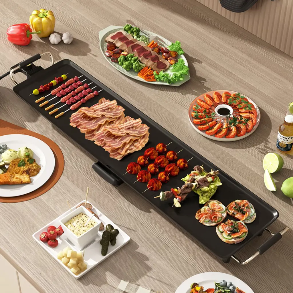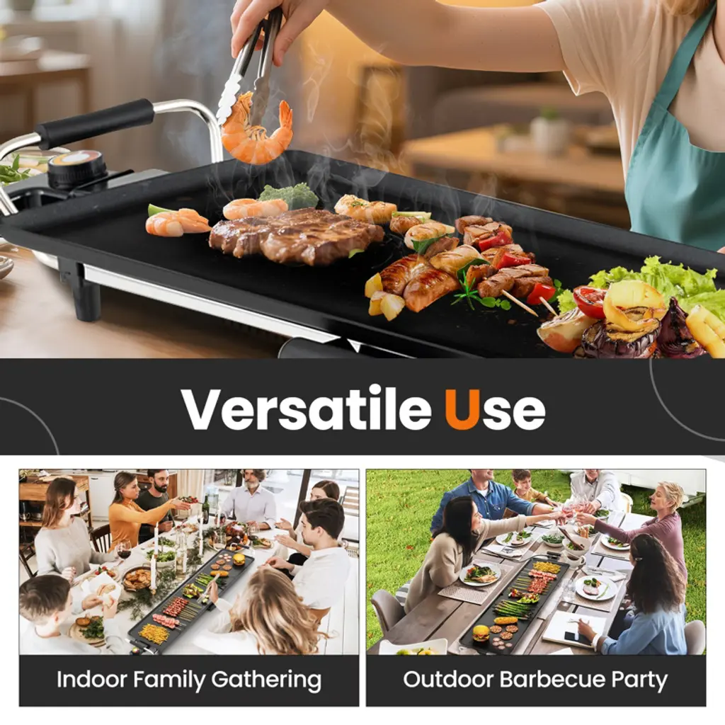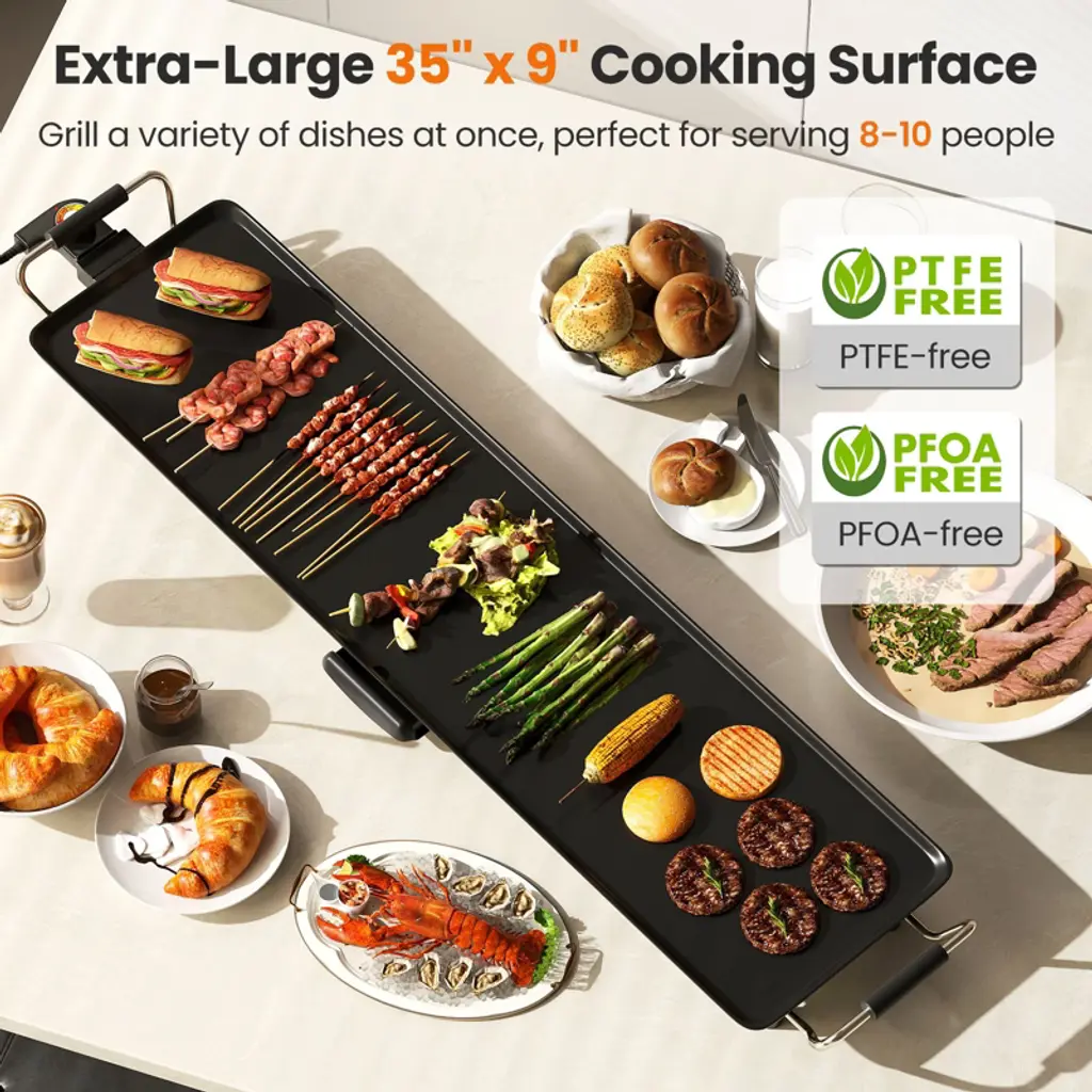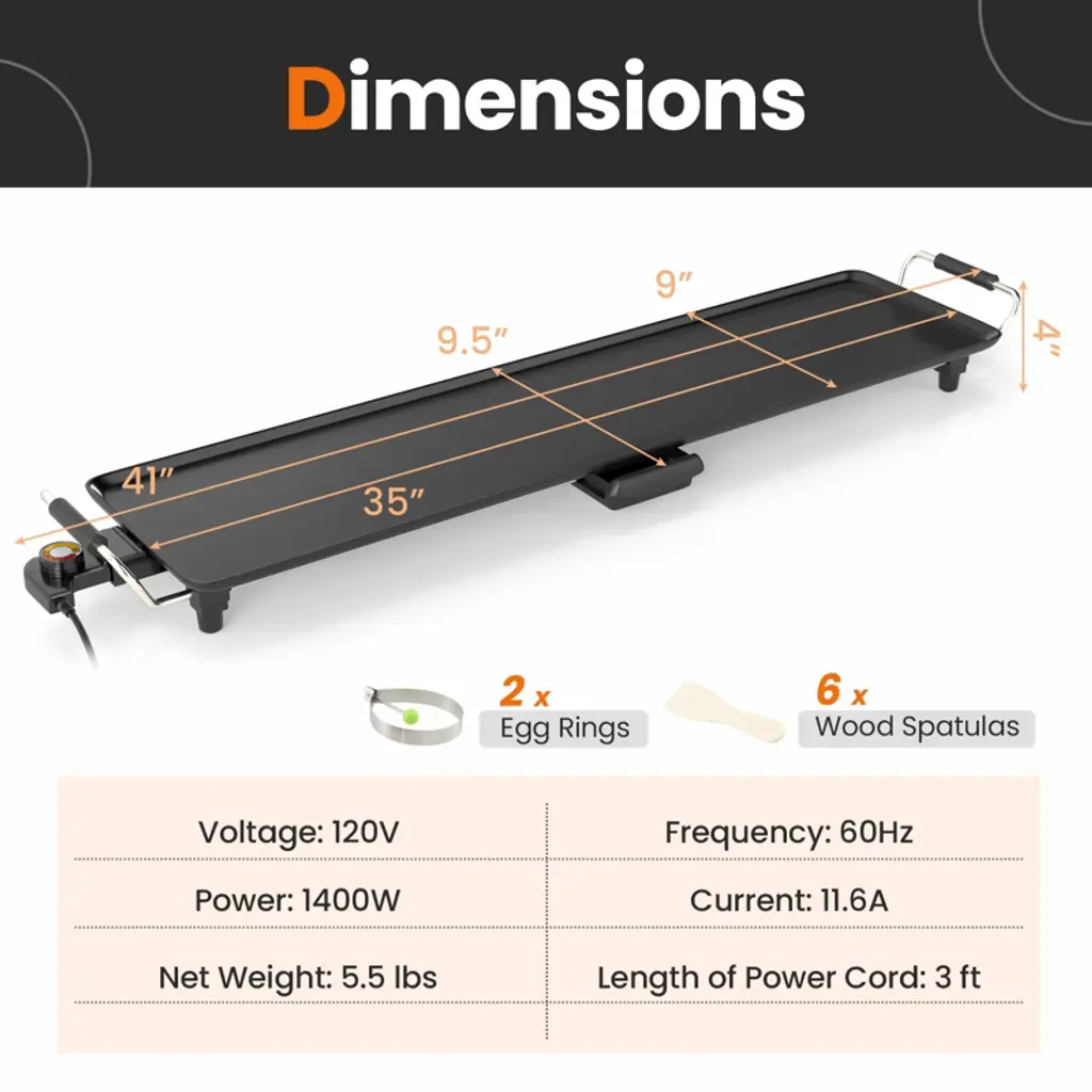 Upgrade your cooking game with this extra large electric griddle! The 27" x 9"/35" x 9" cooking surface allows you to serve 6-8/8-10 people at once, making it perfect for family gatherings, parties, or outdoor barbecues. With 4 customizable temperature settings, you can easily achieve the perfect sear on your burgers, crispy bacon, or fluffy pancakes. The nonstick surface and pull-out drip tray ensure effortless cooking and hassle-free cleaning. Thoughtfully crafted details such as an anti-scalding handle and non-slip foot pads provide you with added convenience. Portable and stable, this electric BBQ grill is perfect for both indoor and outdoor use. Don't settle for ordinary - elevate your cooking experience with our stamping aluminum electric griddle today!FeaturesStamping aluminum material ensures even heating and long-lasting durability 4-level thermostat adjustment to suit various cooking requirements1400W fast & even heating, preheat for 1.5 minutes before grillingGrill a variety of dishes at once, perfect for serving 6-8/8-10 peoplePTFE-free & PFOA-free cooking surface for enhanced safetySpecifications: Color: Black Material: Stamping Aluminum Overall Dimensions: 41" x 9.5" x 4"/104 x 24 x 10.5 cm (L x W x H) Sizes of Cooking Area: 35" x 9"/89 x 22 cm (L x W) Length of Power Cord: 3 ft/90 cm Net Weight: 5.5 lbs/2.5 kg Power: 1400W Voltage: 120V Frequency: 60Hz Current: 11.6A Package Includes: 1 x Electric Griddle 1 x Power Cord 2 x Egg Rings 6 x Wood Spatulas 1 x Instruction