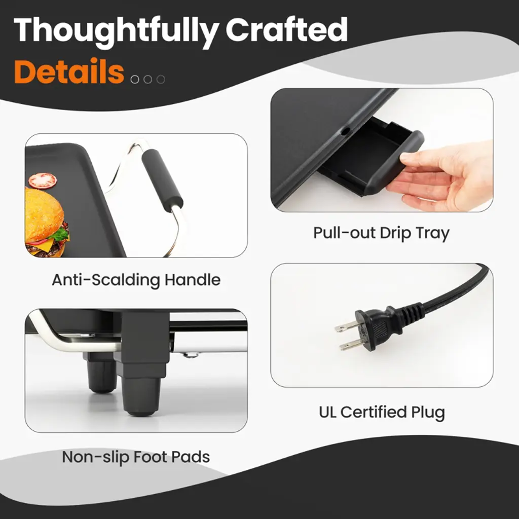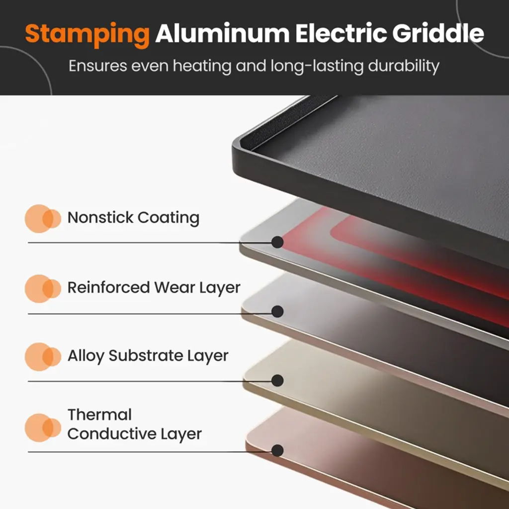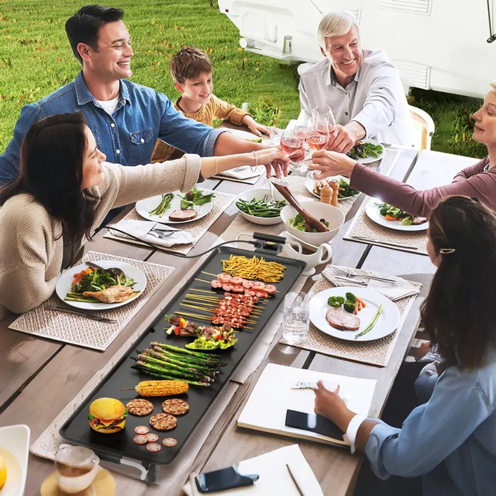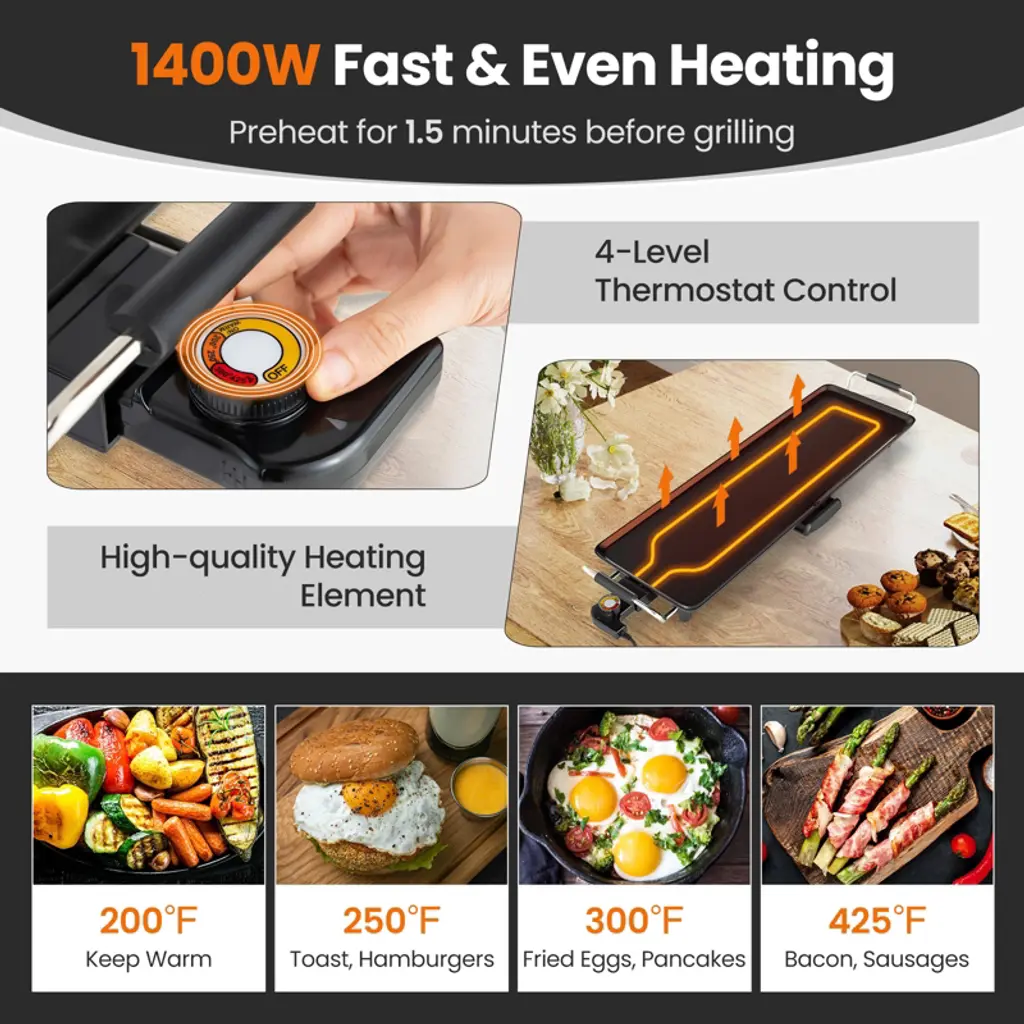 Upgrade your cooking game with this extra large electric griddle! The 27" x 9"/35" x 9" cooking surface allows you to serve 6-8/8-10 people at once, making it perfect for family gatherings, parties, or outdoor barbecues. With 4 customizable temperature settings, you can easily achieve the perfect sear on your burgers, crispy bacon, or fluffy pancakes. The nonstick surface and pull-out drip tray ensure effortless cooking and hassle-free cleaning. Thoughtfully crafted details such as an anti-scalding handle and non-slip foot pads provide you with added convenience. Portable and stable, this electric BBQ grill is perfect for both indoor and outdoor use. Don't settle for ordinary - elevate your cooking experience with our stamping aluminum electric griddle today!FeaturesStamping aluminum material ensures even heating and long-lasting durability 4-level thermostat adjustment to suit various cooking requirements1400W fast & even heating, preheat for 1.5 minutes before grillingGrill a variety of dishes at once, perfect for serving 6-8/8-10 peoplePTFE-free & PFOA-free cooking surface for enhanced safetySpecifications: Color: Black Material: Stamping Aluminum Overall Dimensions: 41" x 9.5" x 4"/104 x 24 x 10.5 cm (L x W x H) Sizes of Cooking Area: 35" x 9"/89 x 22 cm (L x W) Length of Power Cord: 3 ft/90 cm Net Weight: 5.5 lbs/2.5 kg Power: 1400W Voltage: 120V Frequency: 60Hz Current: 11.6A Package Includes: 1 x Electric Griddle 1 x Power Cord 2 x Egg Rings 6 x Wood Spatulas 1 x Instruction