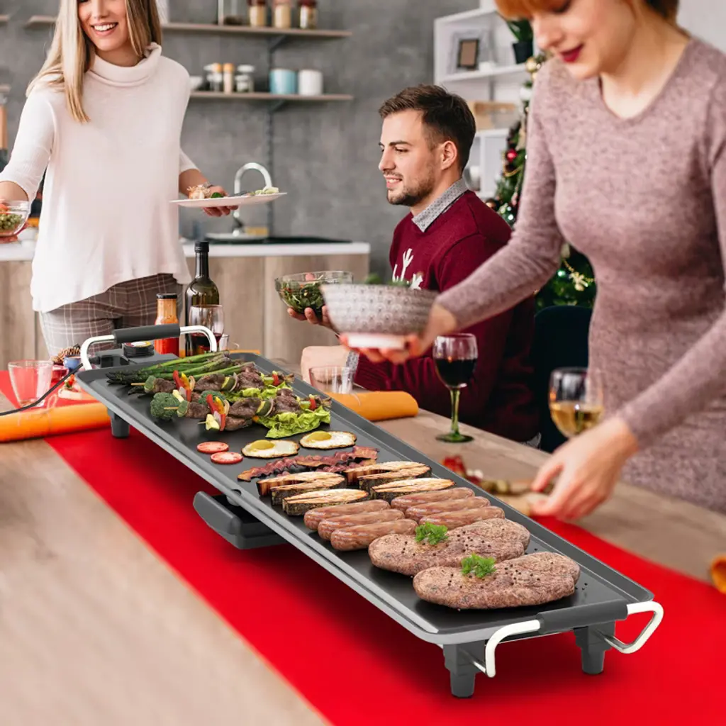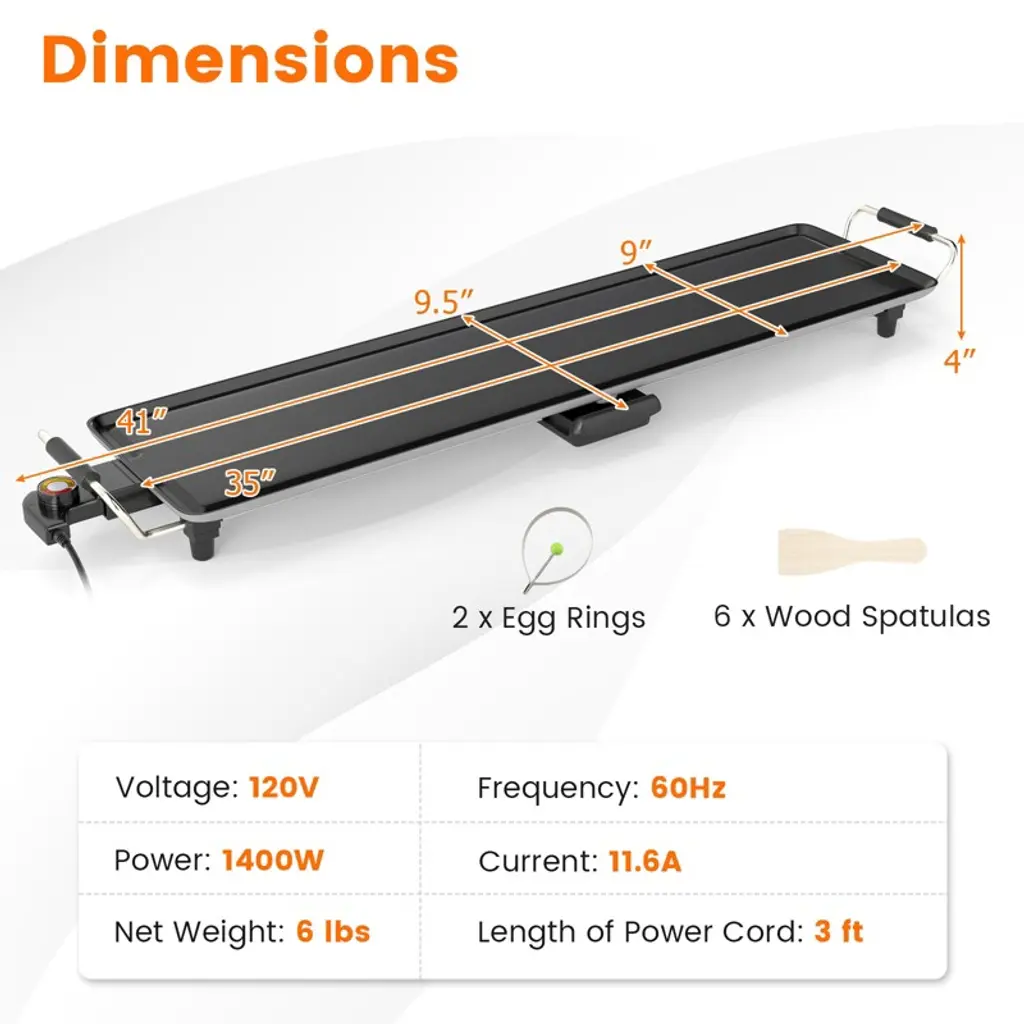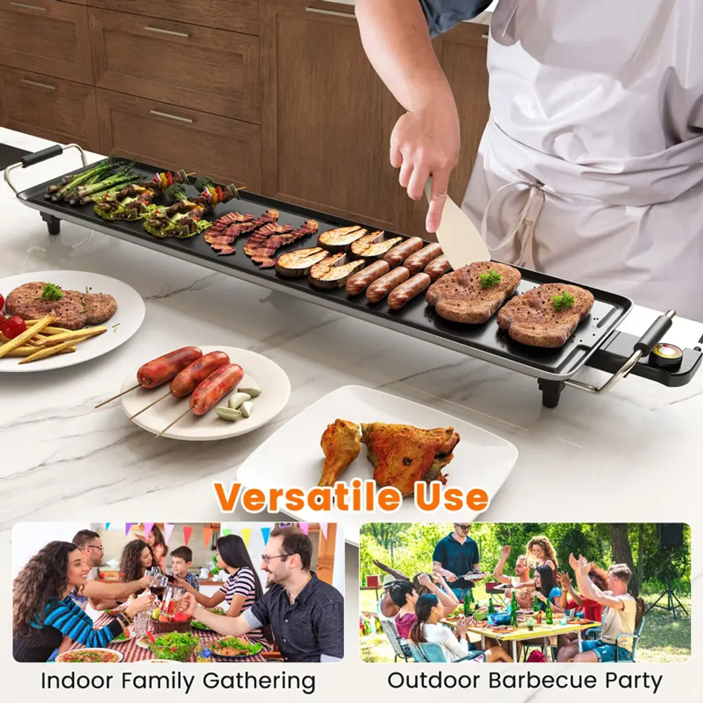 Upgrade your cooking game with this extra large electric griddle! The 39.5'' x 9'' dual-zone cooking surface allows you to serve 10-12 people at once, making it perfect for family gatherings, parties, or outdoor barbecues. The flat surface retains juice and preserves the flavor of the food, ideal for grilling vegetables. The ribbed surface drains away excess oil and keeps food from being greasy, ideal for grilling meat. 4 customizable temperature settings meet your various cooking requirements, while the nonstick surface and pull-out drip tray ensure easy cooking and cleaning. Portable and stable, this electric grill is perfect for both indoor and outdoor use. Don't settle for ordinary - elevate your cooking experience with our cast aluminum electric griddle today!FeaturesDie-casting aluminum material ensures even heating and long-lasting durability Dual-zone cooking area includes a flat surface and a ribbed surface4-level thermostat adjustment to suit various cooking requirements1400W fast & even heating, preheat for 1.5 minutes before grillingGrill multiple dishes at once, perfect for serving 10-12 peopleSpecifications: Color: Black Material: Die-casting Aluminum Overall Dimensions: 46" x 9.5" x 4"/116.5 x 24 x 10.5 cm (L x W x H) Sizes of Cooking Area: 39.5" x 9"/100 x 22 cm (L x W) Length of Power Cord: 3 ft/90 cm Net Weight: 8 lbs/3.5 kg Power: 1400W Voltage: 120V Frequency: 60Hz Current: 11.6A Package Includes: 1 x Electric Griddle 1 x Power Cord 2 x Egg Rings 6 x Wood Spatulas 1 x Instruction