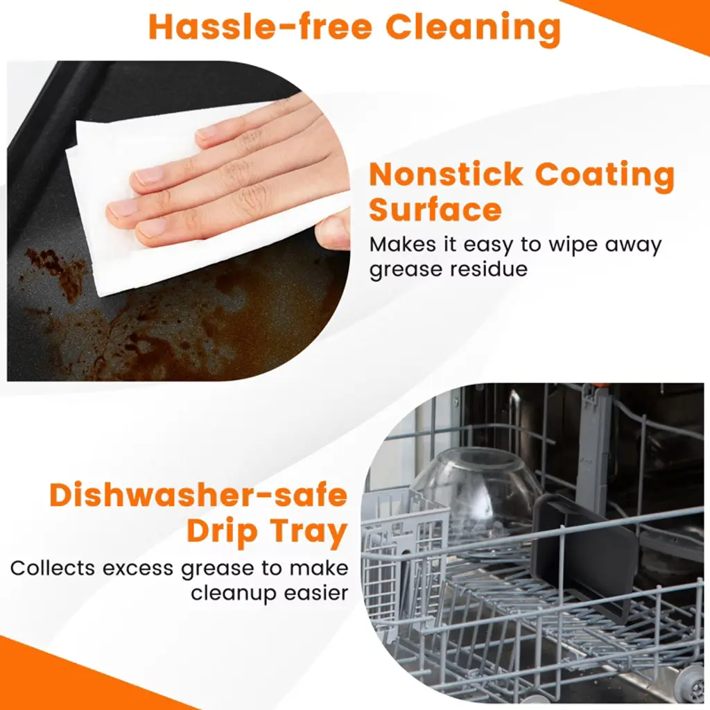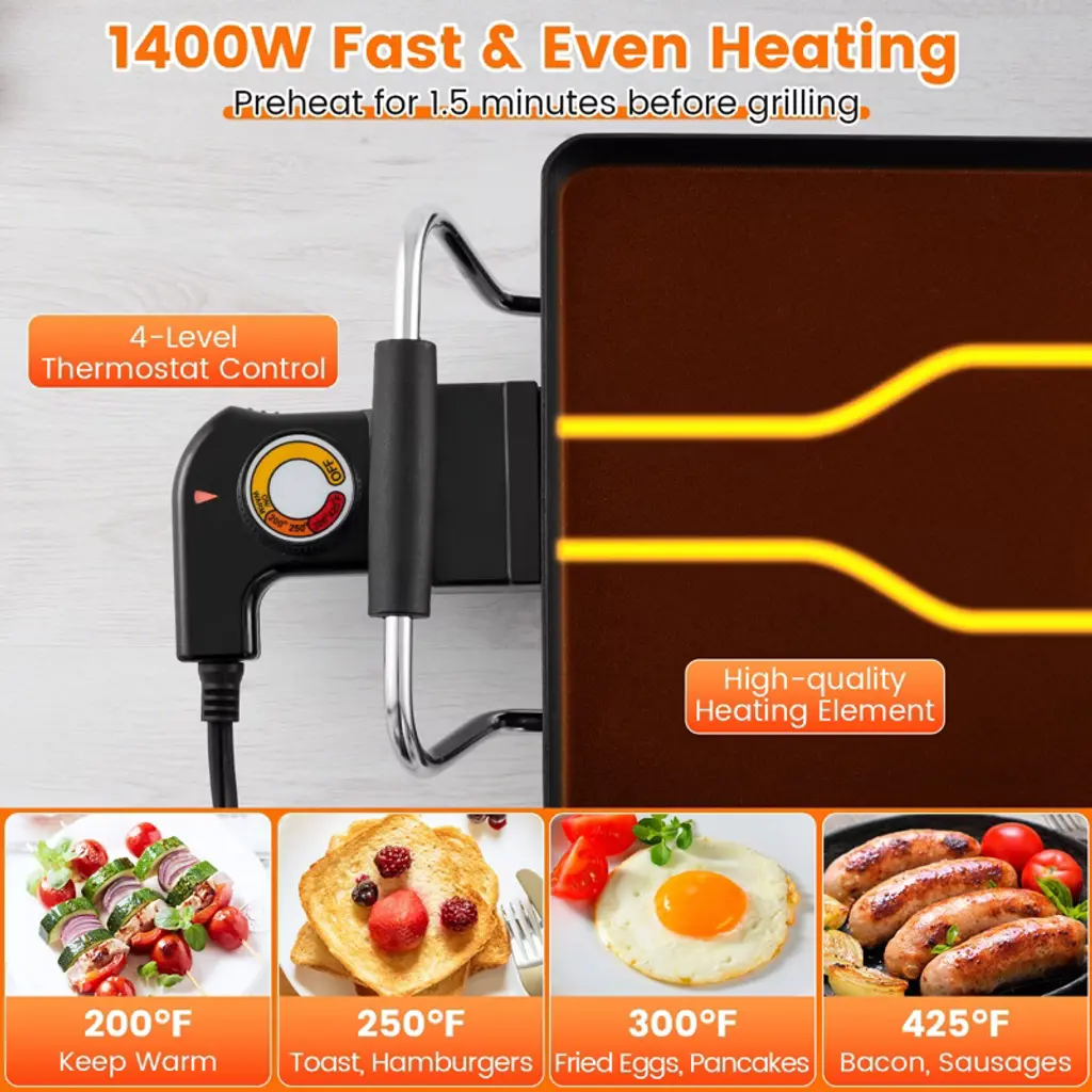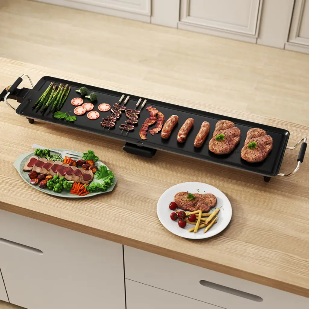 Upgrade your cooking game with this extra large electric griddle! The 39.5'' x 9'' dual-zone cooking surface allows you to serve 10-12 people at once, making it perfect for family gatherings, parties, or outdoor barbecues. The flat surface retains juice and preserves the flavor of the food, ideal for grilling vegetables. The ribbed surface drains away excess oil and keeps food from being greasy, ideal for grilling meat. 4 customizable temperature settings meet your various cooking requirements, while the nonstick surface and pull-out drip tray ensure easy cooking and cleaning. Portable and stable, this electric grill is perfect for both indoor and outdoor use. Don't settle for ordinary - elevate your cooking experience with our cast aluminum electric griddle today!FeaturesDie-casting aluminum material ensures even heating and long-lasting durability Dual-zone cooking area includes a flat surface and a ribbed surface4-level thermostat adjustment to suit various cooking requirements1400W fast & even heating, preheat for 1.5 minutes before grillingGrill multiple dishes at once, perfect for serving 10-12 peopleSpecifications: Color: Black Material: Die-casting Aluminum Overall Dimensions: 46" x 9.5" x 4"/116.5 x 24 x 10.5 cm (L x W x H) Sizes of Cooking Area: 39.5" x 9"/100 x 22 cm (L x W) Length of Power Cord: 3 ft/90 cm Net Weight: 8 lbs/3.5 kg Power: 1400W Voltage: 120V Frequency: 60Hz Current: 11.6A Package Includes: 1 x Electric Griddle 1 x Power Cord 2 x Egg Rings 6 x Wood Spatulas 1 x Instruction