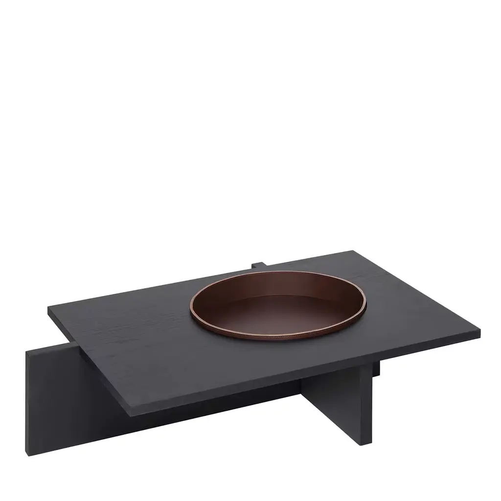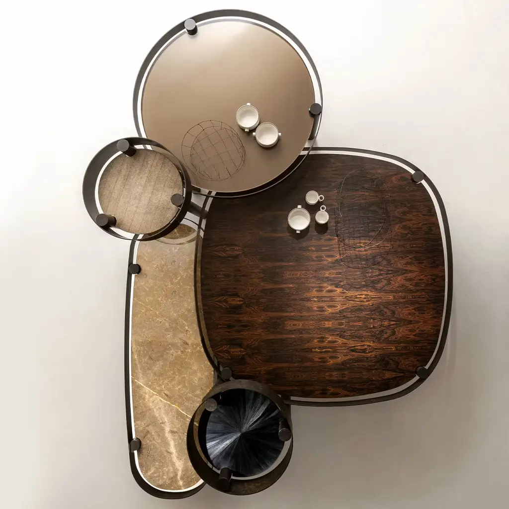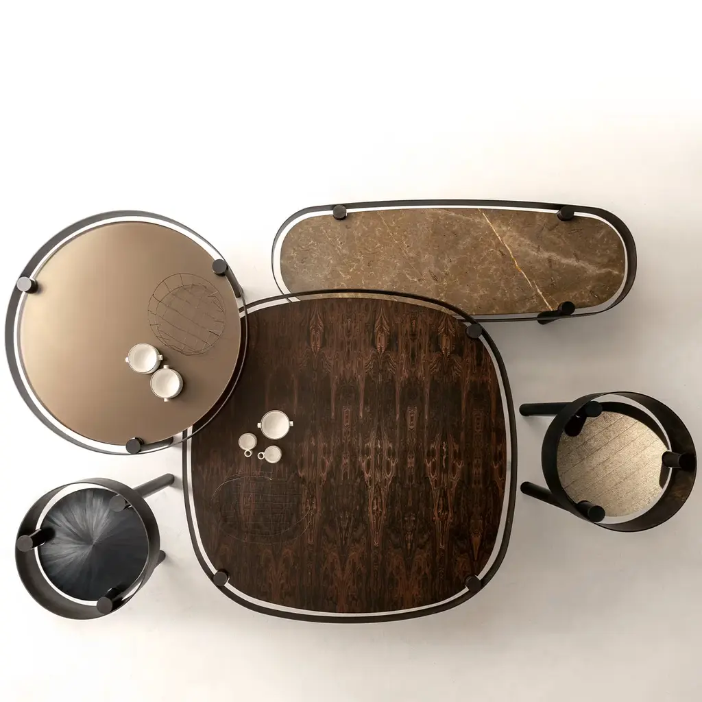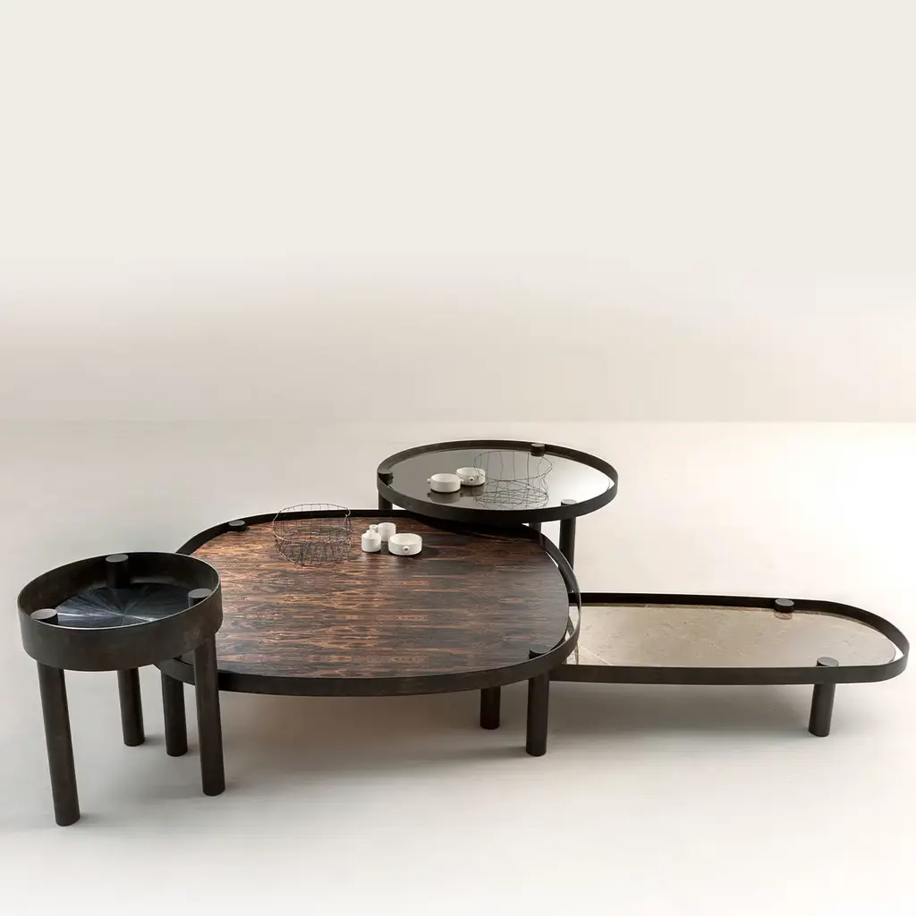 Low elliptical coffee table with "tray effect". Tubular base in acid-etched iron "storm" and top in grey Travertino marble. Top customization is available upon request. Please, contact the Concierge service for further information.