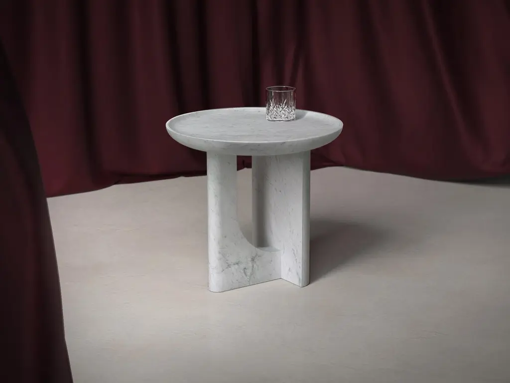 Masterfully crafted from a 2" thick Calacata Blue marble block, Tray side table shows all the beauty and complexity of a stunning and rare stone.The veins run on the surfaces of Tray defining different patterns that change depending on the orientation and curvature. The marble top is carved in depth to create a sophisticated debossed surface. The result is a natural art piece only possible thanks to an extraordinary process of craftsmanship and technology.Tray 100% crafted in Italy and is customizable in height.Reach out to us to explore alternative stones.