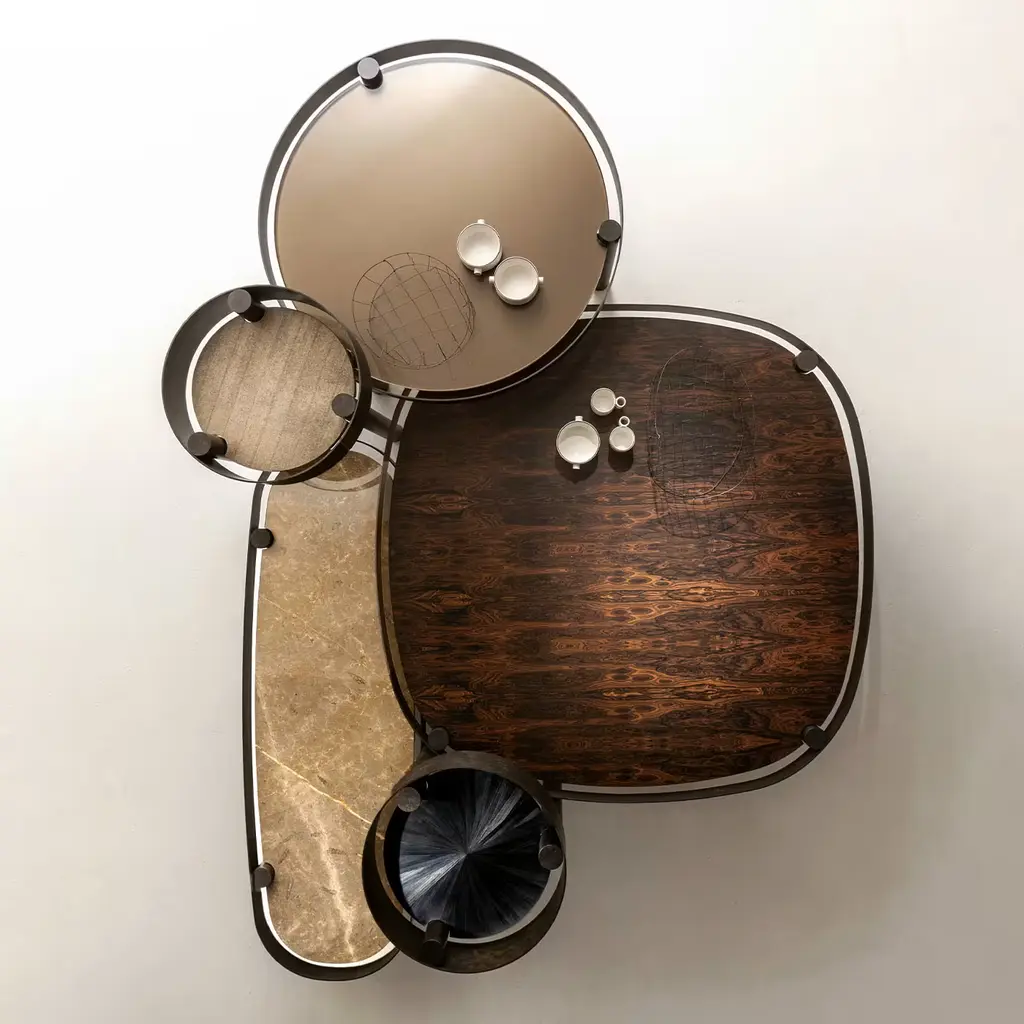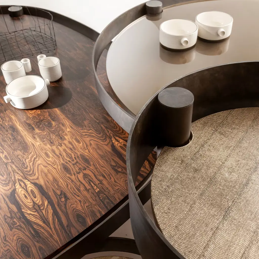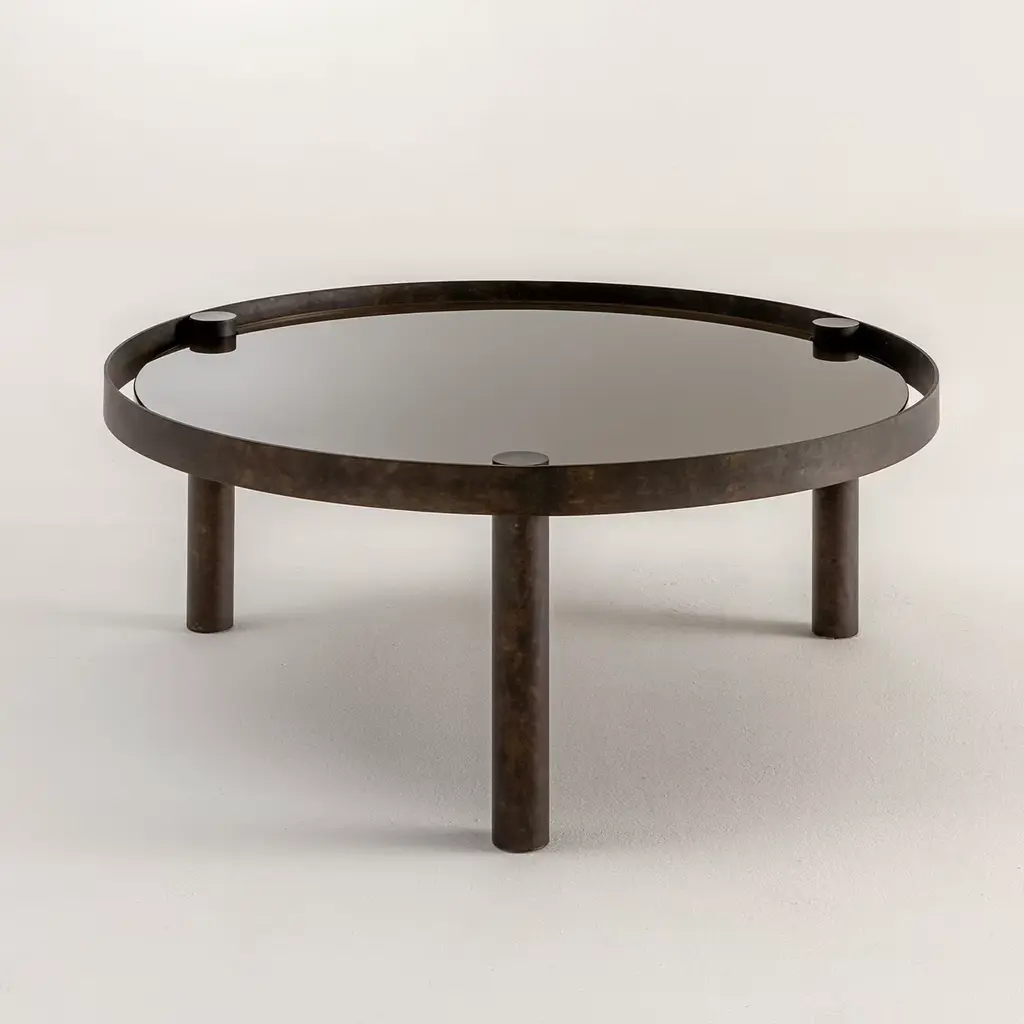 A timeless design, this low coffee table is rendered in a tray-inspired shape that will make for a distinctive accent to a contemporary interior especially if combined with others from the same series. It features a tubular base in acid-etched iron, and a clean top in back-painted glass. The top is available in all wood essences of the Collection, in dyed or special wood, in Garza, in Alambra Brown marble and in bronze, copper or tin back-lacquered glass. Please ask the Concierge for details. Design by Romani Saccani Architetti Associati.