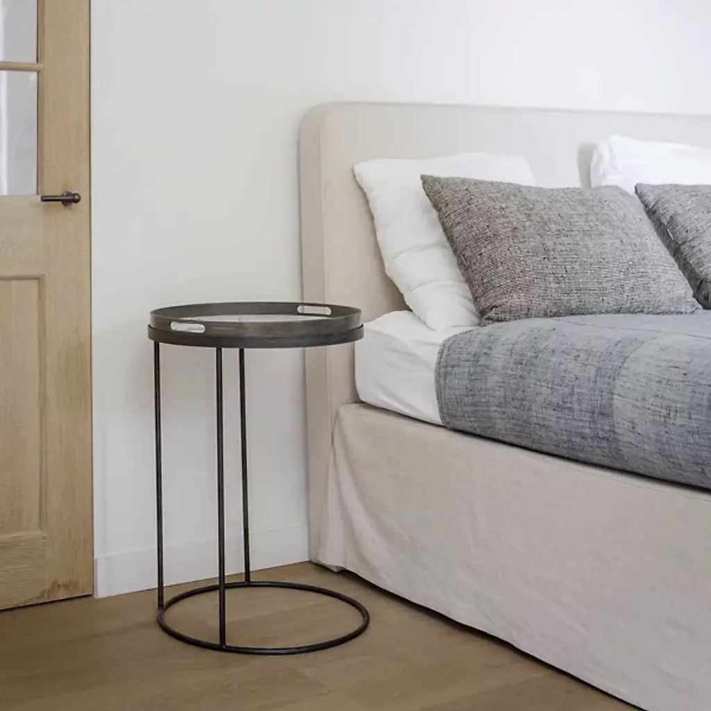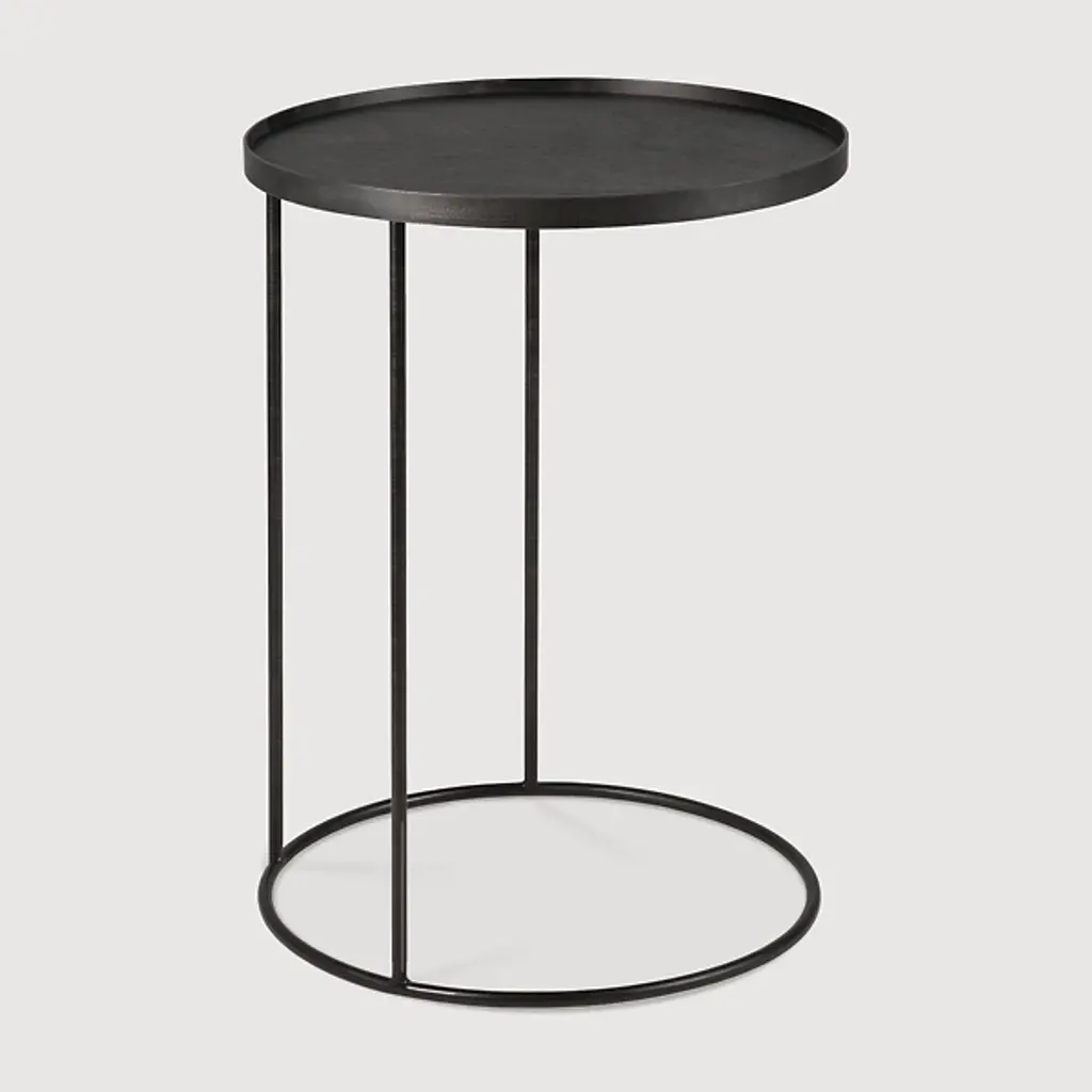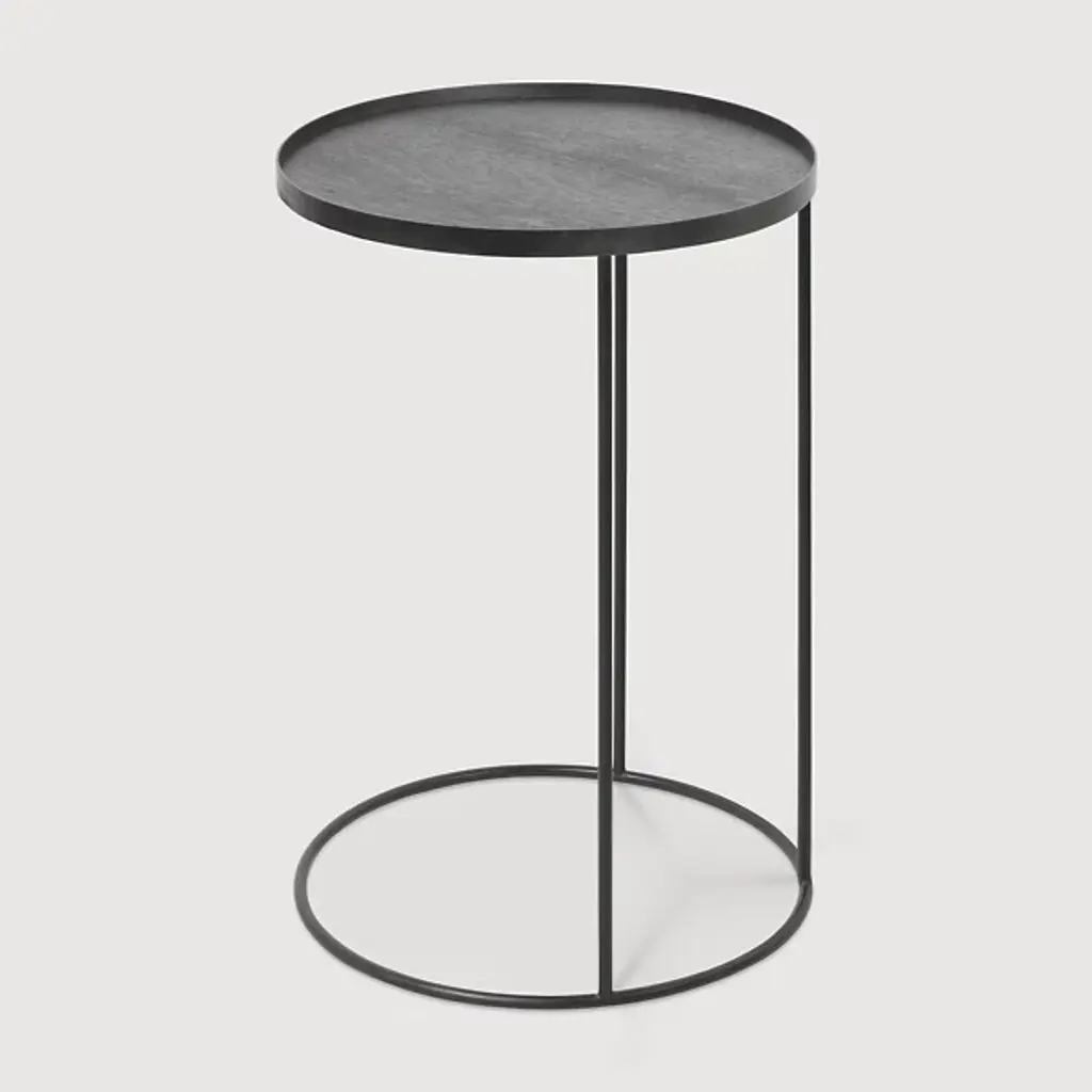 Tray Round Side Table from Ethnicraft is the embodiment of rustic modern design. It features a captivating asymmetric design, allowing it to be tucked alongside low furnishings, adding practicality to your living space. This piece takes on a rounded shape for a touch of style. It is composed of durable metal and wood. The separately sold tray leaves plenty of room for organizing essentials while providing a platform for mementos and more.
