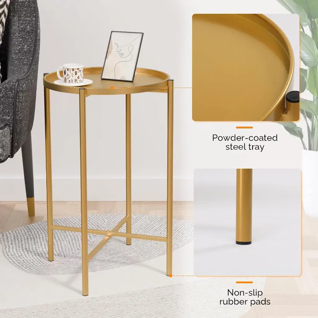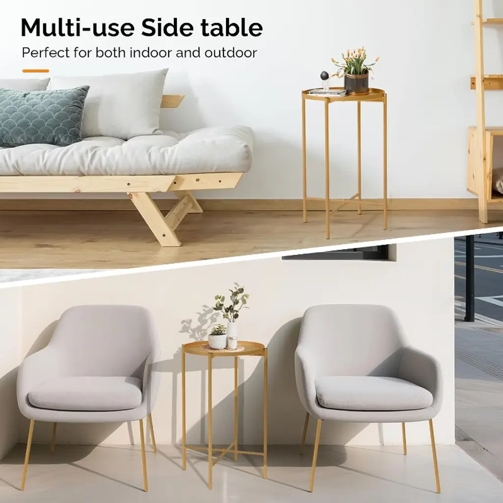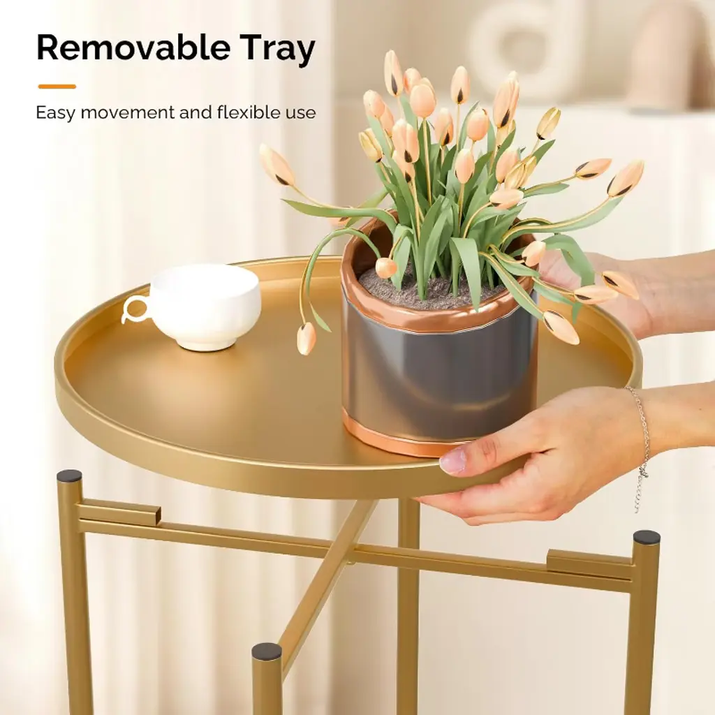 This round metal side table is engineered for small spaces without compromising functionality or style. The removable tray lets you serve snacks effortlessly indoors or outdoors, while the premium rustproof metal withstands extreme temperatures and rainy weather. The X-braced base with silicone pads keeps it stable even on uneven surfaces. Its minimalist matte design blends seamlessly with Scandi, industrial, or modern décor – perfect as a sofa-side table, nightstand, or balcony coffee table.