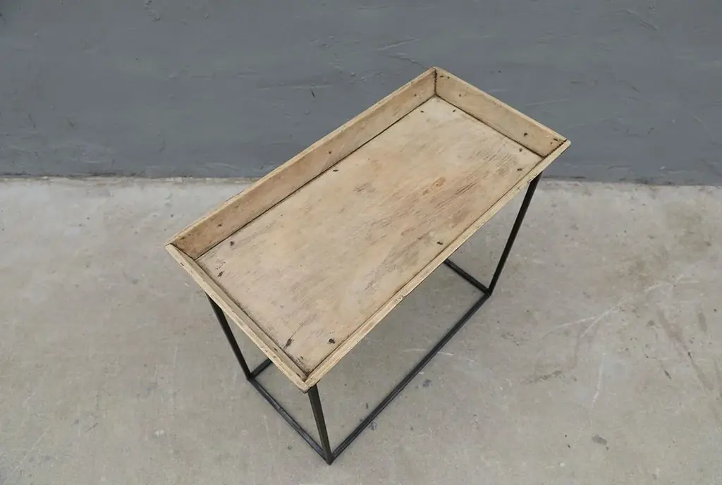 This vintage tray table blends rustic wood with simple iron legs for a piece that’s both functional and sculptural. Originally crafted from a repurposed wooden tray, the top features a weathered natural finish that highlights the grain, age, and handmade character of the wood. Each table is unique, with variations in tone, surface markings, and subtle imperfections from years of use. The iron legs provide sturdy support and a quiet industrial edge, allowing the textured wood to take center stage. Approximate Dimensions: W 25″ × D 15″ × H 24″ Use it as a low side table, coffee table for small spaces, or a sculptural accent. It brings tactile depth and quiet utility to any corner.