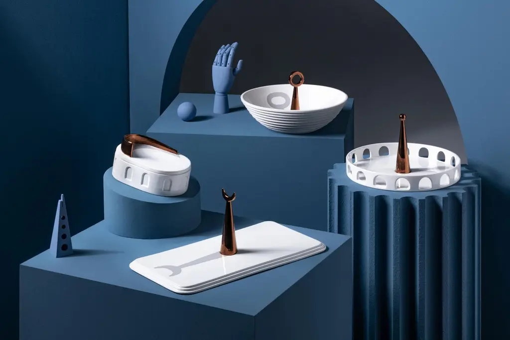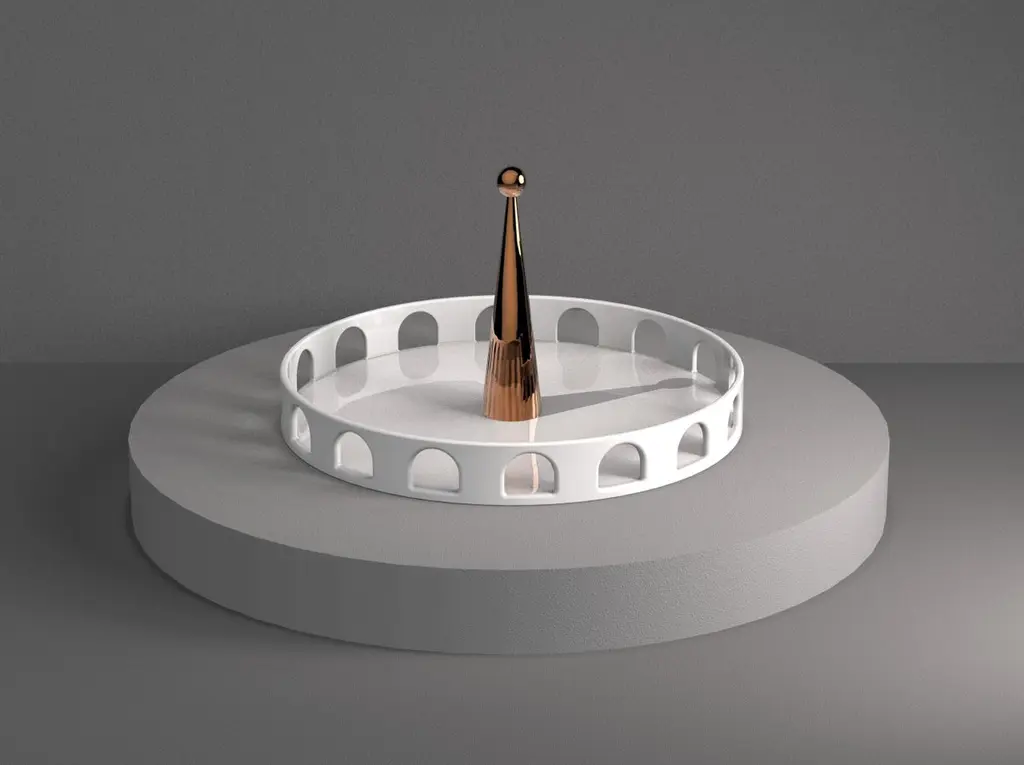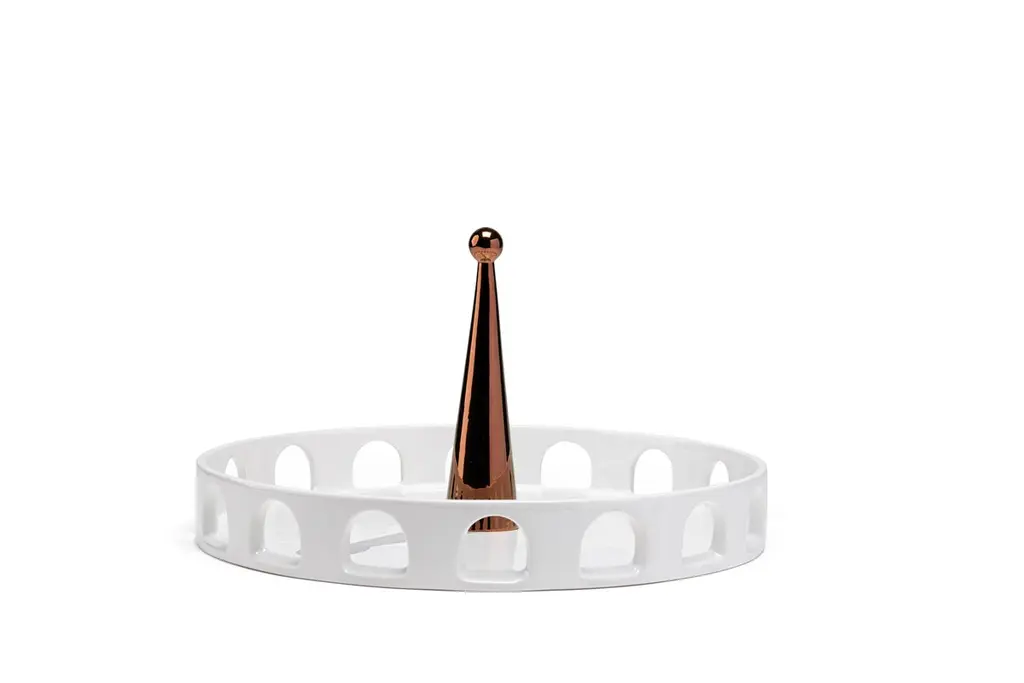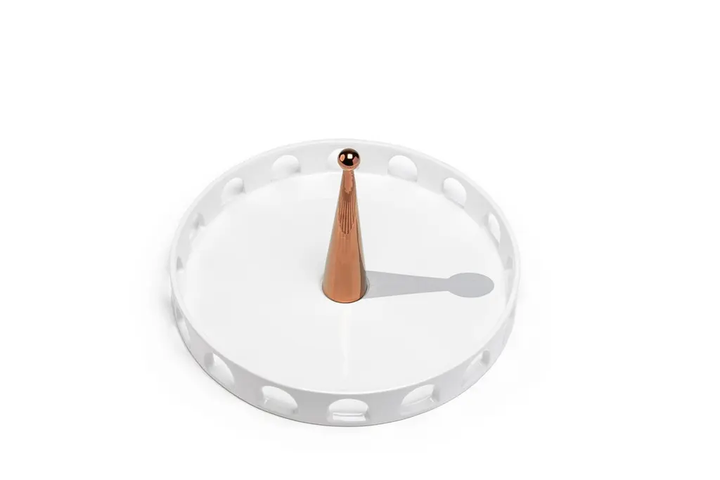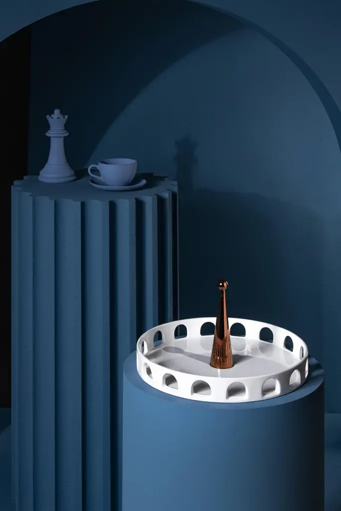 The tray 06:45 of the 'Meridiane' collection recalls typical shapes of Classic Italian architecture. The white ceramic arena is the background for an obelisk painted in copper that casts its shadow which is painted on the horizontal surface.This piece is entirely crafted by hand in Italy by the best artisans. The natural, living material of which the tray is made of changes as it is being worked to give rise to those tiny irregularities that are the unmistakable mark of a product of highly skilled Italian craftsmanship.Its function can be to carry cups, glasses or drinks. is ideal as an accessory to be displayed on a coffee table, alone or together with other objects from the same collection.