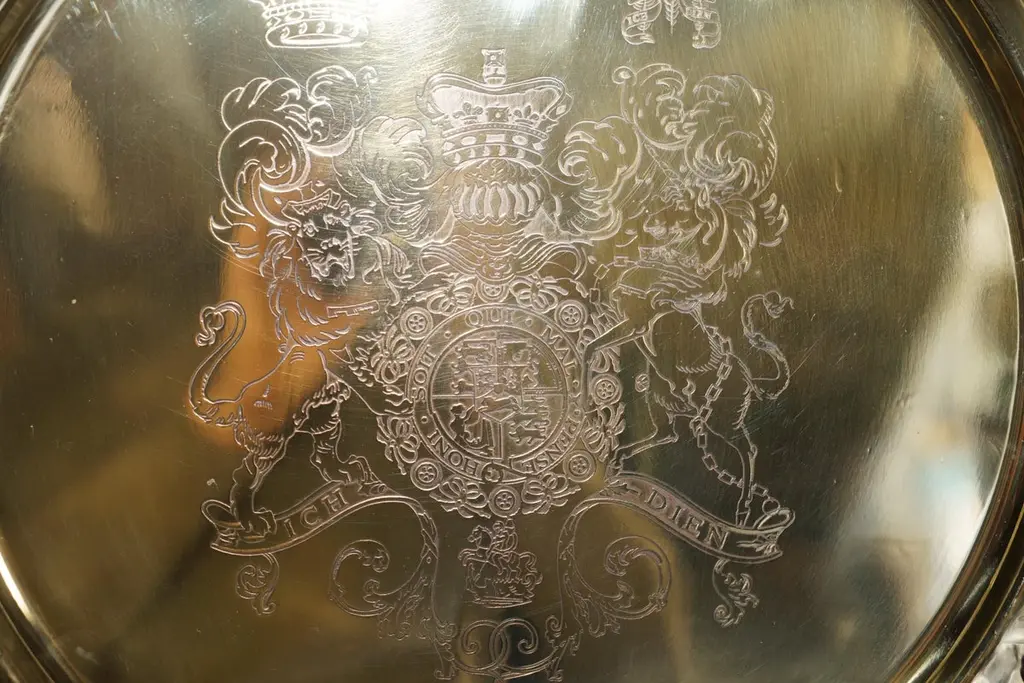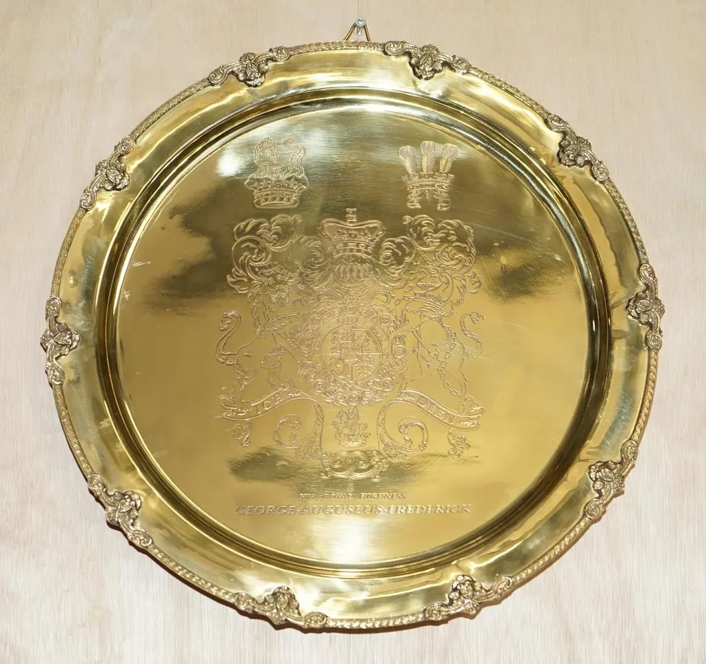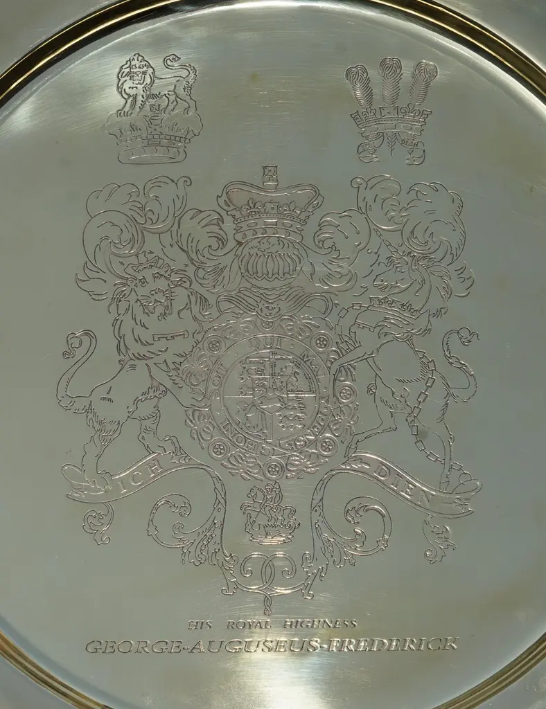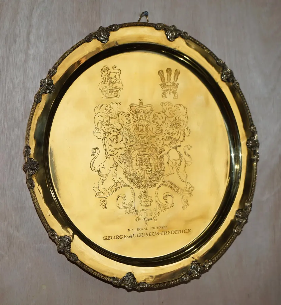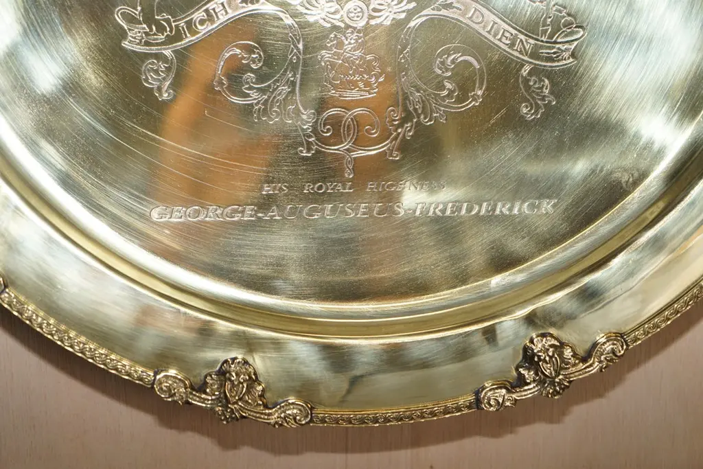 We are delighted to offer for sale 1 of 4 Gold gilt Sterling Silver plated, fully hallmarked for Sheffield 1919 Serving trays with engraved Armorial coat of arms crest for King George IV “His Royal Highness George Auguseue Frederick”These are truly exquisite trays, the armorial coat of arms is for King George IV, a brief history as below, these are the old set in gold gilt I have seen, they have each been fitted with a hanging tag so they are for display not useThe trays are very decorative and expertly made, the Armorial coat of arms must have cost quite a pretty penny to have the press made. Each tray is fully hallmarked for the sideways facing Lion for Sterling Silver, the Queens Crown for Sheffield made and the date letter A for 1919The condition of each tray is good, some have more wear and light discolouration than others as you would expect from 100+ year old pieces, there will be normal honest patina front and back, none have any chips or damageDimensionsHeight:- 50cmWidth:- 50cmDepth:- 3cmPlease note all measurements are taken at the widest pointGeorge IV (George Augustus Frederick; 12 August 1762 – 26 June 1830) was King of the United Kingdom of Great Britain and Ireland and King of Hanover from the death of his father, King George III, on 29 January 1820 until his own death ten years later.He had already been serving as Prince Regent since 5 February 1811, during his father's final mental illness. George IV was the eldest child of King George III and Queen Charlotte.He led an extravagant lifestyle that contributed to the fashions of the Regency era. He was a patron of new forms of leisure, style and taste. He commissioned John Nash to build the Royal Pavilion in Brighton and remodel Buckingham Palace, and commissioned Jeffry Wyatville to rebuild Windsor Castle.George's charm and culture earned him the title "the first gentleman of England", but his dissolute way of life and poor relationships with his parents and his wife, Caroline of Brunswick, earned him the contempt of the people and dimmed the prestige of the monarchy.He excluded Caroline from his coronation and asked the government to introduce the unpopular Pains and Penalties Bill in an unsuccessful attempt to divorce her.Despite presiding over the British Empire's emergence as a global hegemon, his rule was tarnished by scandal and financial extravagance. His ministers found his behaviour selfish, unreliable and irresponsible, and he was strongly influenced by favourites.During most of George's regency and reign, Lord Liverpool controlled the government as Prime Minister of the United Kingdom. Liverpool's government presided over Britain's ultimate victory over Napoleon and negotiated a peace settlement with the French.After Liverpool's retirement, George IV was forced to accept Catholic emancipation despite opposing it. His only legitimate child, Princess Charlotte, predeceased him in 1817, so he was succeeded by his younger brother, King William IV.