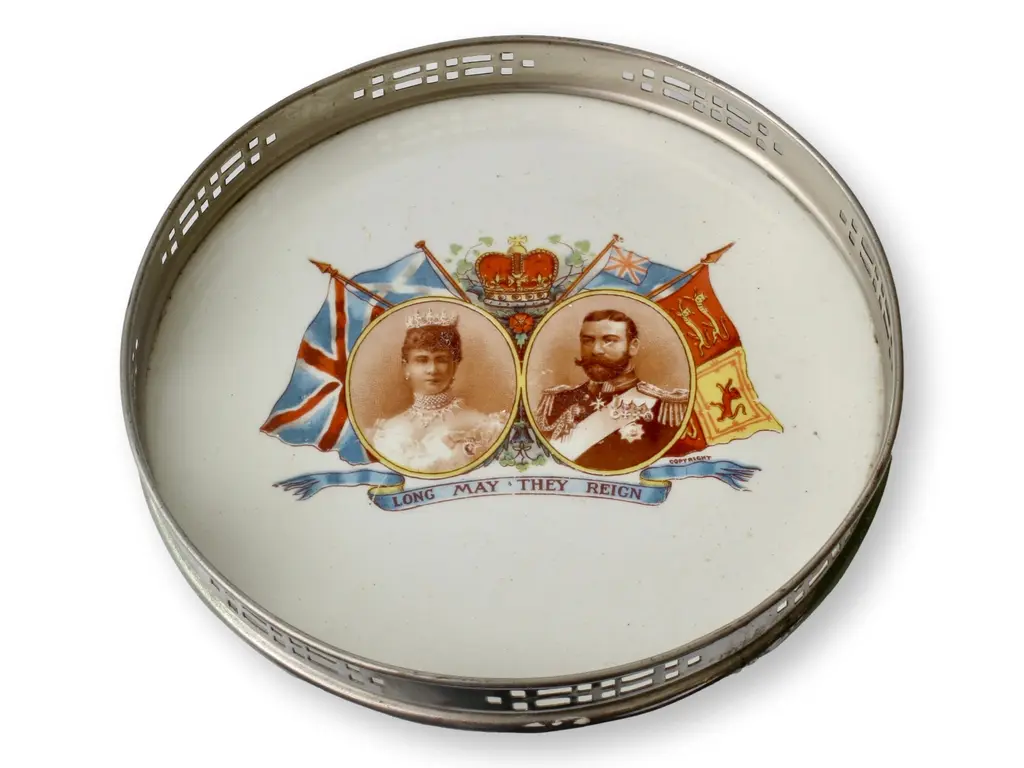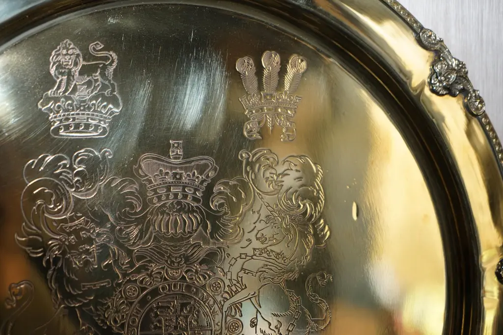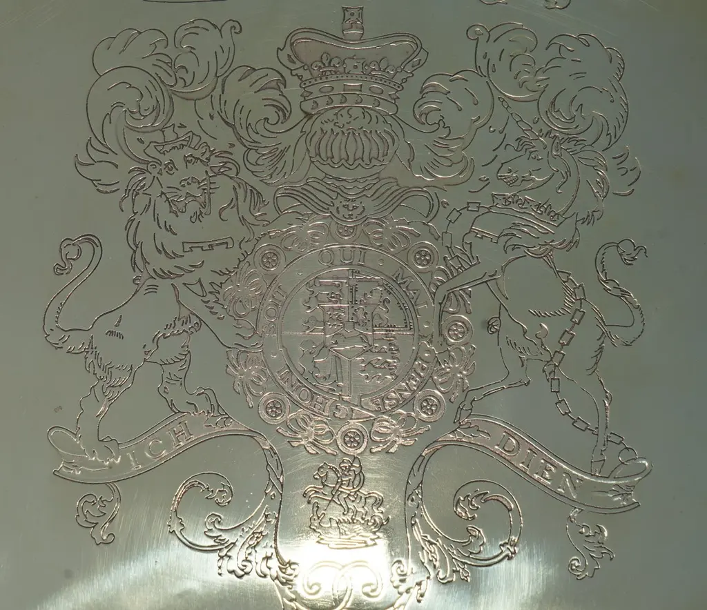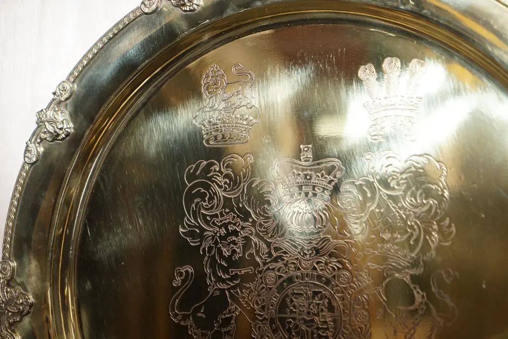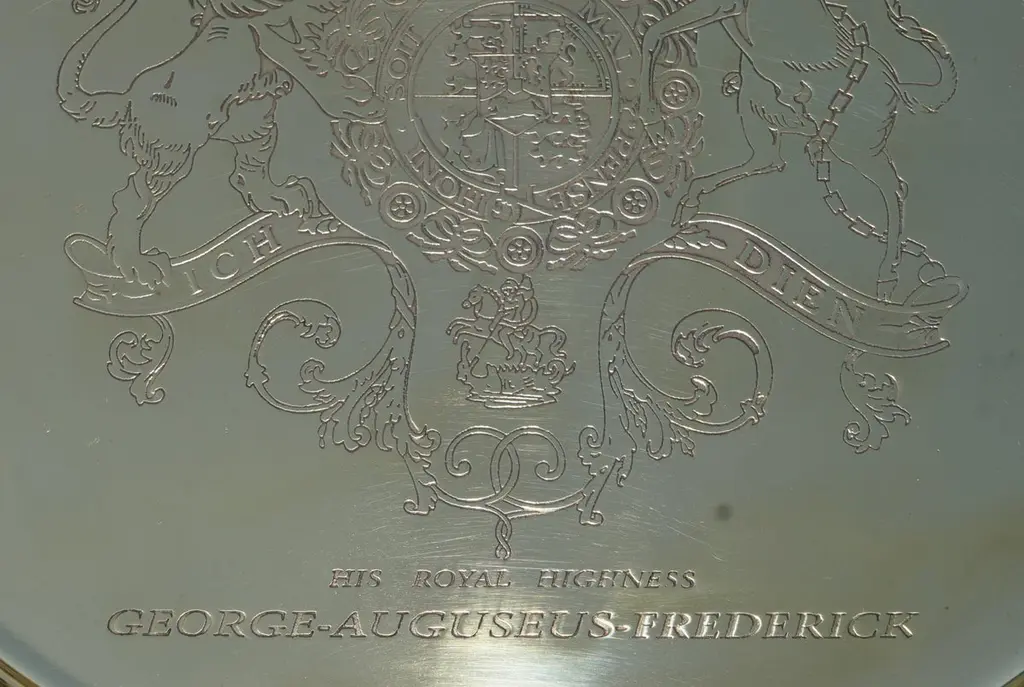 We are delighted to offer for sale 1 of 4 Gold gilt Sterling Silver plated, fully hallmarked for Sheffield 1919 Serving trays with engraved Armorial coat of arms crest for King George IV “His Royal Highness George Auguseue Frederick”These are truly exquisite trays, the armorial coat of arms is for King George IV, a brief history as below, these are the old set in gold gilt I have seen, they have each been fitted with a hanging tag so they are for display not useThe trays are very decorative and expertly made, the Armorial coat of arms must have cost quite a pretty penny to have the press made. Each tray is fully hallmarked for the sideways facing Lion for Sterling Silver, the Queens Crown for Sheffield made and the date letter A for 1919The condition of each tray is good, some have more wear and light discolouration than others as you would expect from 100+ year old pieces, there will be normal honest patina front and back, none have any chips or damageDimensionsHeight:- 50cmWidth:- 50cmDepth:- 3cmPlease note all measurements are taken at the widest pointGeorge IV (George Augustus Frederick; 12 August 1762 – 26 June 1830) was King of the United Kingdom of Great Britain and Ireland and King of Hanover from the death of his father, King George III, on 29 January 1820 until his own death ten years later.He had already been serving as Prince Regent since 5 February 1811, during his father's final mental illness. George IV was the eldest child of King George III and Queen Charlotte.He led an extravagant lifestyle that contributed to the fashions of the Regency era. He was a patron of new forms of leisure, style and taste. He commissioned John Nash to build the Royal Pavilion in Brighton and remodel Buckingham Palace, and commissioned Jeffry Wyatville to rebuild Windsor Castle.George's charm and culture earned him the title "the first gentleman of England", but his dissolute way of life and poor relationships with his parents and his wife, Caroline of Brunswick, earned him the contempt of the people and dimmed the prestige of the monarchy.He excluded Caroline from his coronation and asked the government to introduce the unpopular Pains and Penalties Bill in an unsuccessful attempt to divorce her.Despite presiding over the British Empire's emergence as a global hegemon, his rule was tarnished by scandal and financial extravagance. His ministers found his behaviour selfish, unreliable and irresponsible, and he was strongly influenced by favourites.During most of George's regency and reign, Lord Liverpool controlled the government as Prime Minister of the United Kingdom. Liverpool's government presided over Britain's ultimate victory over Napoleon and negotiated a peace settlement with the French.After Liverpool's retirement, George IV was forced to accept Catholic emancipation despite opposing it. His only legitimate child, Princess Charlotte, predeceased him in 1817, so he was succeeded by his younger brother, King William IV.