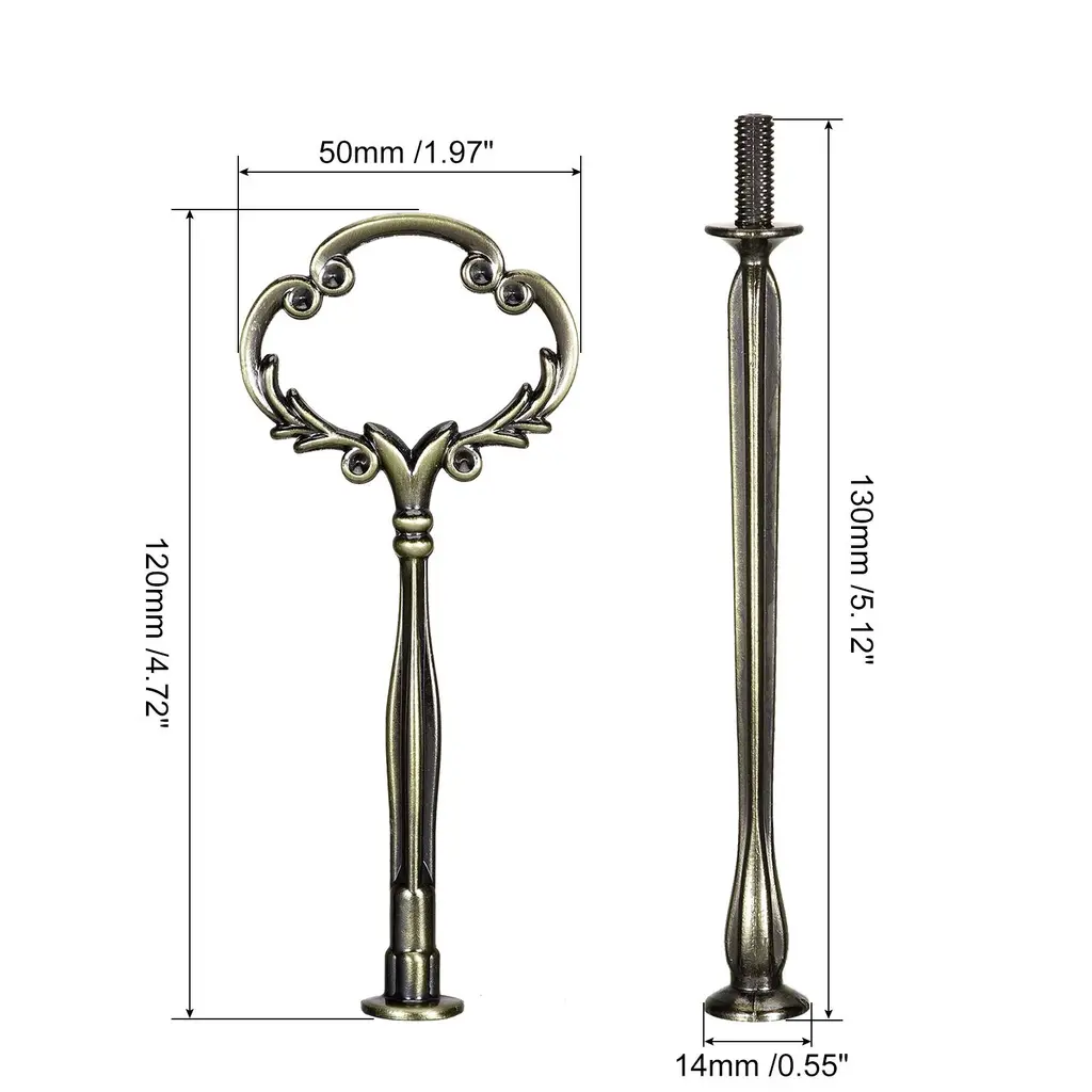 Description:Made of good hardness zinc alloy material, this cake plate stand handle is sturdy and durable to use, strong enough to ensure the stability of the stand, and can be used for a long time without fading.Works with ceramic, glass or metal plates(The Plates Are Not Included Here!) to support multi-tiered cake, cupcake or fruit trays, pair it with different types of desserts and fruits to make your plate look more exquisite and charming, having a wonderful time with your family and friends. The stand is designed with a special style handle, which looks beautiful and elegant, making it easy to carry and move, meanwhile, easy to install and connect poles together to form long poles. Detachable and easy to store, good for daily and outdoor use.The cake stand handle is suitable for various occasions, such as home baking, party decoration, banquets, wedding receptions, birthday parties, tea parties, etc. and other activities.Specification:Material: Zinc AlloyConnecting Rod Size: 130x14mm/5.12"x0.55"(L*W)Top Rod Size: 120x50mm/4.72"x1.97"(L*W)Screw Length: 15mmPackage Content:1 Set - 2Pcs x Rods with Mounting Parts