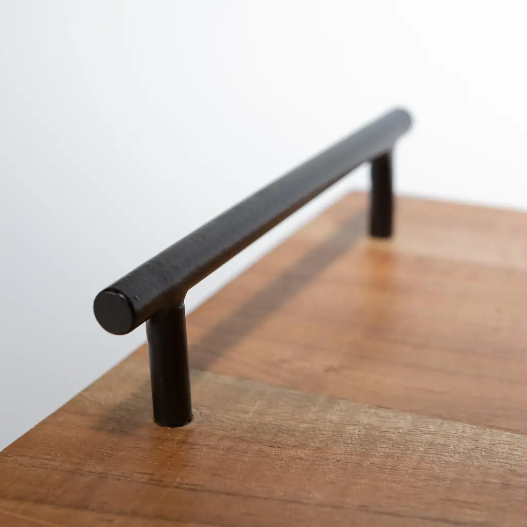 We love highlighting the natural beauty of wood and its rustic elegance. This wooden tray with metal handles is an expertly crafted piece ideal for entertaining. This tray features an attractive, thick piece of wood and iron handles which makes it durable for functional use, as well as an attractive piece to display in your kitchen. The tray is a perfect entertaining and hosting staple. Use it as a charcuterie board display, a veggie tray, or even as a place to set out party favors. Its unassuming elegance lends itself to any decor or theme.