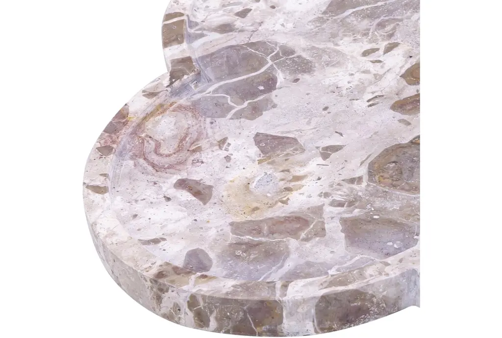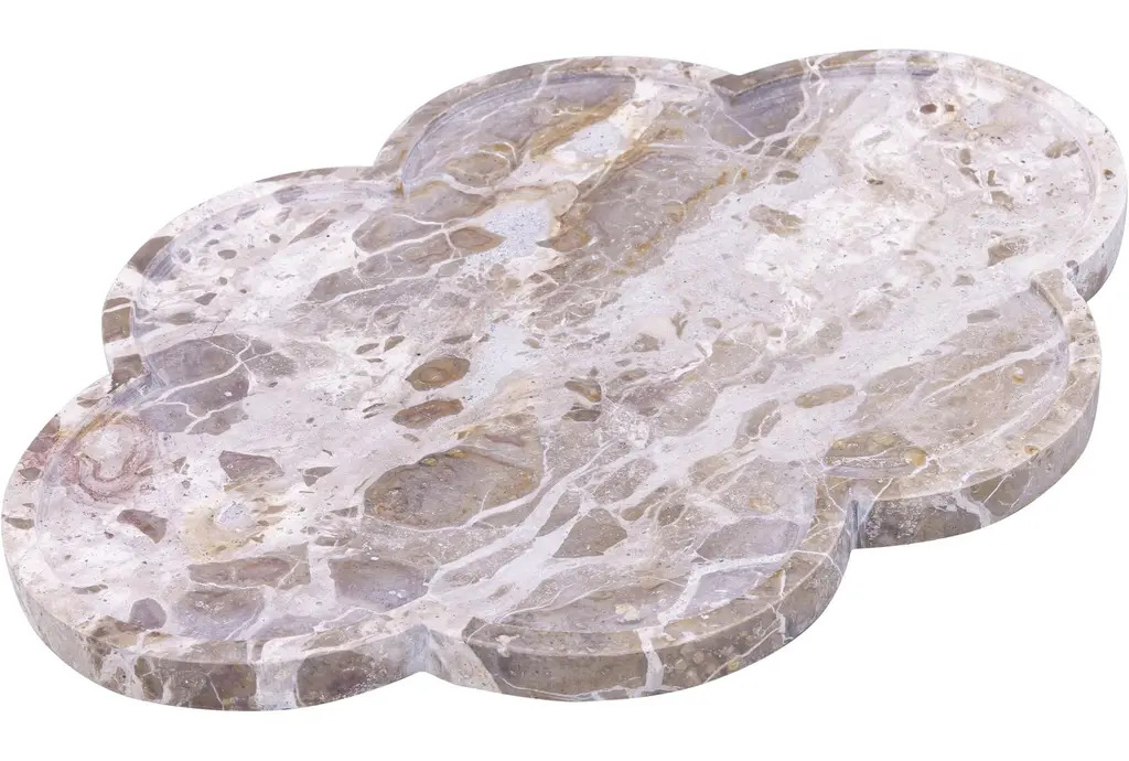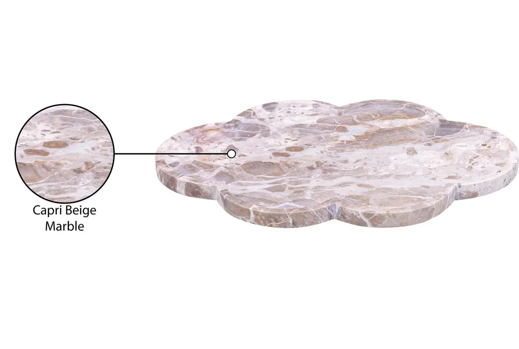 Enhance your home decor with the 16" X 11" Rimini Beige Clover Shaped Marble Tray. This modern tray features a unique clover shape that adds a touch of sophistication to any space. The soft beige color and marble material make it a versatile piece for various interior styles.