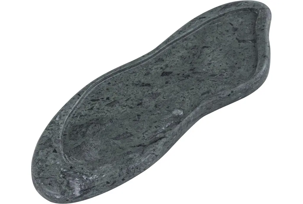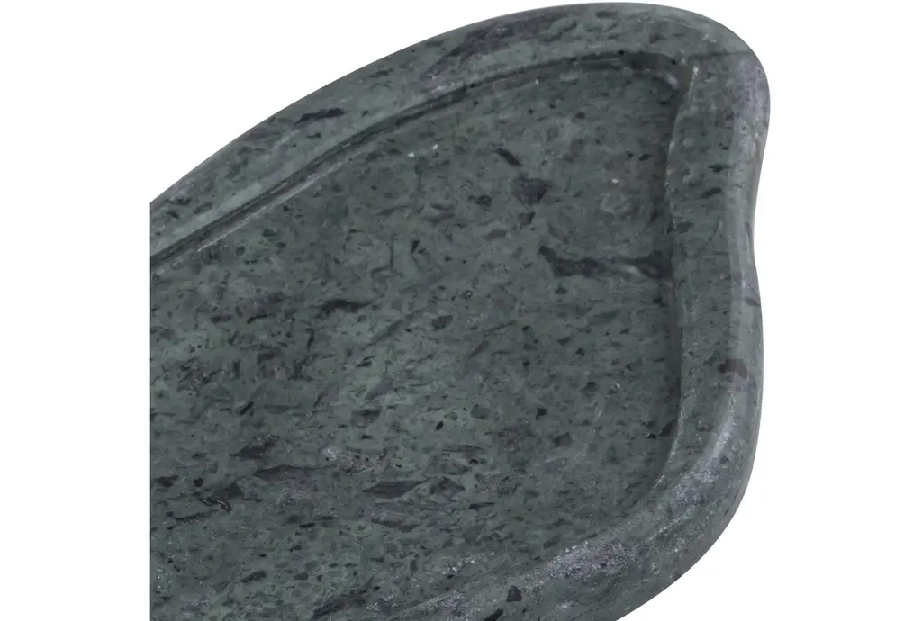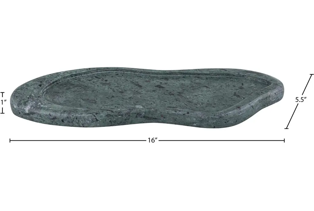 The 16" X 5" Arezzo Green Marble Tray is a versatile and stylish addition to any home. The organic shape and dark hue make it a perfect accent for modern and contemporary spaces. Use it to display decorative items or as a functional piece for serving.