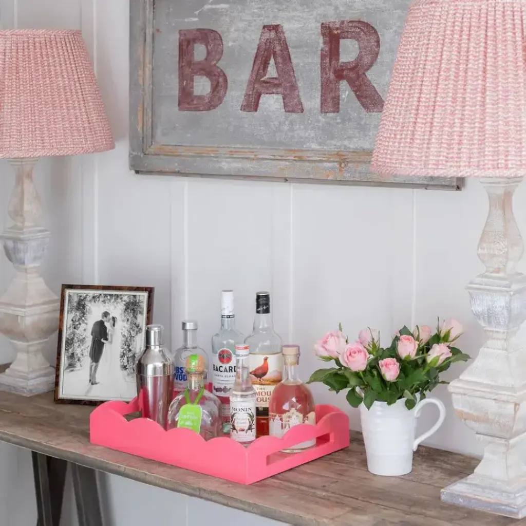 Our Pink Scalloped Straight Sided Ottoman Tray is finished with 20 coats of high gloss lacquer, hand polished between each coat. With extra long handles this tray is a truly stunning addition to any interior.