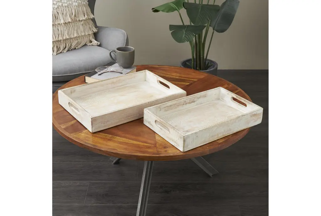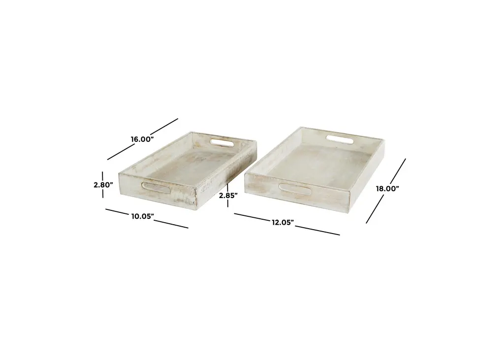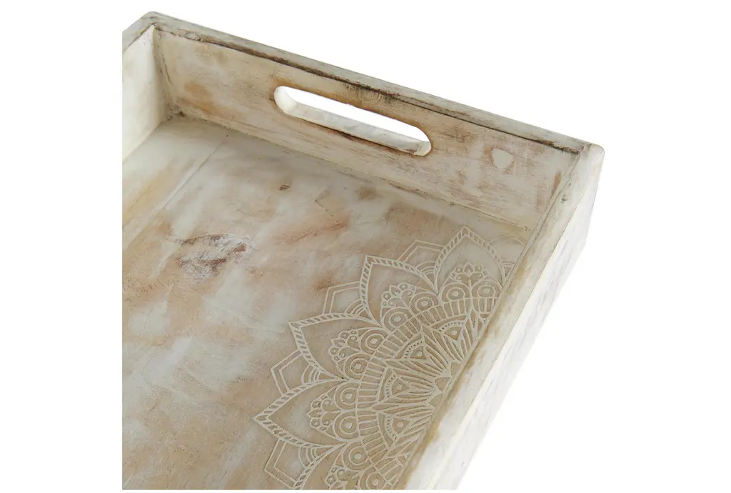 Enhance your kitchen decor with this 18" cream mango wood 2 piece set. Each tray is whitewashed and features a beautifully carved mandala design, adding a touch of artistry to your space. The trays come with convenient handles, making them both functional and stylish.
