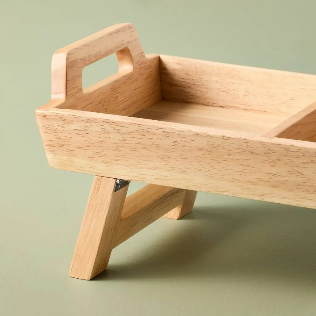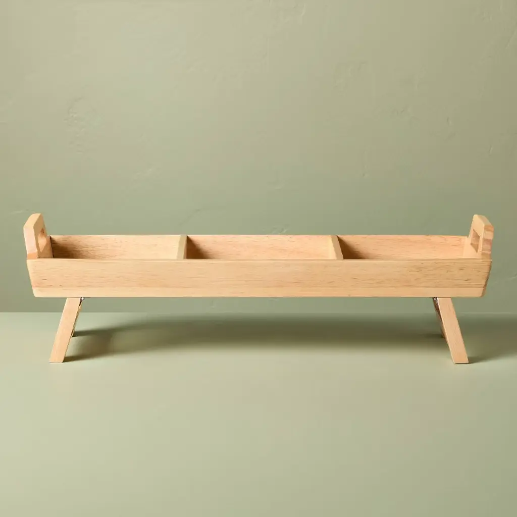 Serve a variety of items in one go with the Foldable Wood Serving Tray from Hearth & Hand™ with Magnolia. This brown serving tray comes with multiple divided compartments to give you ample space for your snacks, cheese and other items. Made of wood, this rectangle tray has folding legs for added convenience. Plus, it comes with side cut-out handles for convenient serving.Hearth & Hand™ with Magnolia: Gather ∙ Create ∙ Enjoy
