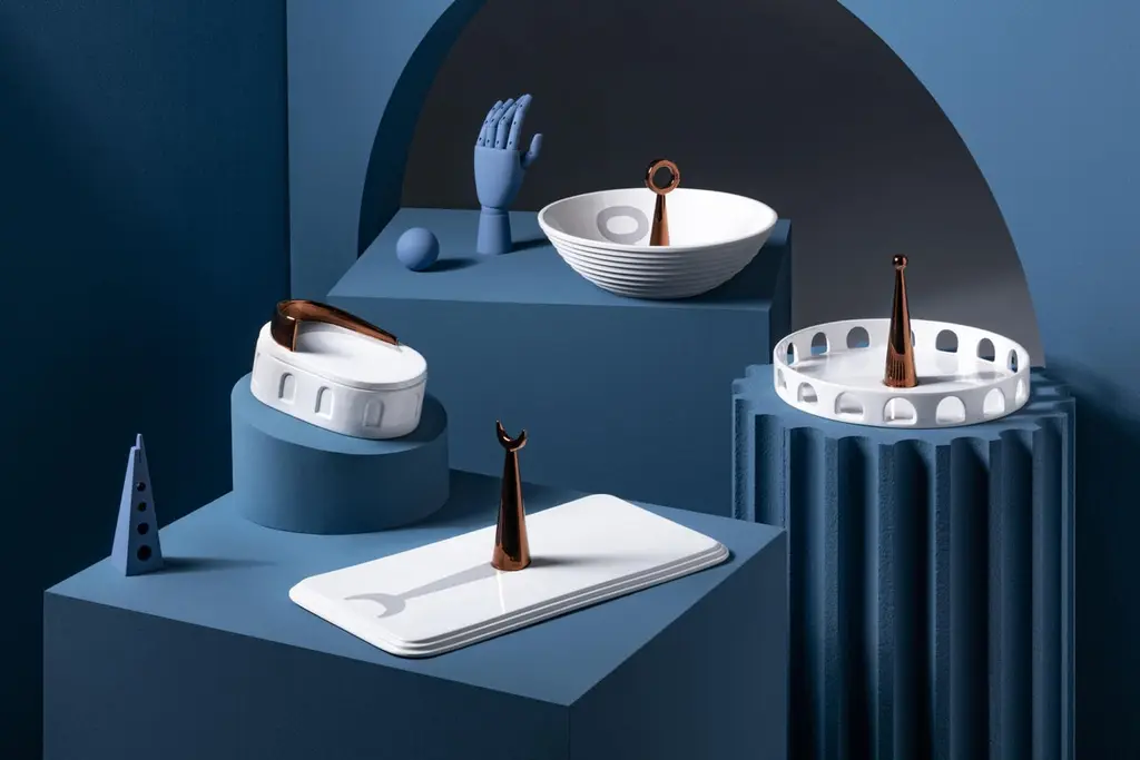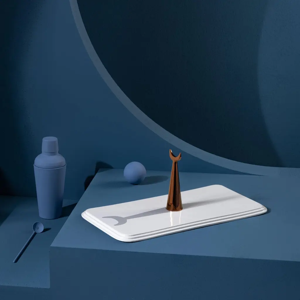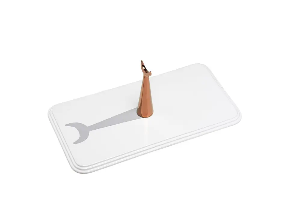 Inspired by the urban element of the ‘piazza’, the white painted ceramic rectangular tray 19:00 from the 'Meridiane' collection is the ideal accessory to serve convivial snacks or to simply decorate a table.Its minimalist yet sophisticated shape is a style statement and gives it a timeless charm that allows it to adapt to different environments. The vertical component, finished with precious copper based paint recalls the recurring decorative element in Italian squares, whether it be a sculpture, an obelisk or a fountain. This gesture is underlined by the painted shadow that stands out unequivocally on the surface of the ‘piazza’ as if it were a sundial and makes this cutting board a unique object of its kind.