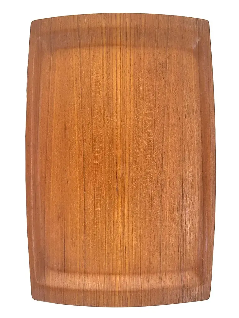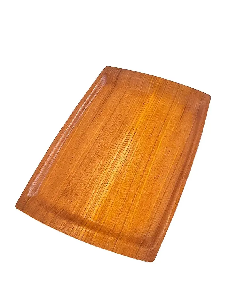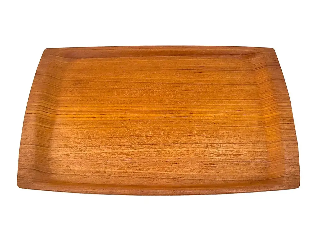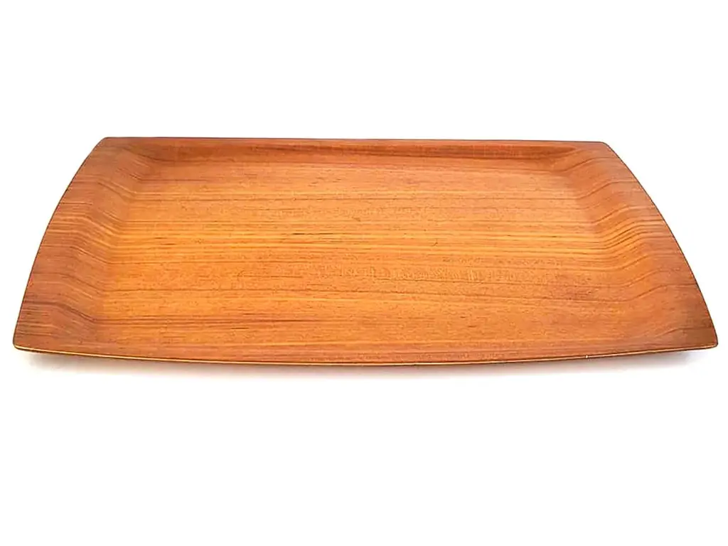 This is a mid 20th Century Teak veneer tray made in Denmark by Langva. It is very sleek and elegant in appearance. The veneer is impermeable to moisture and food stains making it all the more practical for serving beverages and snacks, as well as cleaning the surface and storing away. It measures 20 3/8" x 13 1/8" x 1".