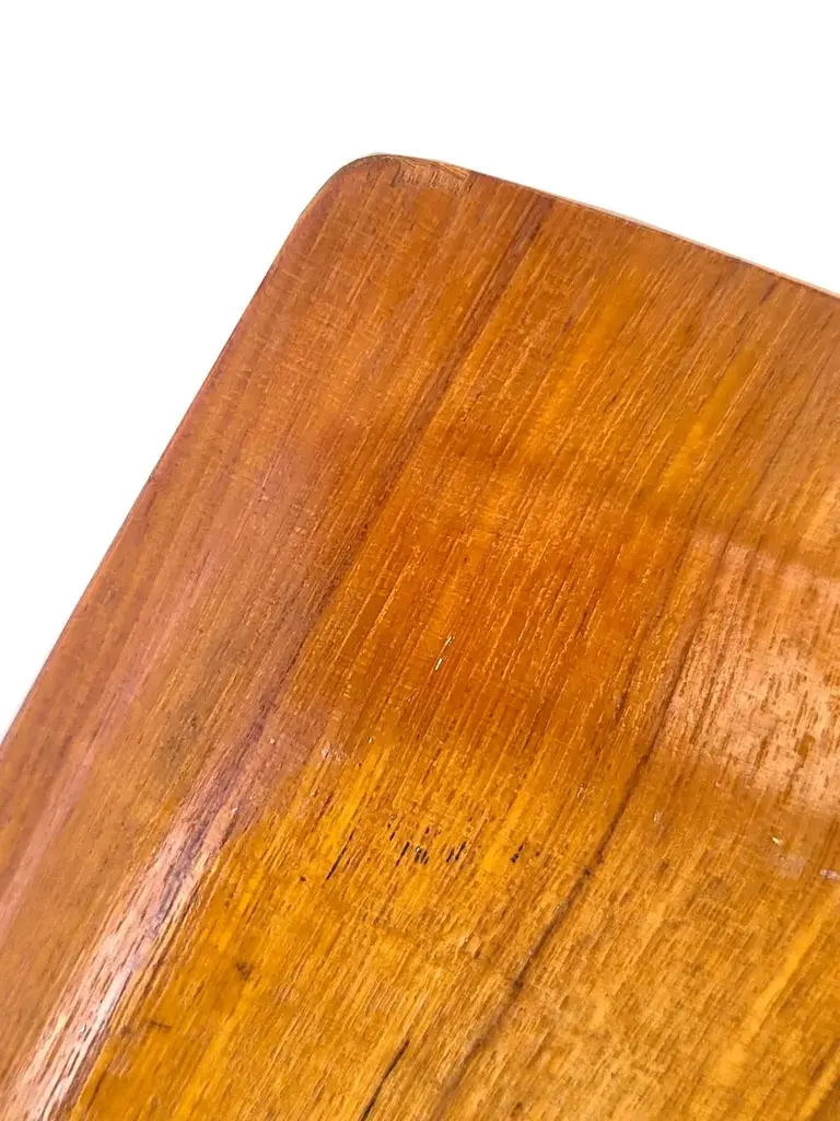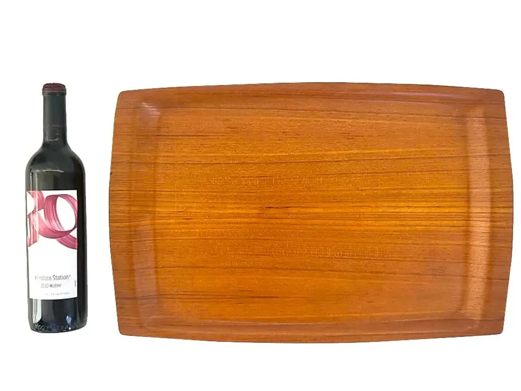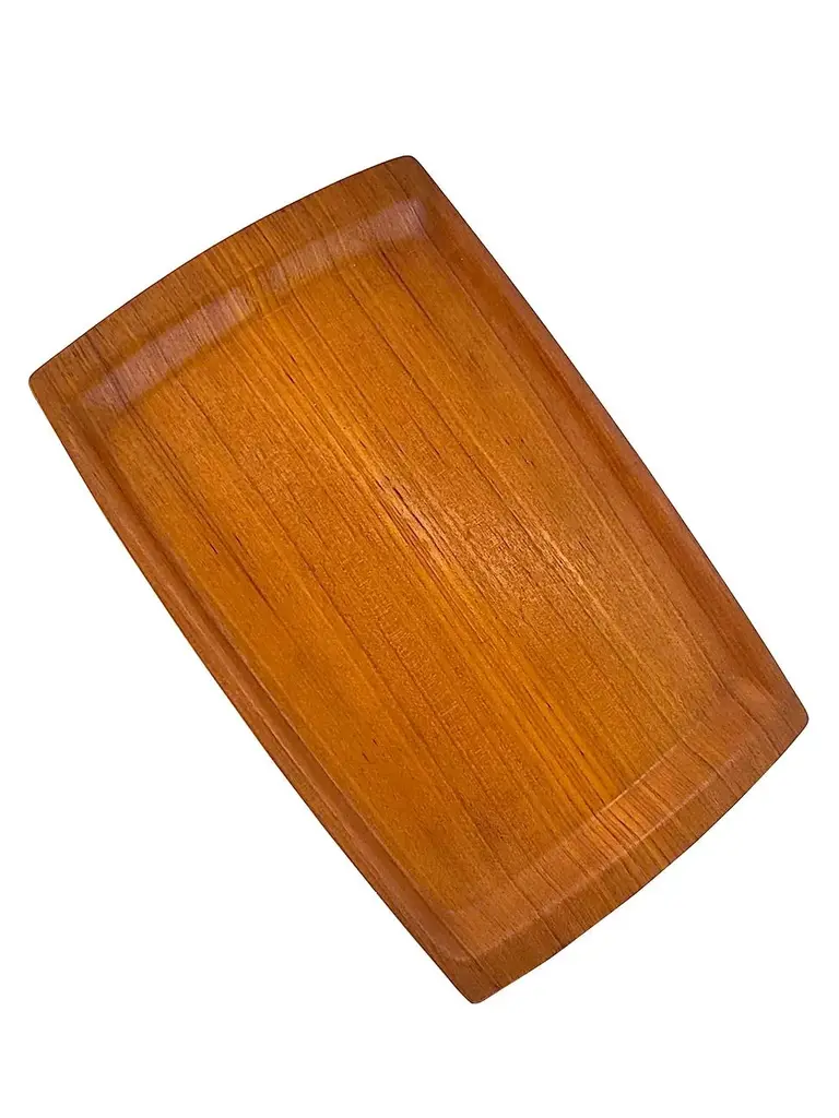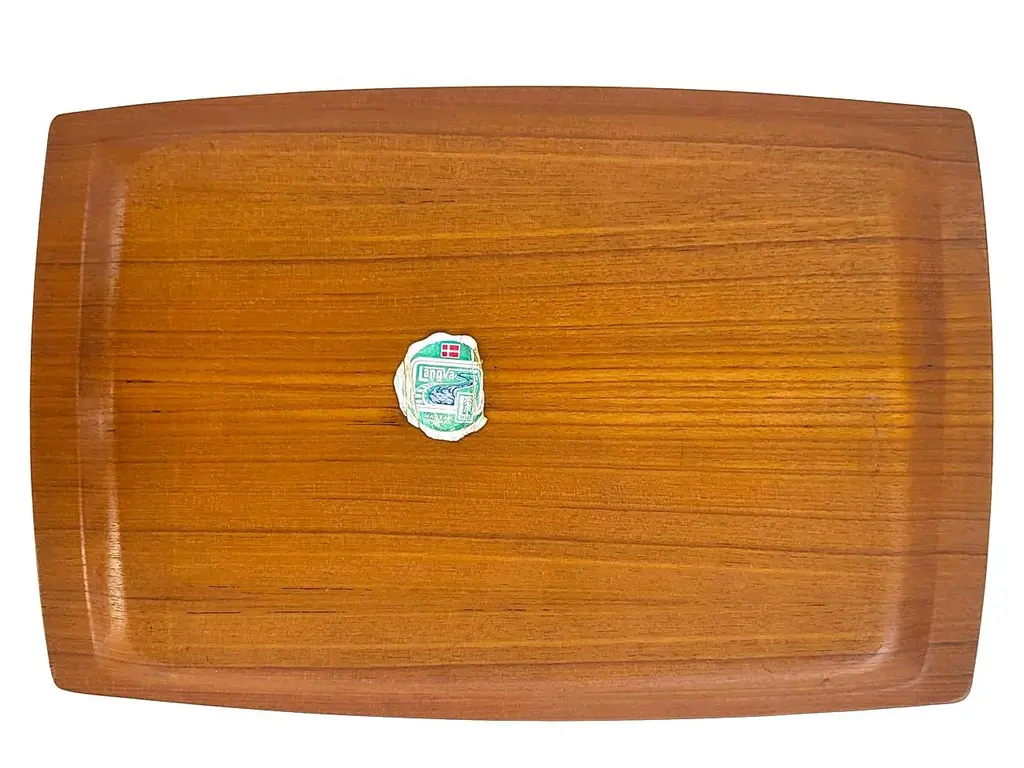 This is a mid 20th Century Teak veneer tray made in Denmark by Langva. It is very sleek and elegant in appearance. The veneer is impermeable to moisture and food stains making it all the more practical for serving beverages and snacks, as well as cleaning the surface and storing away. It measures 20 3/8" x 13 1/8" x 1".