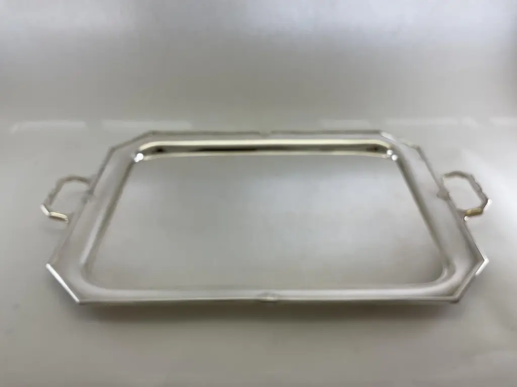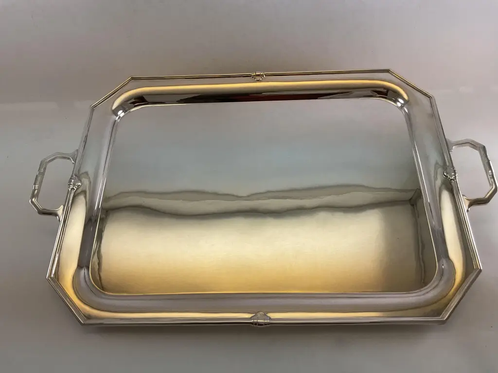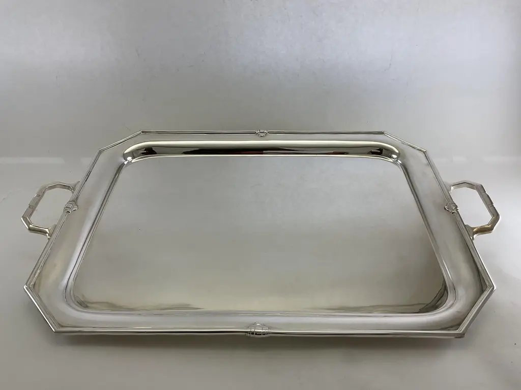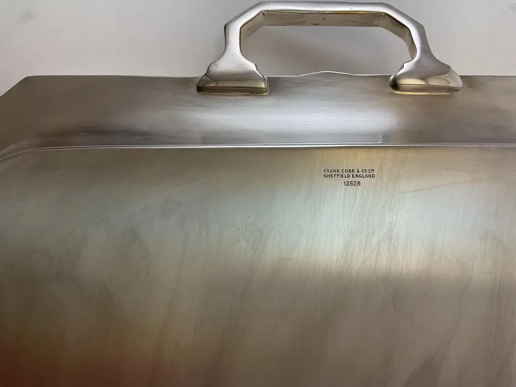 Ref. # FC 12628/22” Photo 429 Description : Silver Art Nouveau Tray with Applied Mount Pattern : Art Nouveau - Size : 22 in. This Exquisite Shape Tray made in Quality Silver-plate made in the UK is ideal for serving Coffee or Tea to your Guests. You may insert an Oval Glass and used it as Cheese Tray. Electro Plated on E.P.N.S. , A 1 a quality silver plated on Nickel Silver Made in England, by Frank Cobb, Marked : Frank Cobb, Sheffield England Retail Price : $ 1,750.00 Wholesale Price : $ 995.00 Quantity Available : 3 Silver is Eternal, the Silver Glow & Patina is agreeable to the Eye. Quality Silver & Sterling Silver are Heirloom, will be Enjoyed & Treasured from Generation to Generation. A 1 is a quality silver plated required by the Consumer Protection Agency in the U.K. A heavy silver deposit Crafted to last for a lifetime everyday use. N.B. Frank Cobb, a distinguished silver company in Sheffield , England; supplier of finest stores in the U.K such as, Mappin & Webb, Garrard's etc... and abroad. Condition :New - Original Factory packing from the 1970's