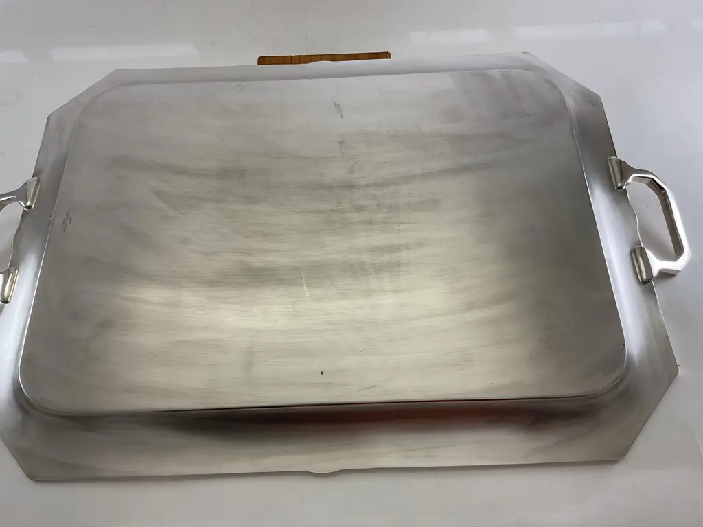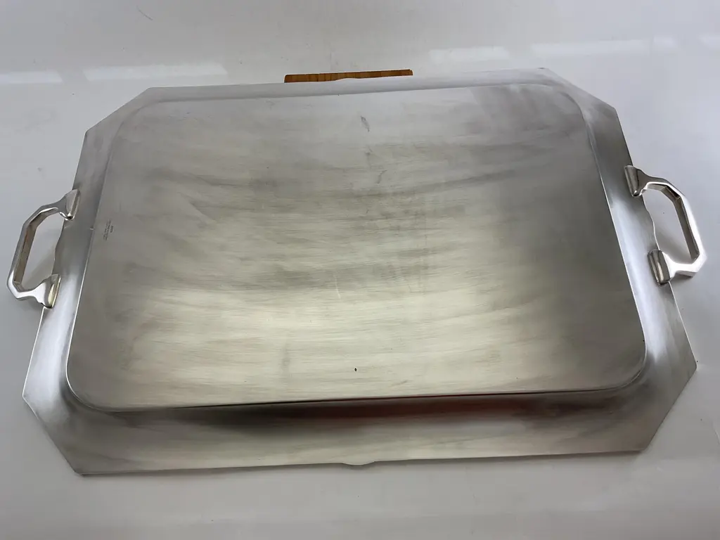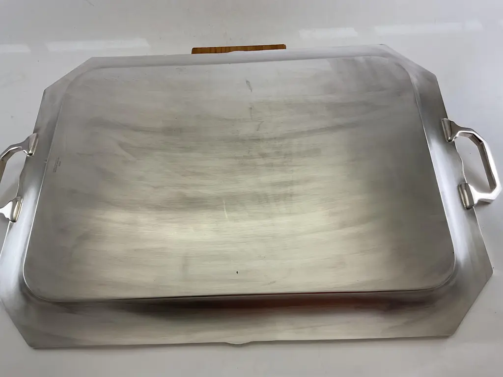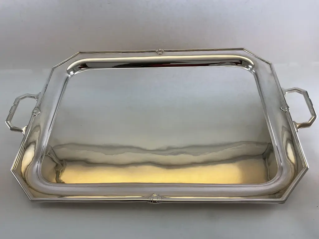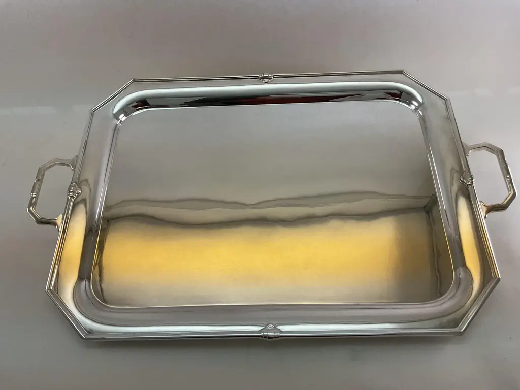 Ref. # FC 12628/22” Photo 429 Description : Silver Art Nouveau Tray with Applied Mount Pattern : Art Nouveau - Size : 22 in. This Exquisite Shape Tray made in Quality Silver-plate made in the UK is ideal for serving Coffee or Tea to your Guests. You may insert an Oval Glass and used it as Cheese Tray. Electro Plated on E.P.N.S. , A 1 a quality silver plated on Nickel Silver Made in England, by Frank Cobb, Marked : Frank Cobb, Sheffield England Retail Price : $ 1,750.00 Wholesale Price : $ 995.00 Quantity Available : 3 Silver is Eternal, the Silver Glow & Patina is agreeable to the Eye. Quality Silver & Sterling Silver are Heirloom, will be Enjoyed & Treasured from Generation to Generation. A 1 is a quality silver plated required by the Consumer Protection Agency in the U.K. A heavy silver deposit Crafted to last for a lifetime everyday use. N.B. Frank Cobb, a distinguished silver company in Sheffield , England; supplier of finest stores in the U.K such as, Mappin & Webb, Garrard's etc... and abroad. Condition :New - Original Factory packing from the 1970's