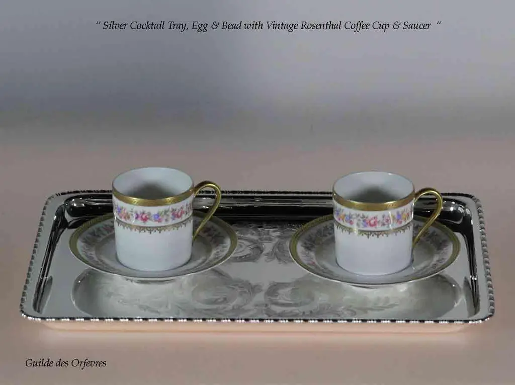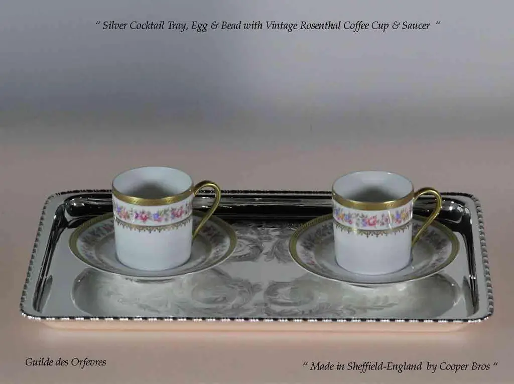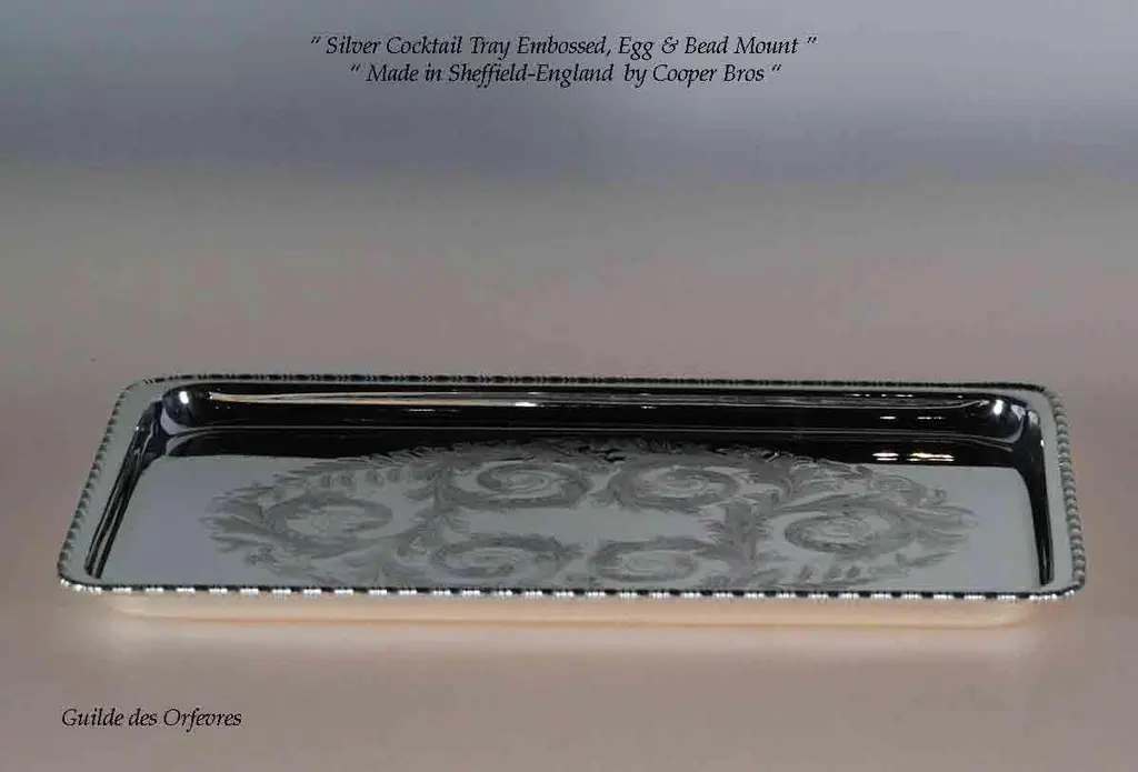 Reference # C 1021 Photo 227 Description: Silver Cocktail Tray, Egg & Bead Border, Embossed Pattern : Egg & Bead, Embossed Size : 11 in. Electro Plated on Copper, a quality silver plated on copper Made in England, by Cooper Brothers in 1970’s-1980’s Marked : Cooper Brothers, Sheffield-England, Silver Plated on Copper Retail Price : $ 280.00 Wholesale : $ 140.00 Quantity Available : 7 Cooper Brothers, a respected silver company in Sheffield-England, supplier of fine stores in the United Kingdom and abroad. Condition : New-Factory Original packing from the 1980's.