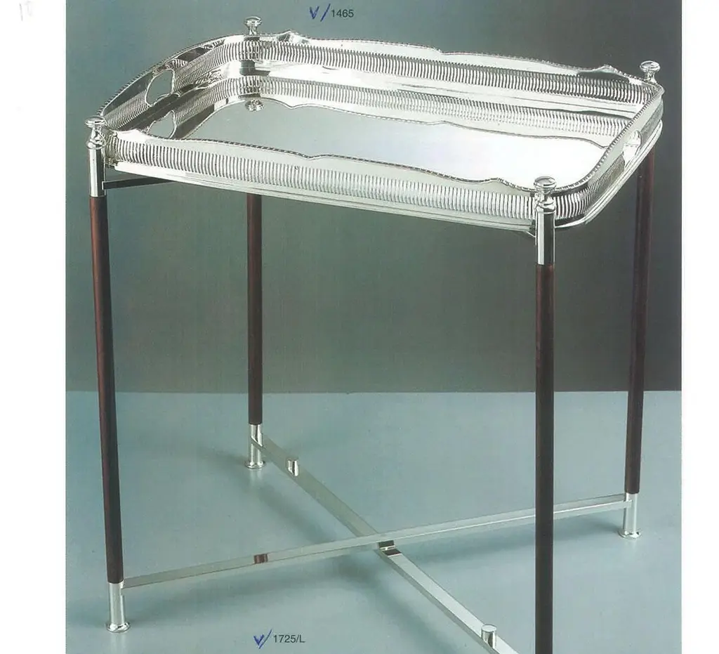 Ref # V/ 1725 L -V/ 1465 Photo 433 "We Take Pride in Offering Exclusive Products, New not Used" "Condition : New Factory Original Packaging" Description : Silver & Wood Collapsible Stand & Tray Pattern : Silver & Wood - Size : 23 in. & 24 x 17 in. Valsodo Collapsible Stand are designed to hold one or two trays, they are very practicable and useful at home, They can serve as a Tea or Coffee Table, a Bar or a serving Station to serve your Guests. Made by Valsodo, Florence-Italy Marked Valsodo -Italy. Retail Price : $ 2,340.00 Wholesale : $ 1,280.00. Quantity Available : 4. Valsodo is a distinguished silver company in Florence, Italy, supplier of Fine Stores in Italy and around the world. The Valsodo Collapsible Stands & Trays were promoted by the Bernardaud on 59th Park Avenue, were advertised in the New York Times,. They were sold in the finest U.S. Stores. Condition : New – Factory original packing of 1990’s. Collapsible Stand or Fold Away Stands & Interchangeable Trays.