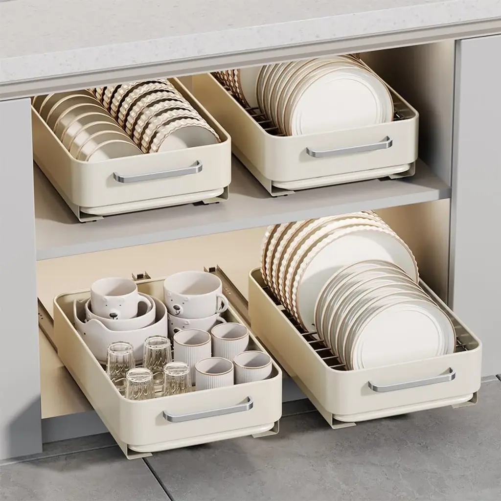 Functional Design: The dish drying rack measures 39 x 25 x 10 cm for different functions, including dish drying, cup drying, and bowl drying. This space-saving dish holder shelf fits neatly inside standard cabinets while keeping countertops clutter-free Durable Metal & Plastic Construction: Made from sturdy stainless steel and high-grade plastic, this slide-out dish rack ensures long-lasting performance in kitchens, pantries, or bathrooms No-Tools, Hassle-Free Installation: Easily set up this pull-out drying rack in seconds using strong self-adhesive tape—no drilling, nailing, or permanent modifications needed Quiet & Smooth Sliding: Engineered with a damping rail system, this drawer-style dish rack glides open and closed silently for a seamless kitchen or bathroom storage solution Spacious Pull-Out Cabinet Drawer: The Aptliton dish drying rack fits up to 12 plates/18 bowls/16 cups, with an integrated drain tray to prevent water from leaking into your kitchen or bathroom cabinet