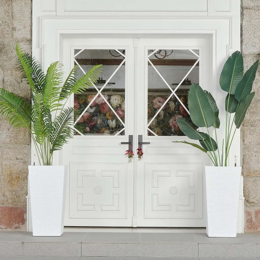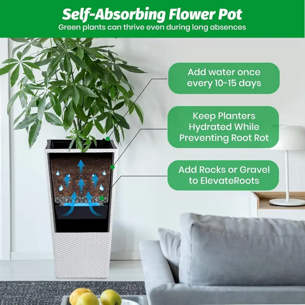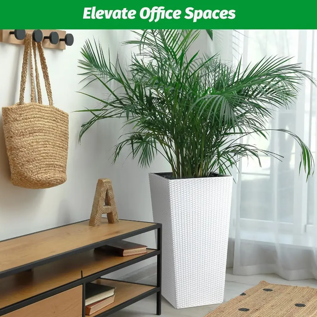 Enhance your space with this 30-inch tall rattan planter set, featuring a stylish design and a self-watering system that keeps plants thriving effortlessly. Perfect for indoor or outdoor use, these large planters blend functionality with modern aesthetics for any front porch or garden. Specification:Size: 30 inches Color: black / white / brownMaterial: plastic Highlights at a glance:Self-watering system provides optimal moisture automatically with up to two weeks of watering saved.Water level monitor enables easy tracking of your plants' growing environment without constant checking.Drainage holes and a bottom reservoir promote excellent drainage, reducing the risk of root rot.Proper airflow prevents unpleasant odors.Inner bucket with handles simplifies filling and maintenance, making gardening a breeze.Mobility is easy with the four sturdy wheels. Modern rettan tapered design makes it suitable for porch, balcony, living room, home office and more.Premium plastic material is suitable for all seasons. Friendly note:Include only the planter; plants are not included.Ensure that the drainage holes are not obstructed to prevent waterlogging. Packing list:Rattan planter x2Assembly guide x1