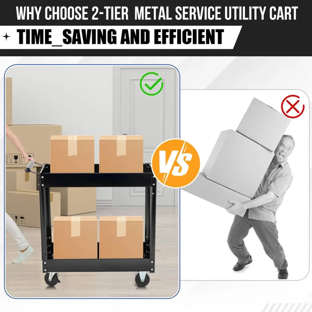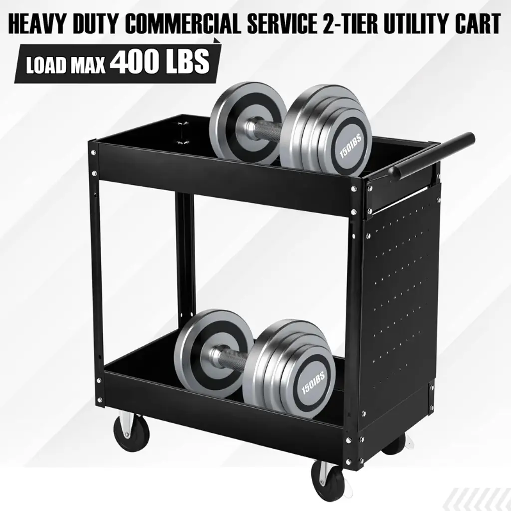 Heavy-Duty Utility Cart - 400LB Capacity 2-Tier Rolling Service Cart with Locking CastersDesigned for workshops, garages, and industrial spaces, this 2-tier rolling utility cart blends uncompromising strength, smart storage, and smooth mobility to streamline heavy-duty tasks. Its 400lb capacity, industrial steel build, and all-terrain casters make it a reliable workhorse for hauling tools, parts, or equipment—while thoughtful details like raised safety edges and an ergonomic height reduce strain and enhance efficiency.1. Industrial-Strength Steel Construction: 400LB Capacity for Demanding UseBuilt to withstand daily abuse in tough environments, the cart features a commercial-grade 1.2mm thick steel tubing frame with reinforced cross-bracing—eliminating flexing even when loaded to its full 400lb capacity. Key durability features include:Powder-coated finish: Resists rust, scratches, and chemical corrosion (from oils, solvents, or cleaning agents common in garages/workshops), ensuring the cart stays functional for years.Reinforced mesh shelves: The steel mesh flooring is sturdy enough to hold heavy tools (e.g., power drills, wrenches, or toolboxes) while allowing debris, dust, or spills to drain through—no more trapped dirt or standing liquid.Unlike flimsy plastic or lightweight metal carts that warp under pressure, this steel construction handles the heaviest loads with confidence, making it ideal for professional mechanics, DIY enthusiasts, or industrial workers.2. Optimized Two-Tier Storage System: Secure, Spacious, and AccessibleThe cart’s two-tier design maximizes storage while keeping items safe and easy to reach:Spacious work surfaces: Each shelf measures 29.14"L x 15.16"W—roomy enough for large tool sets, parts bins, or even small equipment (e.g., a portable air compressor).1.5" raised safety edges: All sides of the shelves have raised lips to prevent tools, bolts, or small parts from sliding off during transport—critical for moving items across uneven floors.3.74" deep containment: The deep shelves hold bulkier items (e.g., cans of motor oil, stacks of rags) without risk of tipping, eliminating messy spills or lost parts.The weight-distributed design ensures loads are evenly supported across both tiers, so you can safely stack heavy items without overloading a single shelf.3. Professional-Grade Mobility System: Smooth, Stable, All-TerrainManeuvering heavy loads across any surface is effortless, thanks to a high-performance caster system:4" diameter dual-wheel polyurethane casters: Roll smoothly on concrete, gravel, grass, or workshop floors—no getting stuck on rough terrain or debris. The polyurethane material is durable yet gentle, protecting hardwood or tile floors if used indoors.Two locking brakes: Secure the cart in place during use (e.g., while using tools or loading/unloading) to prevent accidental rolling—even on sloped garage floors.Quiet operation: The casters’ treads reduce noise, making the cart suitable for indoor spaces (e.g., auto repair shops with customers nearby) without causing disruptions.250-lb rating per caster: Each wheel supports far more weight than the cart’s total capacity, ensuring long-term reliability under heavy use.4. Ergonomic Workspace Design: Reduce Strain, Enhance ComfortEvery detail of the cart’s design prioritizes user comfort, even during prolonged use:32.09" working height: Aligns with average waist height, reducing bending and back strain when reaching for tools or loading items—critical for professionals who use the cart for hours at a time.Textured handle grip: Provides a secure hold, even when hands are greasy or sweaty (common in garages), preventing slips and improving control.Open-frame design: Lets you access tools from all sides, no need to reach over or around the cart—saving time and frustration.Neutral gray finish: Hides grease, stains, and minor scuffs, keeping the cart looking clean and professional without frequent cleaning.5. Quick-Tool Assembly System: Ready to Use in 15 MinutesSetting up the cart is fast and frustration-free, even for first-time assemblers:Pre-drilled components & color-coded hardware: No guessing which parts go where—color-coding ensures easy alignment, and pre-drilled holes eliminate the need for measuring.All tools included: No need to hunt for extra wrenches or screwdrivers—everything required for assembly is in the box.Detailed visual instructions: Step-by-step diagrams (no confusing text) guide you through each step, with an estimated assembly time of just 15 minutes.Lifetime warranty on frame: Backed by a lifetime warranty, giving you confidence in the cart’s durability and the manufacturer’s support.