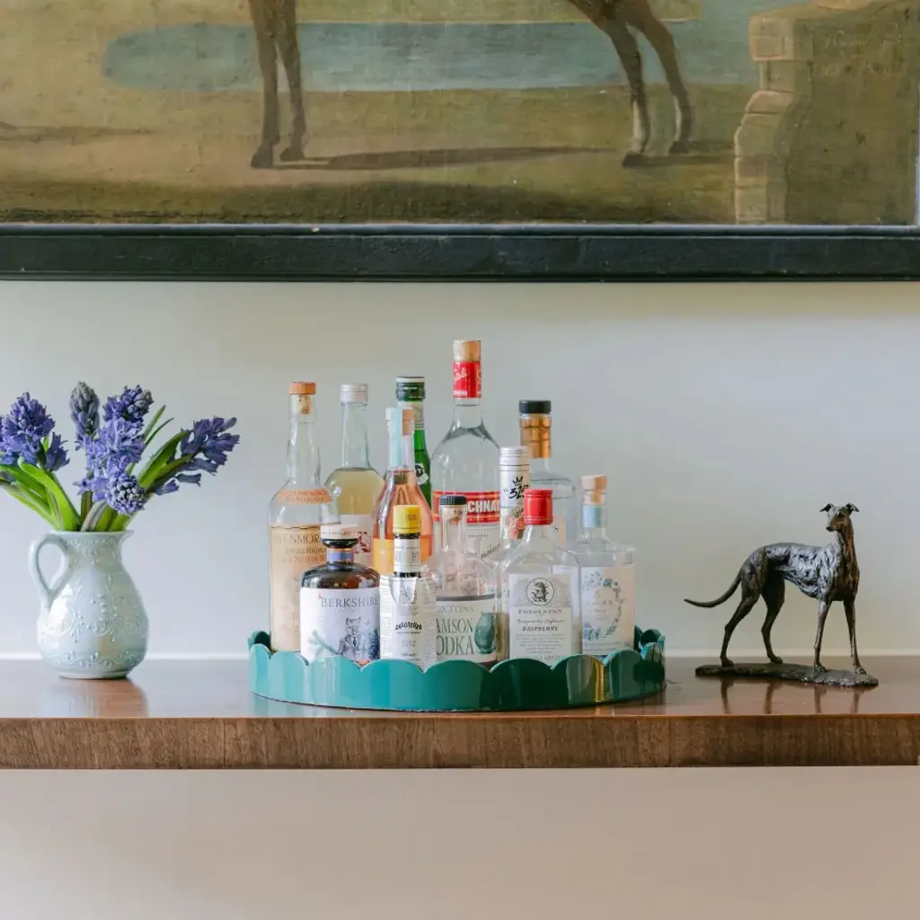 Our Round Racing Green Large Scalloped Tray is finished with 20 coats of high gloss lacquer, hand polished between each coat, this lovely tray is.