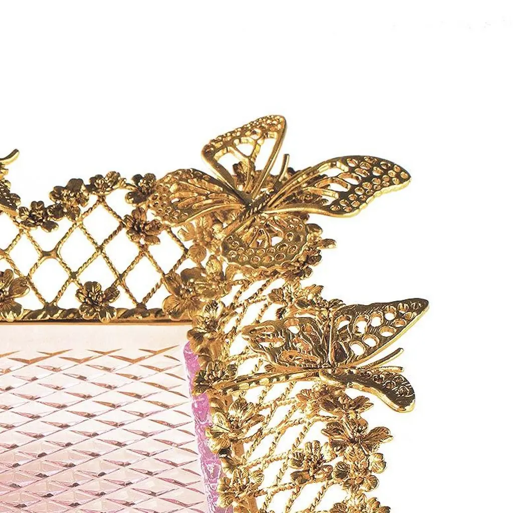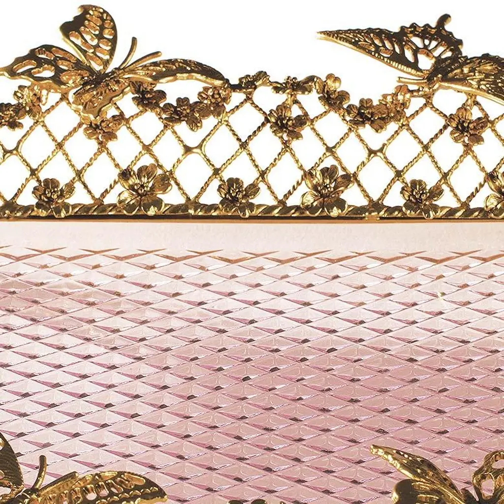 21-st century hand carved pink crystal tray with frame in lost wax golden bronze butterflies.This tray has got a particular hand -carved and the frame is in lost wax golden bronze. Each object is handcrafted and the care for every detail makes each item unique in its kind. On request to customer can modificate the color of crystal: clear, amber, amethist etc... and we can change also the metal finishing: French gold, burnished, dark burnished, antique silver so you can match it with any decor. The style of this tray is classic and can be inserted in the best possible way within every furniture.Also Oggetti d'Arte will follow with the same passion the request of the most qualified studies of interior architecture from around the world, helping them in achievement of their most ambitious projects. The size of this centrepiece are: diam. 34 x 26 x h7cm.