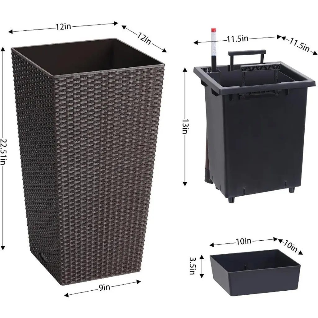 22.4” Tall Rattan Planter Set Of 2 With Water Level Monitor, Wheels, And Trays For Indoor/outdoor Use, Brown