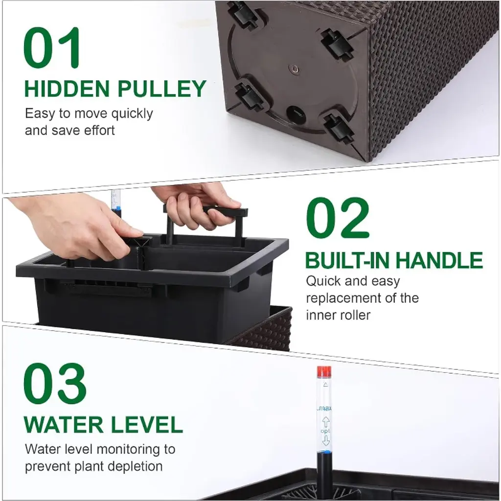 This set includes two rattan 22.5-inch planters for outdoor plants, each with its own tray and a convenient water level monitor. This monitor allows you to easily track moisture levels, potentially saving you up to two weeks of watering by indicating when it's time to refill