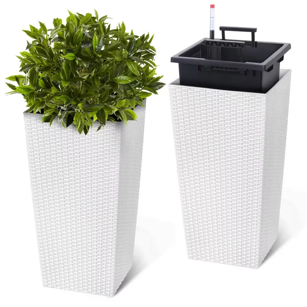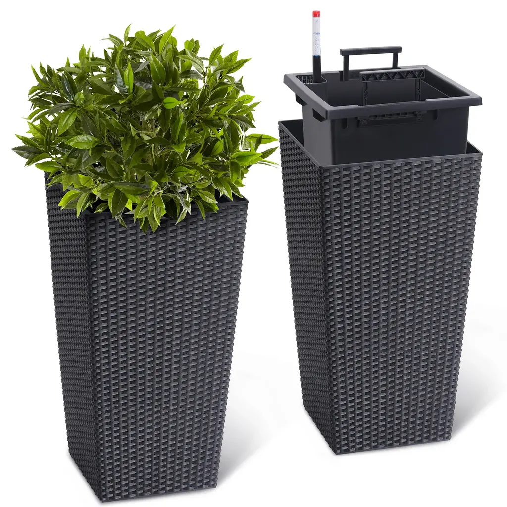 This set includes two rattan 22.5-inch planters for outdoor plants, each with its own tray and a convenient water level monitor. This monitor allows you to easily track moisture levels, potentially saving you up to two weeks of watering by indicating when it's time to refill