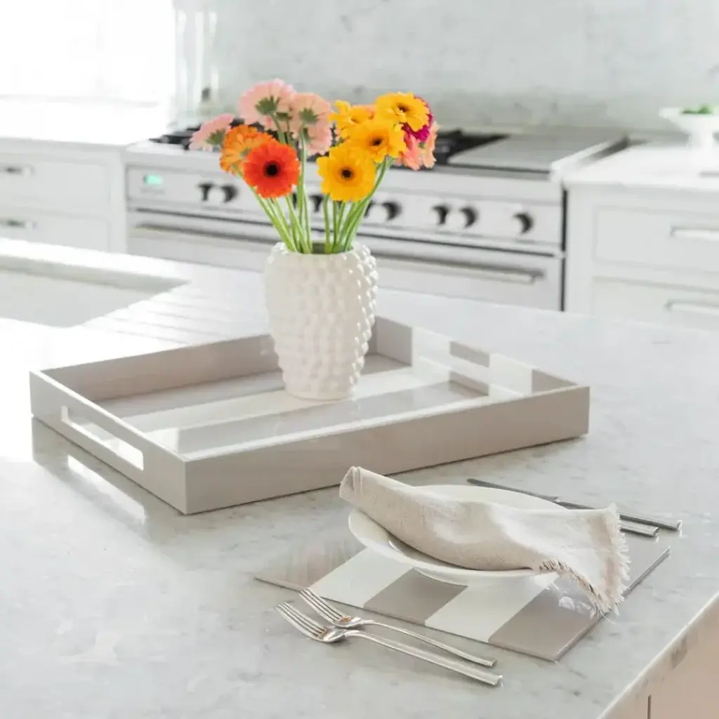 Our Striped Chiffon Grey Tray features 20 coats of high gloss lacquer, hand painted and polished between in each coat. The base is covered in soft cream velvet with our logo.