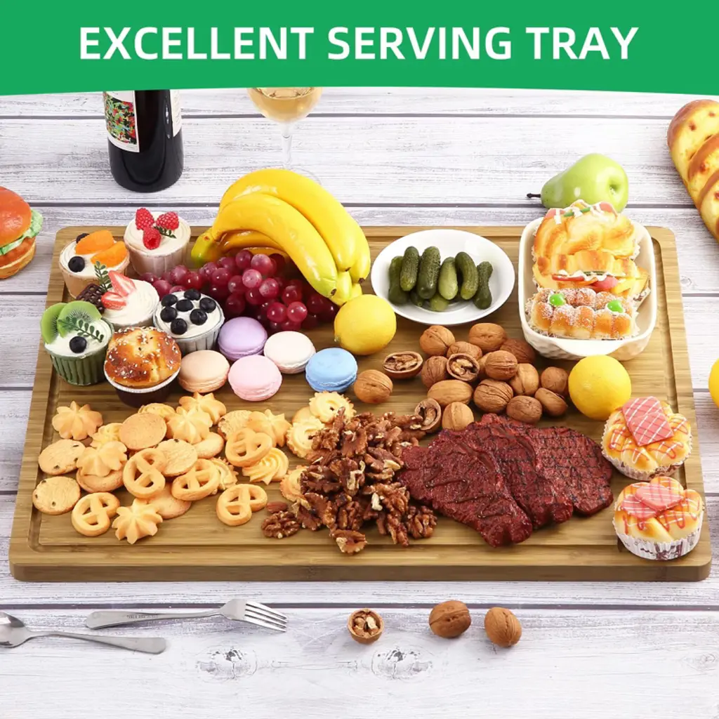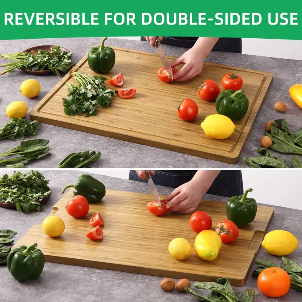 24x18 inch bamboo cutting board provides an ample and versatile surface perfect for all your kitchen prep¡ªfrom carving turkeys and chopping vegetables to kneading dough. It also serves elegantly as a cheese or charcuterie platter, or doubles as extra countertop space over stoves or islands. Crafted from high-quality, warp-resistant bamboo, it combines durability with natural beauty. The deep juice grooves effectively trap liquids, keeping your workspace clean and easy to maintain. Convenient built-in side handles make transferring and serving effortless, while the reversible design allows you to separate raw and cooked food prep, enhancing safety and convenience. Dimensions: Length: 24 inches Width: 18 inches Thickness: Approximately 0.75 to 1 inch Material: Premium durable bamboo Features: Deep juice groove, built-in handles, reversible surface What You Get: 1 Large Bamboo Cutting Board with juice groove, handles, and reversible design After-Sales Service: We provide detailed care instructions and responsive customer support to ensure your cutting board maintains its durability and elegance for years to come.