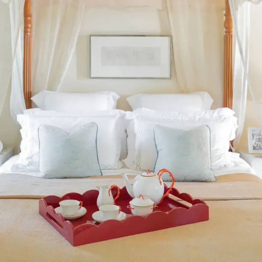 Our Burgundy Scalloped Straight Sided Ottoman Tray is finished with 20 coats of high gloss lacquer, hand polished between each coat. With extra long handles this tray is a truly stunning addition to any interior.