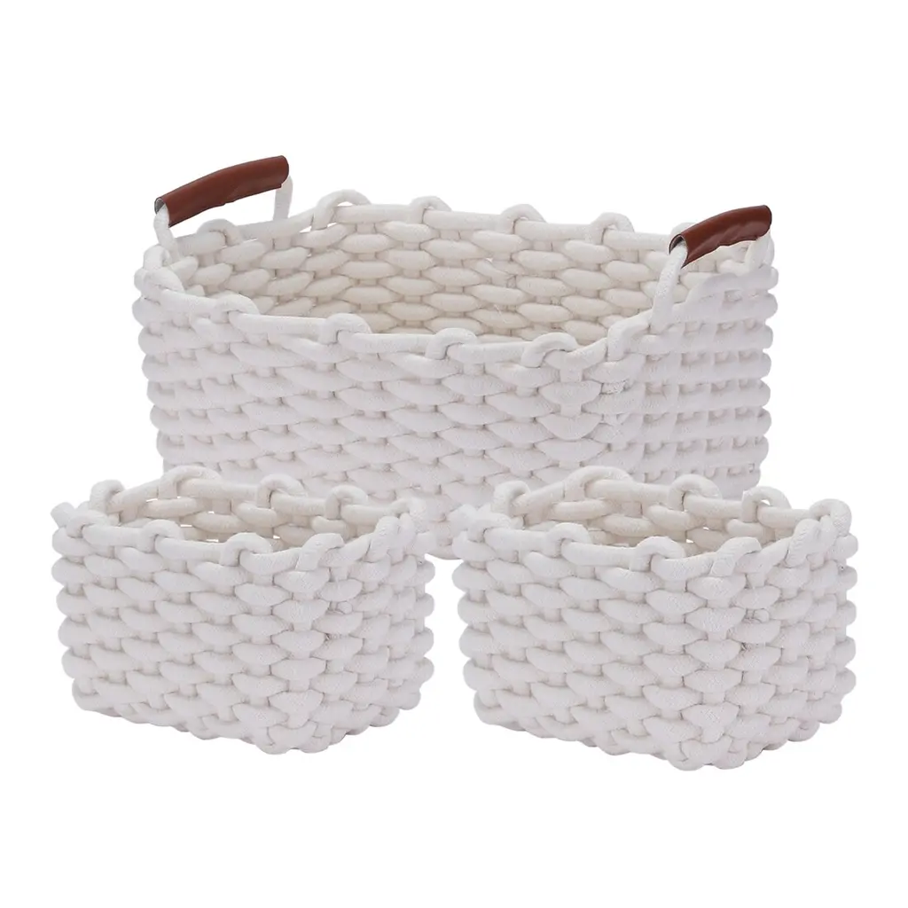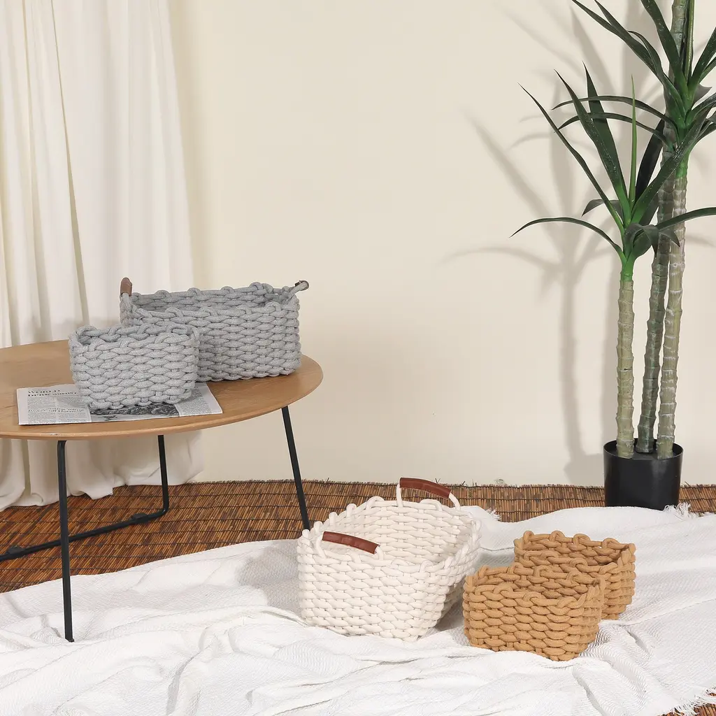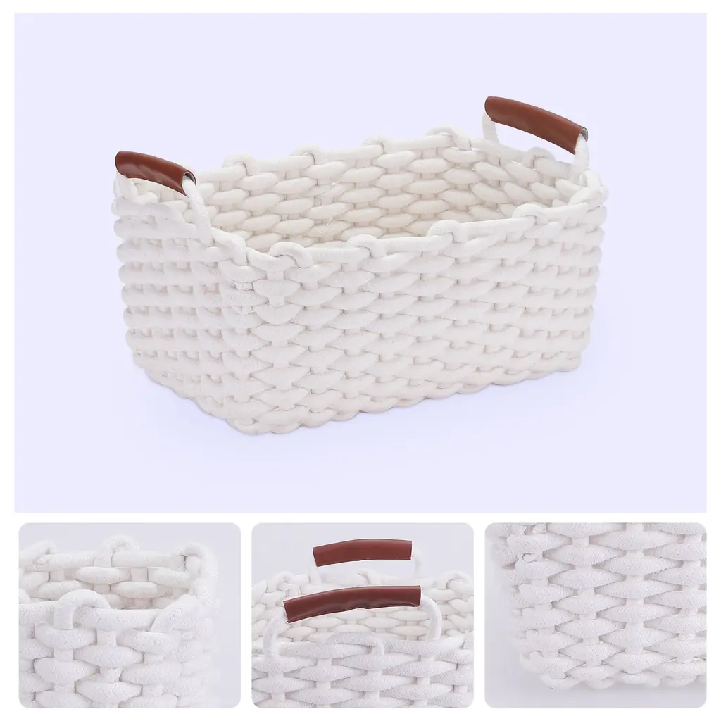 Premium Material: Our small storage basket is meticulously handcrafted from odorless cotton rope. They are designed with no sharp corners. The chic appearance make these baskets a fashionable and functional addition to any decorEasy Shaping: Upon receiving your rope basket, please remove it from the packaging and fill it with items such as clothes or dolls to help it regain its shape. For quicker shaping, consider using a steam ironCompact Size: Our rectangular closet small woven basket for organizing intimate clothing, books, towels, cosmetics, snacks, and other small items, and key bowl for entryway tableGreat Gift: This basket storage perfect size to fit everything and very aesthetic. Worked perfectly for making a get-well basket for a friend. Our woven storage basket is a ideal gift for Easter, Christmas, Thanksgiving, Mother's Day, Father's Day, Valentine's Day, or girl's birthdayMultiple Use: This organization basket is great for putting blankets, shoes, clothes, towels, decorative pillows, hats, scarves, magazines, headset wire, remote control, magnetic card, keys, note storage, vegetables, fruits, CD, flowers and more home supplies by the front door. Fits on a bedside table, closet shelf, bookshelf, desk, floor, etcOur basket for bathroom, and designed with jute string and portable handles on the base. Minimalistic combined with a rustic style makes the whole flower basket simple and elegant. Handles design, easy to move and take away, free awesome practical adorable jute storage bin for daily use.These cotton rope baskets are designed to fit perfectly on shelves, closets, and even under beds, making them an ideal solution for organizing your home or office.