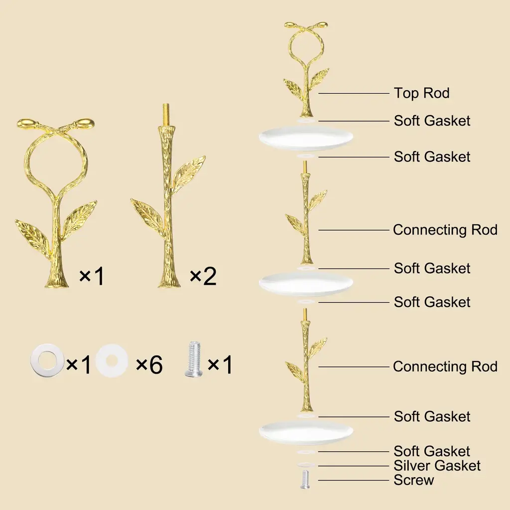 Description:Zinc Alloy Material: Made of good hardness zinc alloy material, this cake plate stand handle is sturdy and durable to use, strong enough to ensure the stand's stability, and also adds a touch of sophistication to the presentation of your dessertsSophisticated Appearance: The stand's tiered design allows you to work with ceramic, glass, or various styles of plates for the display cakes, cupcakes, or fruit, and the vine pattern design adds a decorative detail that complements the elegance of the eventEasy to Use: The stand is easy to use and move, place the bottom tier of the cake or dessert on the top of the stand and secure it with the supplied fixing kit, ensuring each tier is properly balancedWide Application: The cake stand handle is suitable for various occasions, such as home baking, party decoration, banquets, wedding receptions, birthday parties, tea parties, etc., and other activities, and can also be used in bakeries or cafes for displaying pastriesNote: Please note that this product does not include the plateSpecification:Material: Zinc AlloyConnecting Rod Length: 12 cm/4.7 inchTop Rod Length: 10.8 cm/4.3 inchTotal Width: 53 mm/2.1 inchScrew Size: M6*1Package Content:1 Set x Cake Tray Stand Handle with Mounting Parts