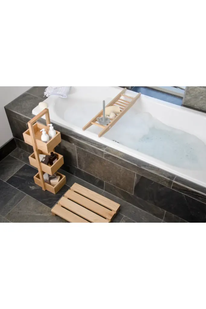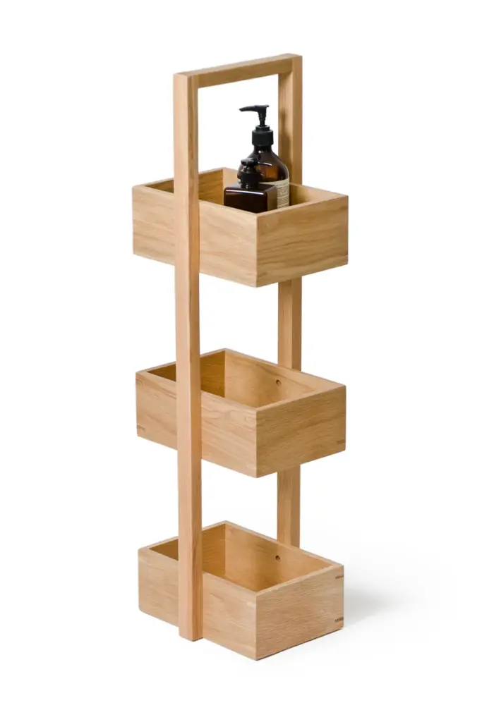 Three deep trays can be used for storing and organizing toiletries, lotions and brushes. Keep everything together in one place. The caddy is portable and will slot into those under used places around the bath, shower or sink. Take straight from the box and use - no assembly required. Made from sustainably harvested natural American white oak and oak veneers, selected for their warm color, beautiful grain pattern and traditional hardwood durability. All edges look crisp but are carefully hand sanded to make them soft to the touch. Finished with a matt, water-resistant lacquer. Silicone feet stop it slipping. Design by Lincoln Rivers.