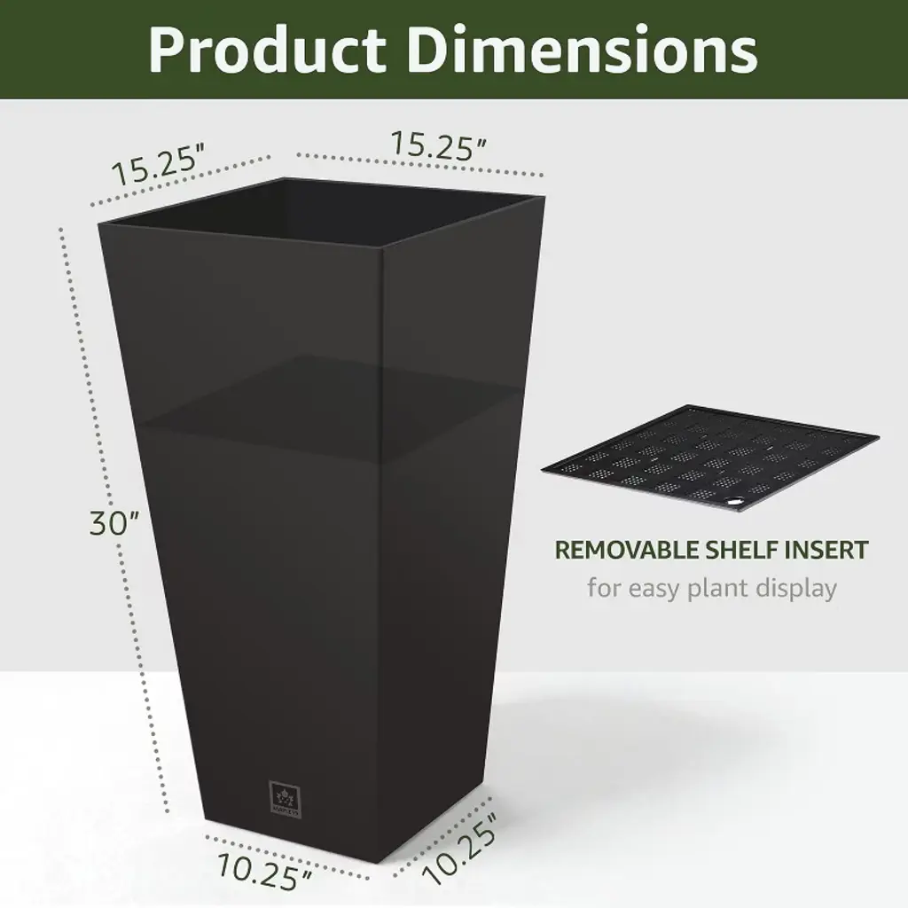 Upgrade your indoor and outdoor spaces with this 30-inch tall planter, crafted from premium resin plastic-stone composite for long-lasting durability. Resistant to cracks, scratches, fading, and UV damage, this large planter withstands rain, sun, and snow, making it perfect for year-round use. Designed with drainage holes, removable plugs, and a soil insert tray, it promotes healthy root growth and prevents overwatering. The modern tapered design with a hand-polished finish adds a sleek, contemporary touch to patios, porches, entryways, living rooms, and offices. Spacious and versatile, this tall planter is ideal for showcasing palms, ferns, flowers, or privacy greenery. Lightweight yet sturdy, it is easy to move while remaining stable against wind and weather, combining elegance, practicality, and resilience in one stylish planter.
